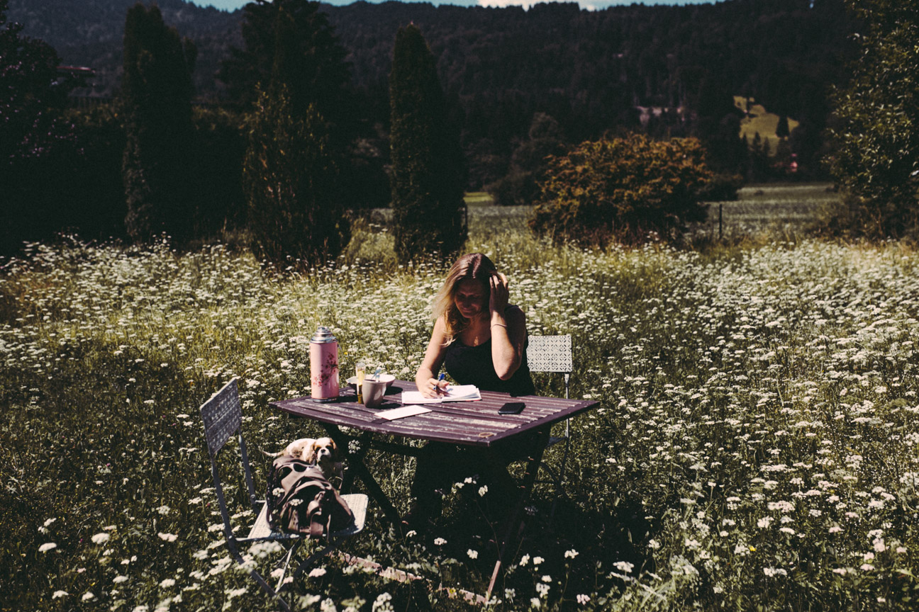 Sie schrieb und schrieb und schrieb, ließ sich inmitten der hohen Gräser, zirpenden Grillen und singenden Vögel nicht ablenken.