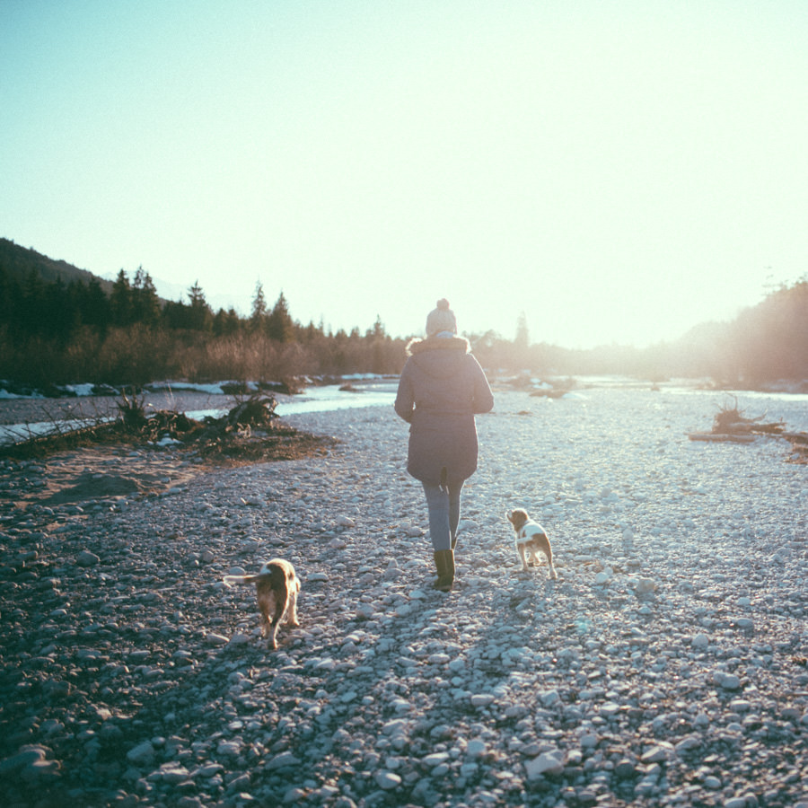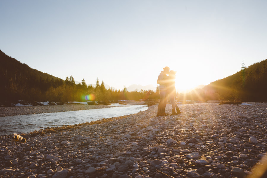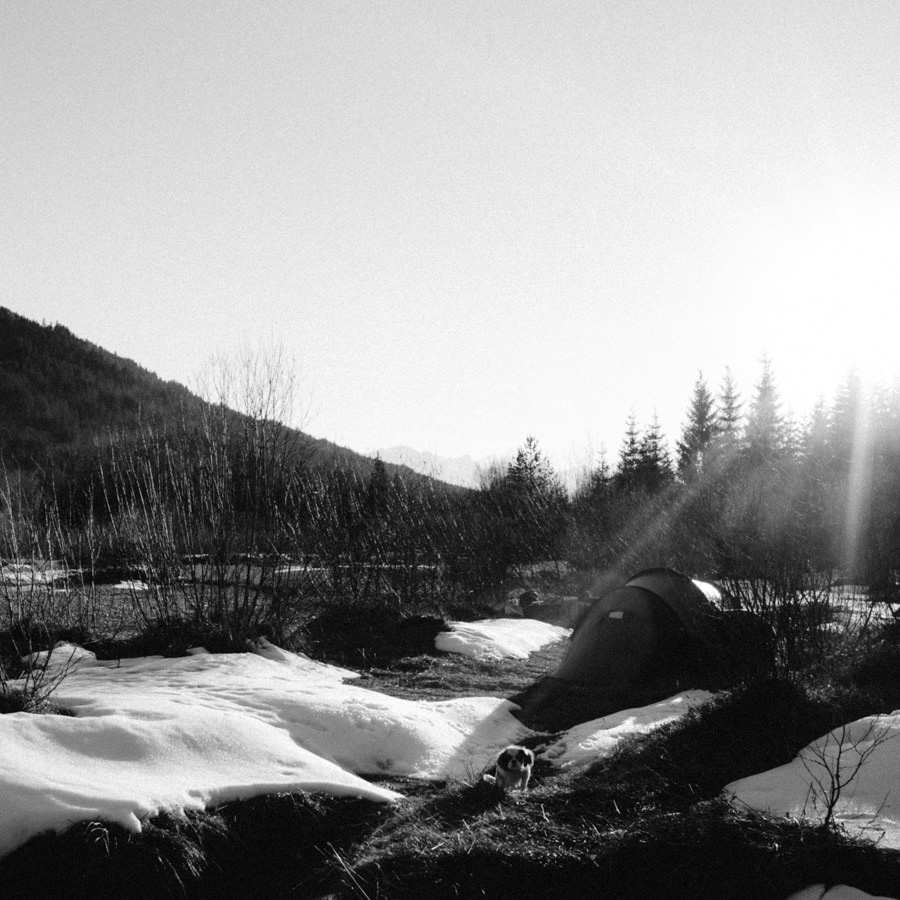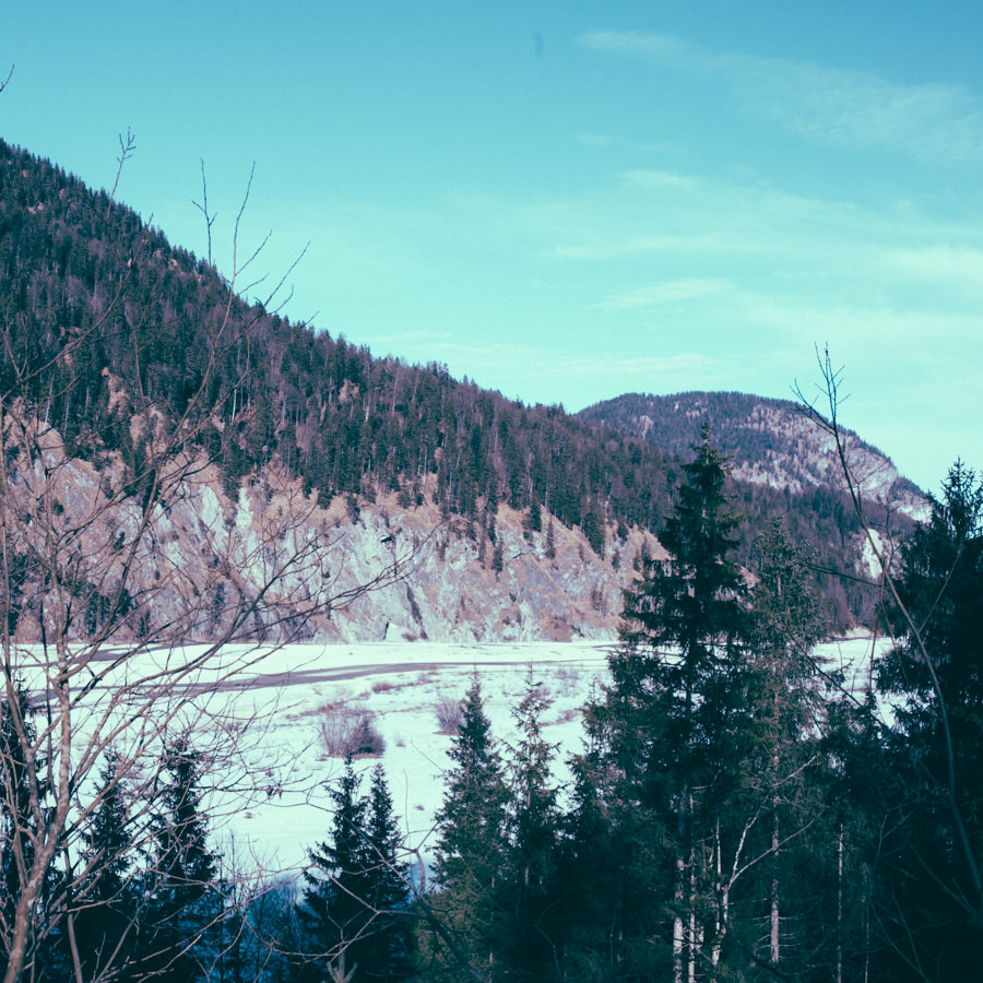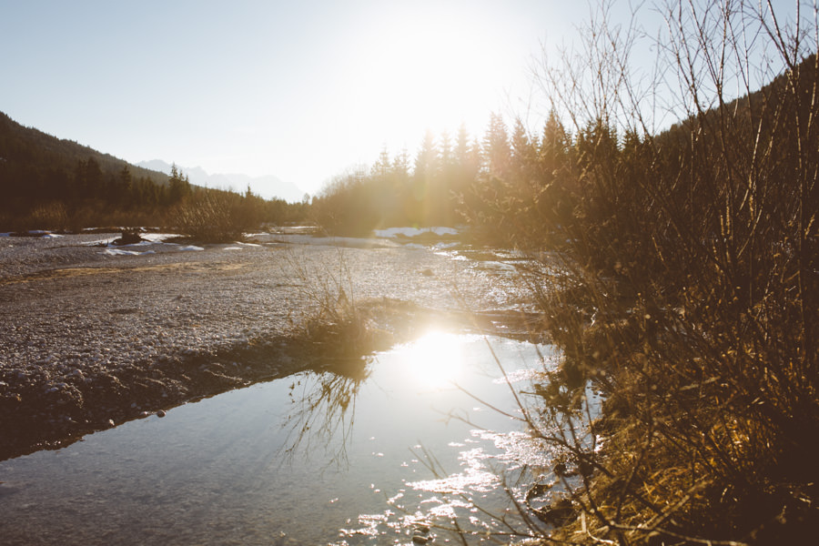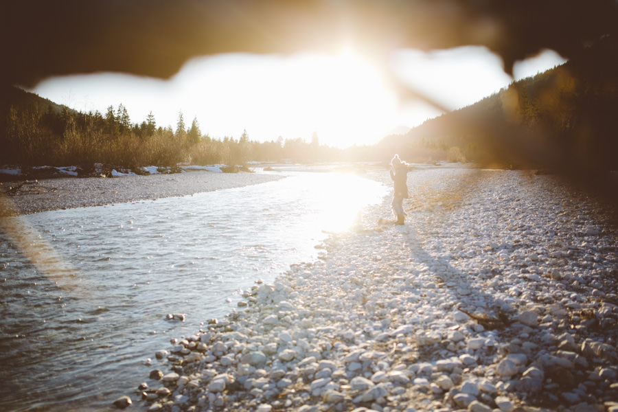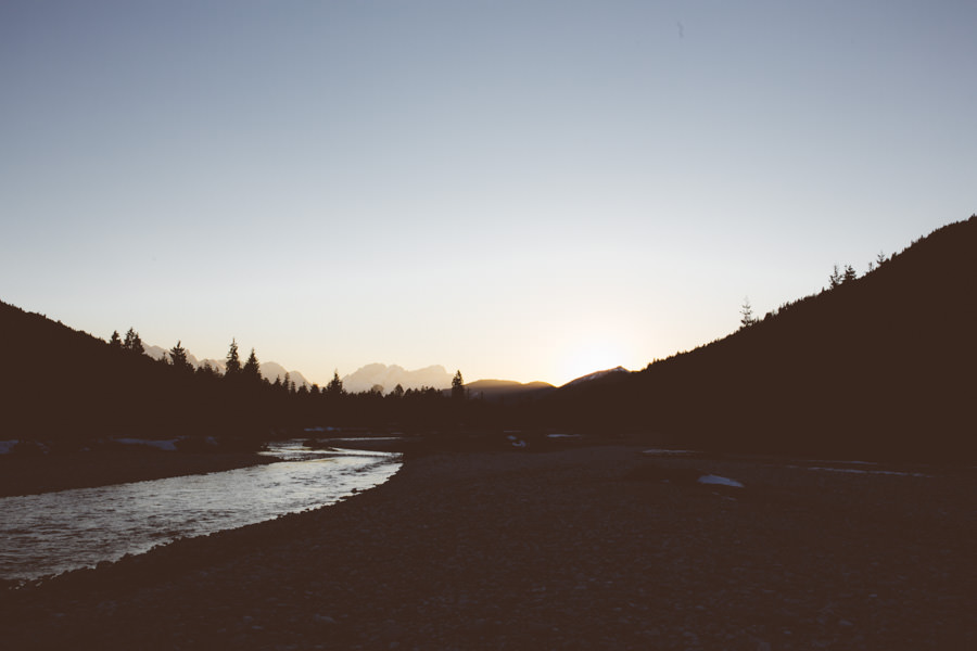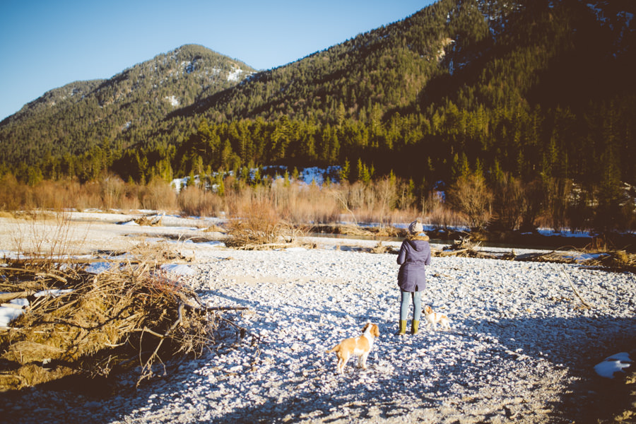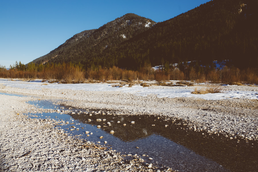 Unsere neue Ausrüstung die seit Sommer in Tüten verpackt darauf wartet endlich dafür gebraucht zu werden, schreite förmlich danach dieses Abenteuer zu wiederholen. Eine Nacht in den Bergen am Fluss, diesmal mit Zelt, denn der Wetterbericht sagte Schnee voraus… Mit einer Tüte feiner Salate, Zeitschriften, zwei großen Termoskannen voller heißem Lieblingstee, Skiunterwäsche, dicken Socken, Pullis und einer Taschenlampe zogen wir ende Februar mit dem Auto in Richtung Silvensteinspeicher los. Den Speicher und die Isar entlang in Richtung Österreich, auf die Mautstraße nach Vorderriss. Auf der linken Straßenseite eröffnet sich eine wunderschöne Landschaft durch die das Flussbett fließt und noch genug Steinstrand übrig ist um dort spazieren zu gehen und die Landschaft zu erkunden.