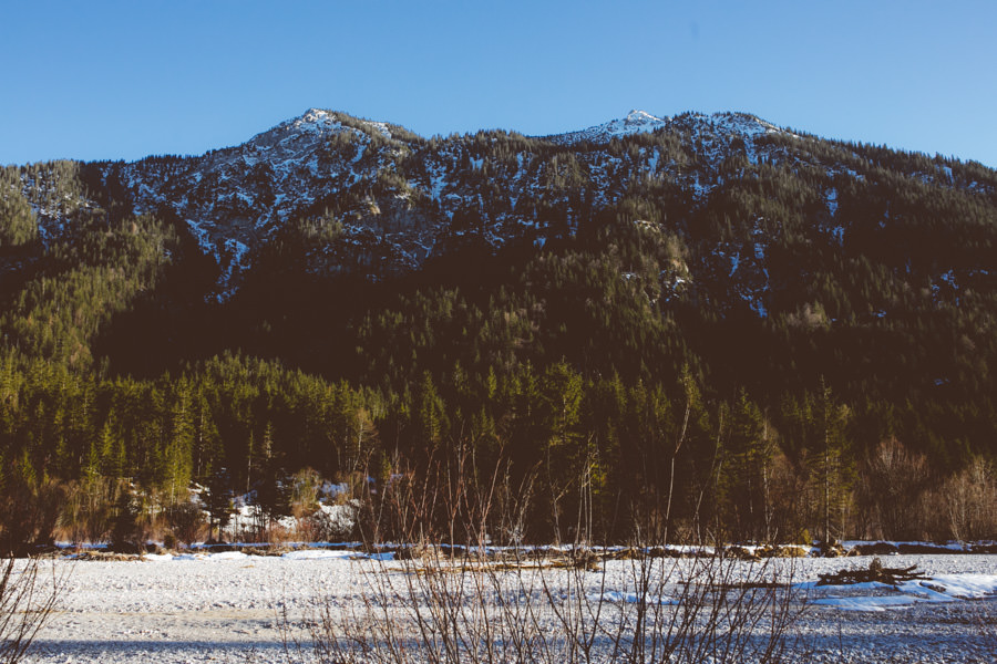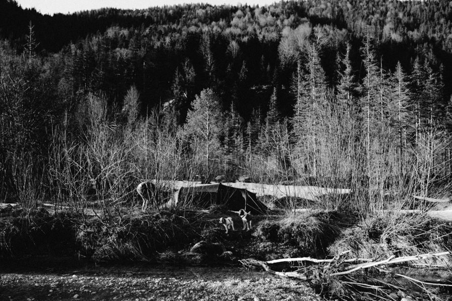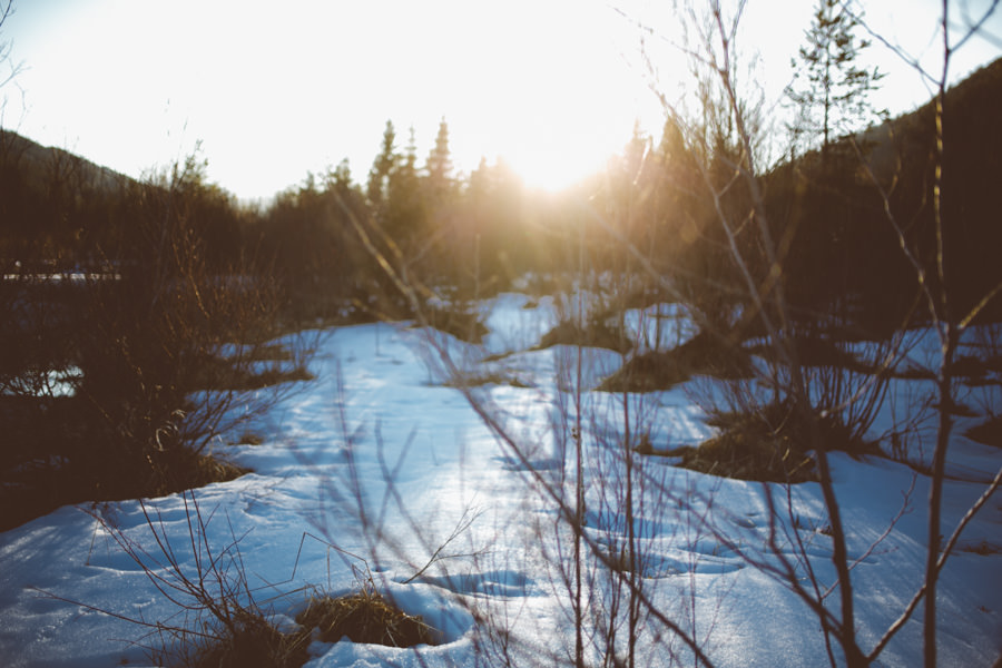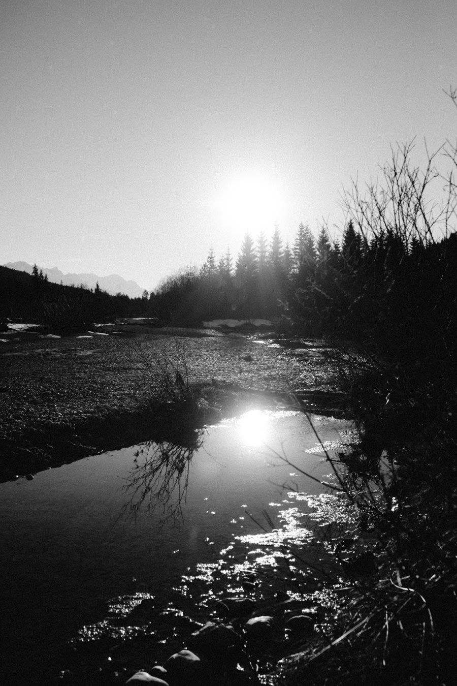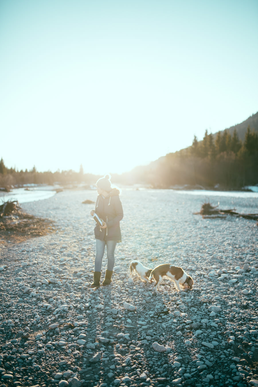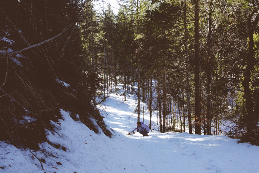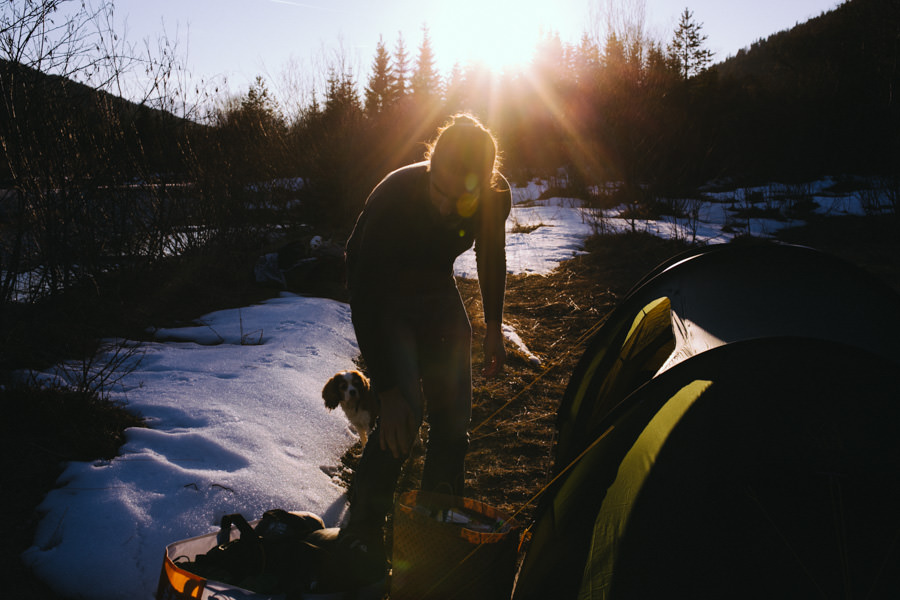 Unsere neue Ausrüstung die seit Sommer in Tüten verpackt darauf wartet endlich dafür gebraucht zu werden, schreite förmlich danach dieses Abenteuer zu wiederholen. Eine Nacht in den Bergen am Fluss, diesmal mit Zelt, denn der Wetterbericht sagte Schnee voraus… Mit einer Tüte feiner Salate, Zeitschriften, zwei großen Termoskannen voller heißem Lieblingstee, Skiunterwäsche, dicken Socken, Pullis und einer Taschenlampe zogen wir ende Februar mit dem Auto in Richtung Silvensteinspeicher los. Den Speicher und die Isar entlang in Richtung Österreich, auf die Mautstraße nach Vorderriss. Auf der linken Straßenseite eröffnet sich eine wunderschöne Landschaft durch die das Flussbett fließt und noch genug Steinstrand übrig ist um dort spazieren zu gehen und die Landschaft zu erkunden.