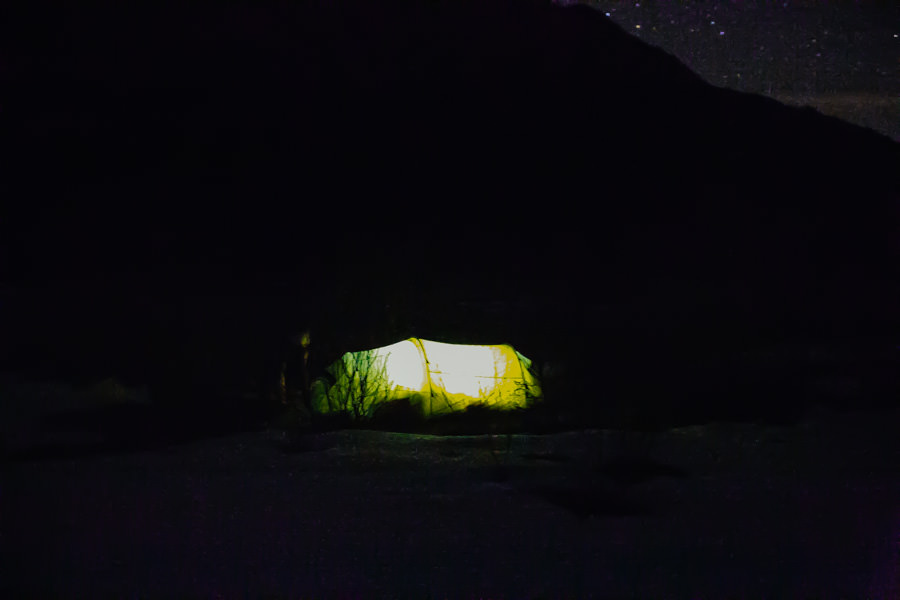 Die Ausstattung: 1 Zelt mit Vorraum, 2 Therm-A-Rest Isomatten, 2 Dauenenschlafsäcke bis – 10 Grad, 2 Wolldecken, Skiunterwäsche, Jogginhose, 2 Paar Socken, ein Longsleeve und darüber eine Fleecejacke, 2 kleine Kissen. Die Wolldecke haben wir in den Schlasack hineingestopft. Außerdem: 2 Kannen Tee, Brotzeit, Taschentücher eine Taschenlampe und eine Mülltüte. Mit dieser Ausstattung war es super warm und kuschlig bei -5 Grad Außentemparatur. Einen Biwak Sack bzw. Zelt haben wir nicht gebraucht.