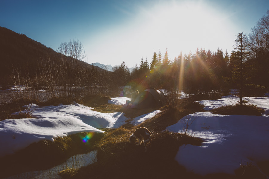Vor drei Jahren habe ich zum letzten mal eine Nacht unter freiem Himmel in den Bergen an der Isar verbracht. Anfang März. Ohne Zelt. Dafür mit ziemlich vielen Klamotten, einer Isolationsmatratze, einem super warmen Schlafsack und einem Biwak Sack, damit die Feuchtigkeit nicht durch den Schlafsack kriecht. Dieses Erlebnis habe ich nie vergessen, denn es war einmalig schön und einfach unbeschreiblich bezaubernd. Millionen Sterne in der glasklaren Nacht, das Rauschen des Flusses einige Meter vor mir entfernt, ein spektakulärer Sonnenaufgang zwischen den Bergen, Eiskristalle die von Außen am Biwacksack lagen und ich im Schlafsack, kuschlig warm.