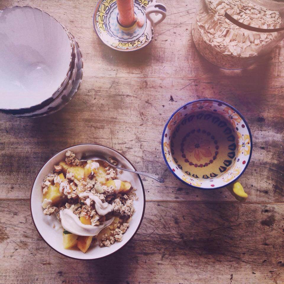 Mini Breakfast Summer Buddha Bowl: ❤️ Ananas, Pfirsich, Minze aus dem Garten, Granola, Acai Beeren, Chia Samen, Kokosnuss Joghurt, ( glutenfreie ) Haferflocken zartschmelzend, Mandel Cocos Creme on Top. (Oh du wunderbare Mandel Cocos Creme, gelobt sei dein Sein, deine Konsistenz, dein Geschmack, ich verehre dich und werde dich bedingungslos bis an mein Lebensende lieben und ehren, in dünnen wie in dicken Zeiten, Amen)