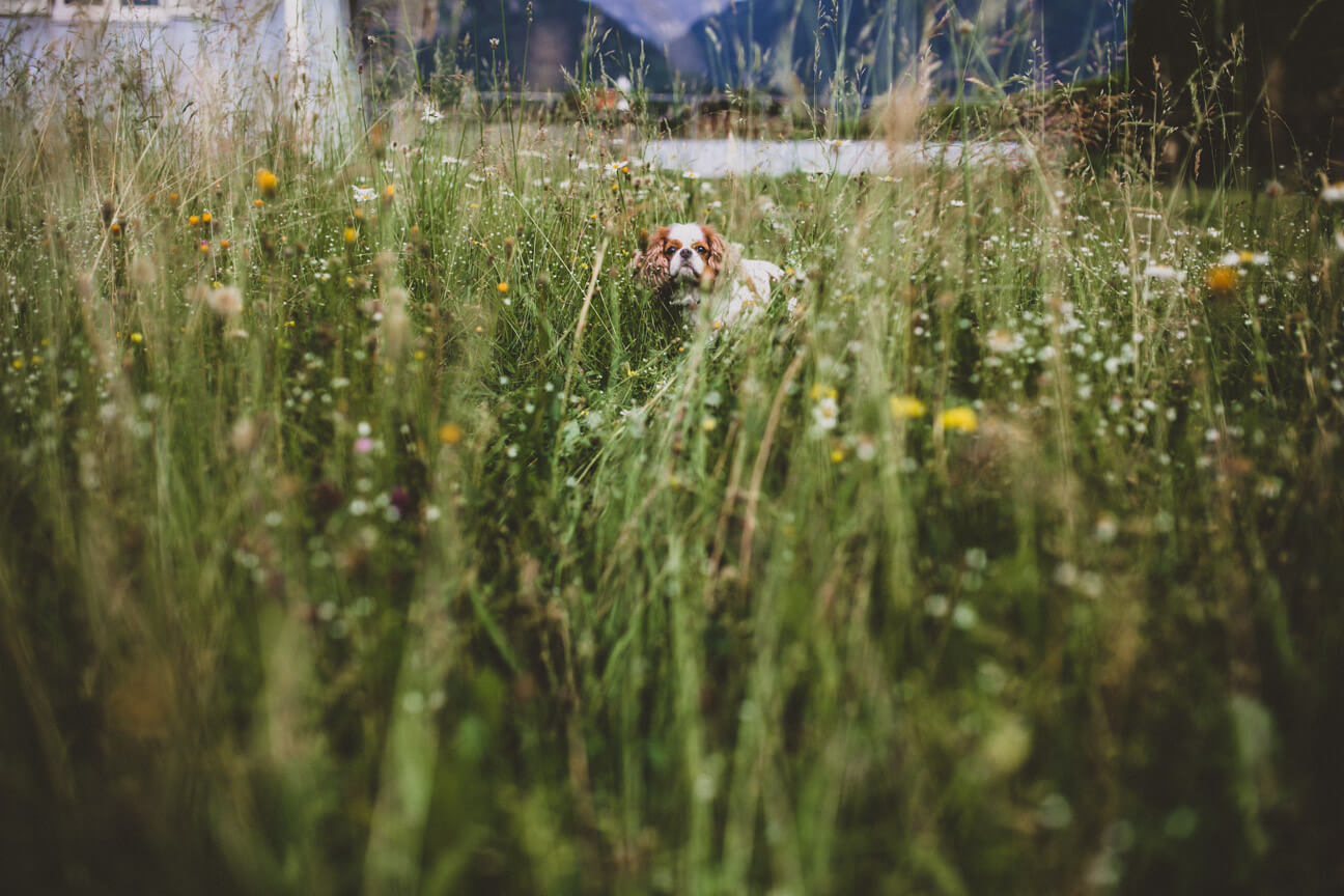 Darum hatte ich die glorreiche Idee, das Gras der Wiese einfach Meterhoch wachsen zu lassen und mit dem Rasenmäher Wege hineinzumähen. Dadurch haben wir nun mit ganz einfachen Methoden, ganz viel Stimmung erschaffen, die leicht zu pflegen ist und nichts kostet.
