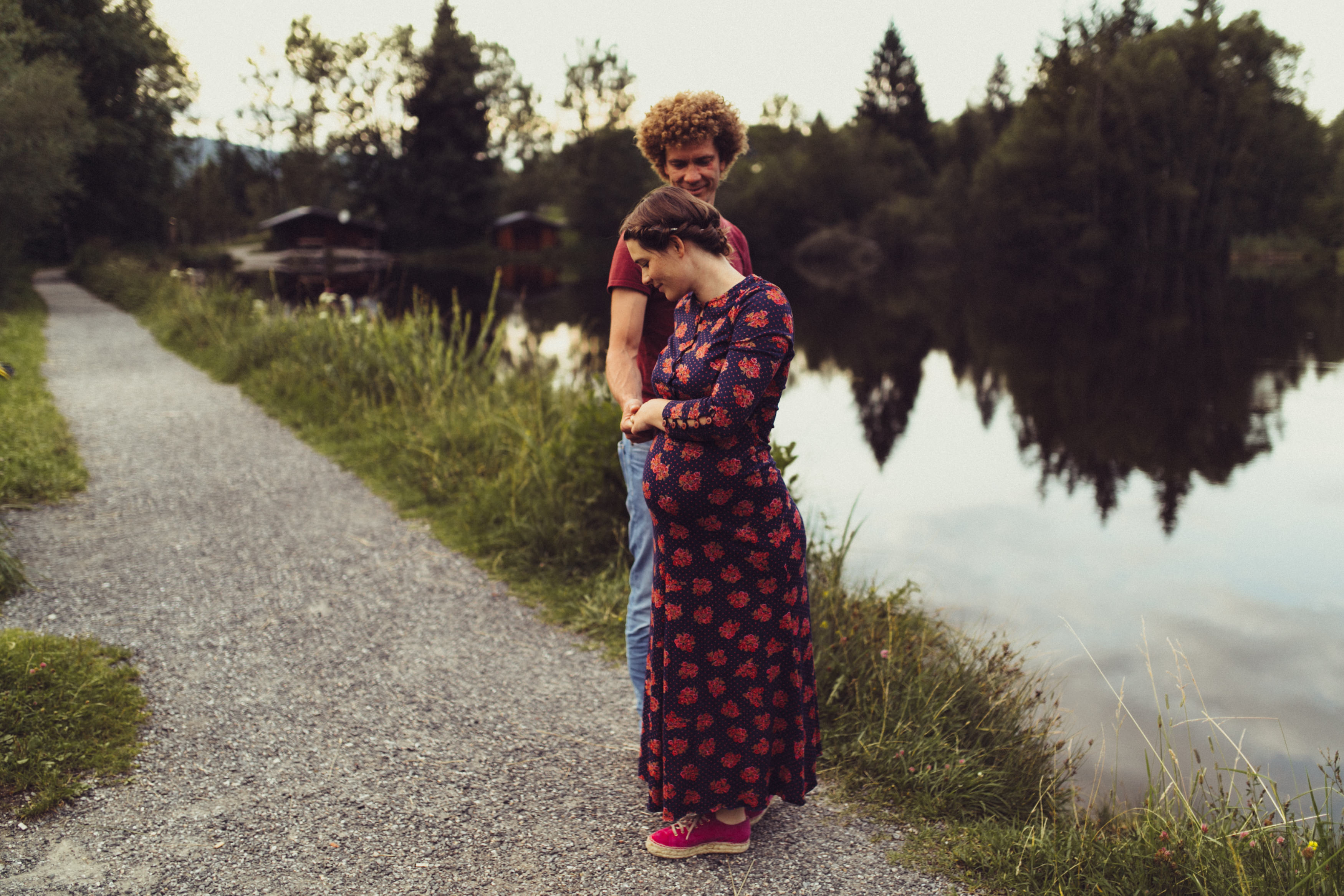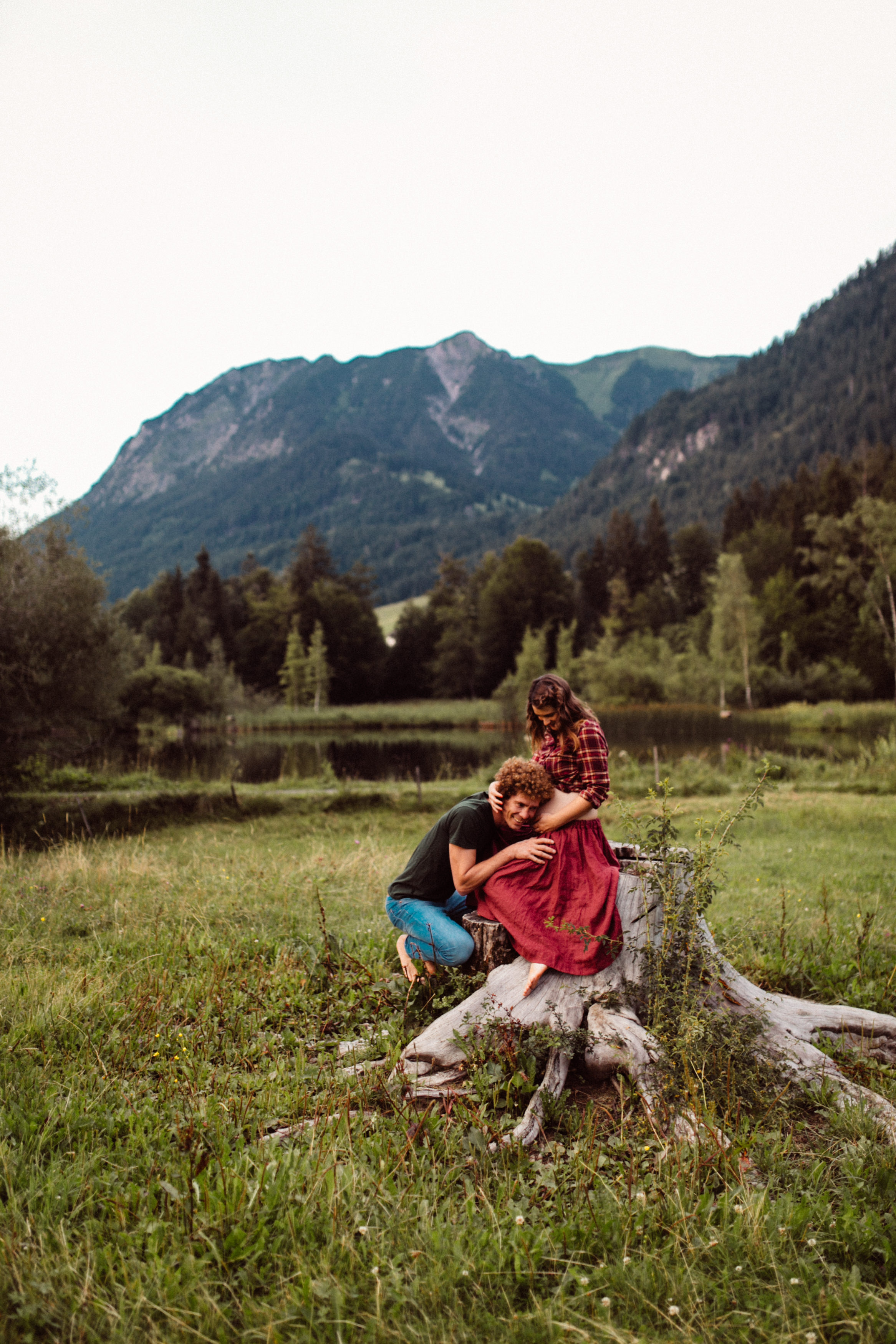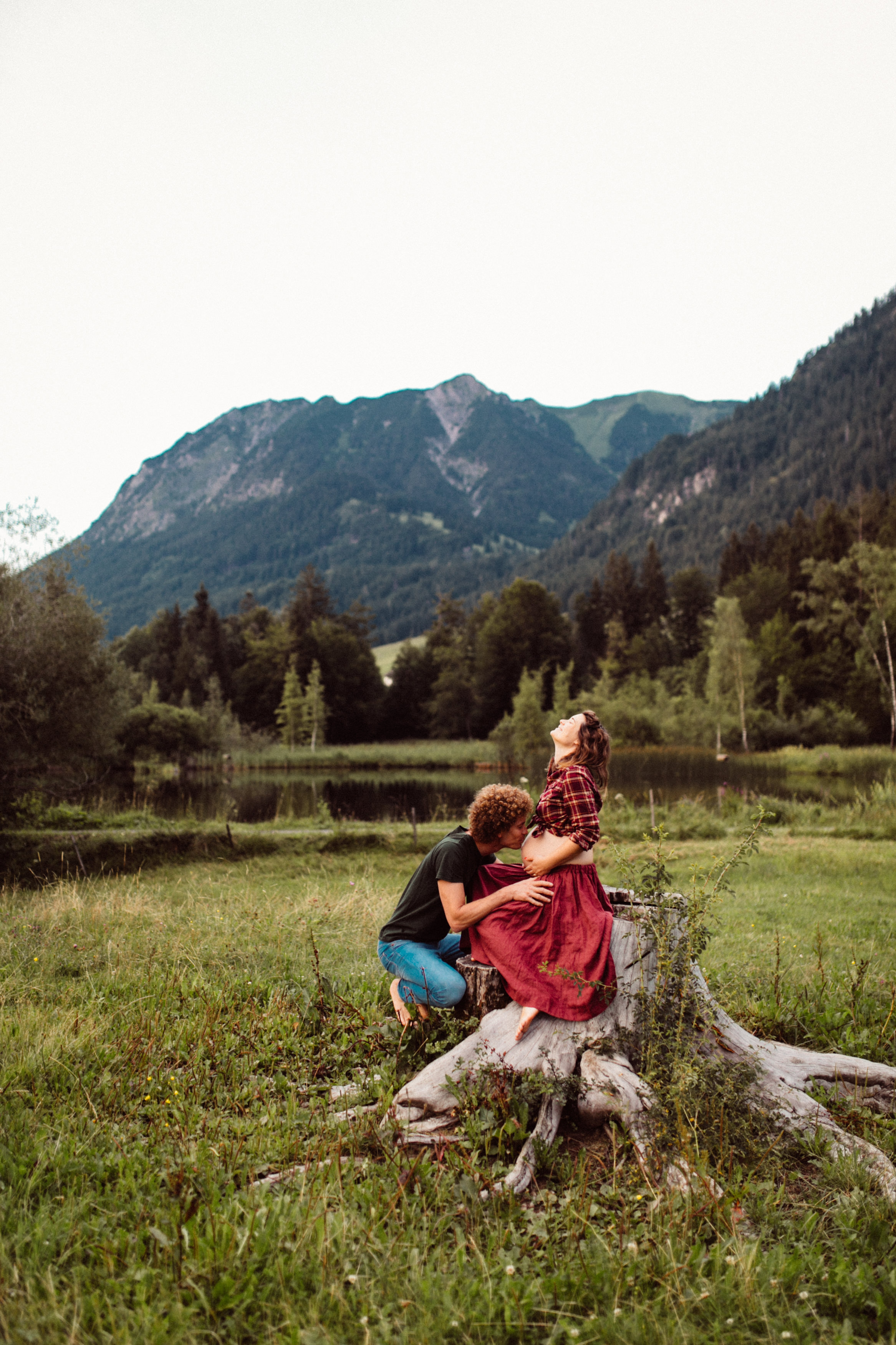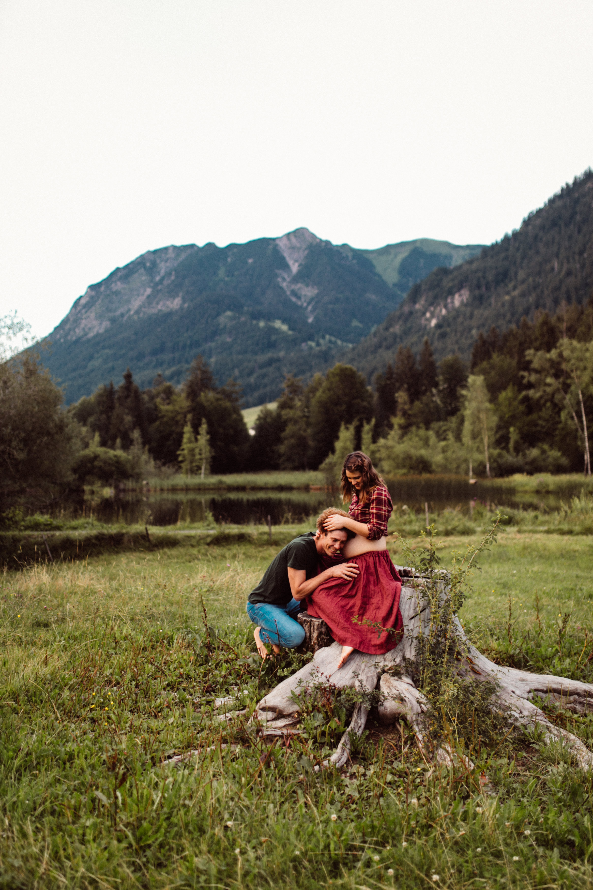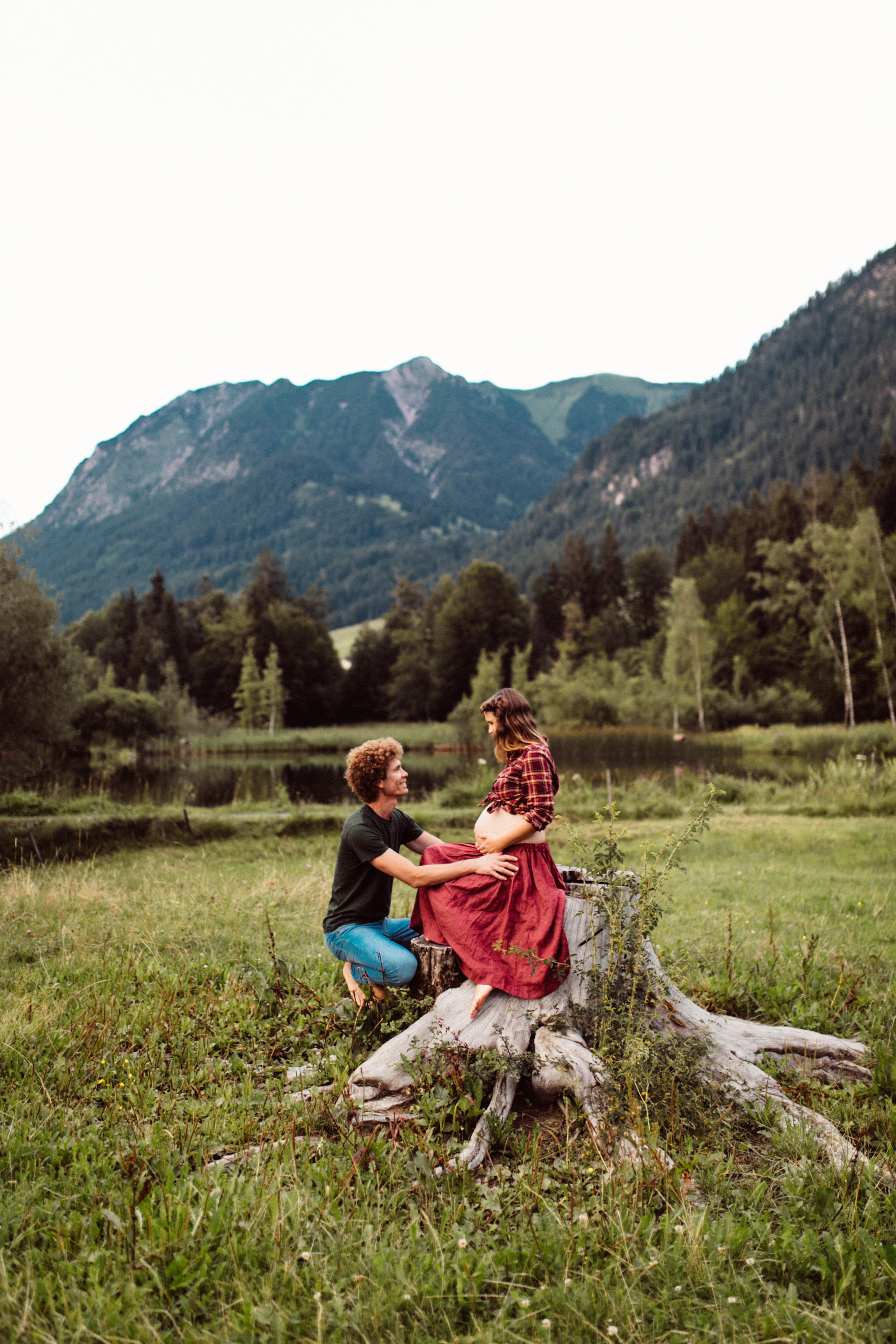 Die beiden kamen zu mir nach Oberstdorf, wir tranken einen Tee und fuhren los. Nach einem kleinen Fußmarsch erreichten wir den still gelegenen Weiher inmitten meiner neuer Heimat. Während die Sonne langsam unterging und kein Mensch weit und breit diesen Platz besuchte, verbrachten wir fast zwei gemütliche Stunden dort oben zusammen. Sophias Babybäuchlein wurde mit den drei genialen Outfits super in den Mittelpunkt gestellt. Einmal das blaue Vintage Kleid ihrer Oma, einmal das Bauchfreie, karierte Hemd mit roten Rock.Und am Ende noch das schöne, schwarz – lila Spitzentop dazu. Ich liebe, liebe, liebe deren Style. So einfach und erdig und doch mit dem gewissen Etwas. So einzigartig diese Stimmung. So wunderschön die drei ♡♡♡