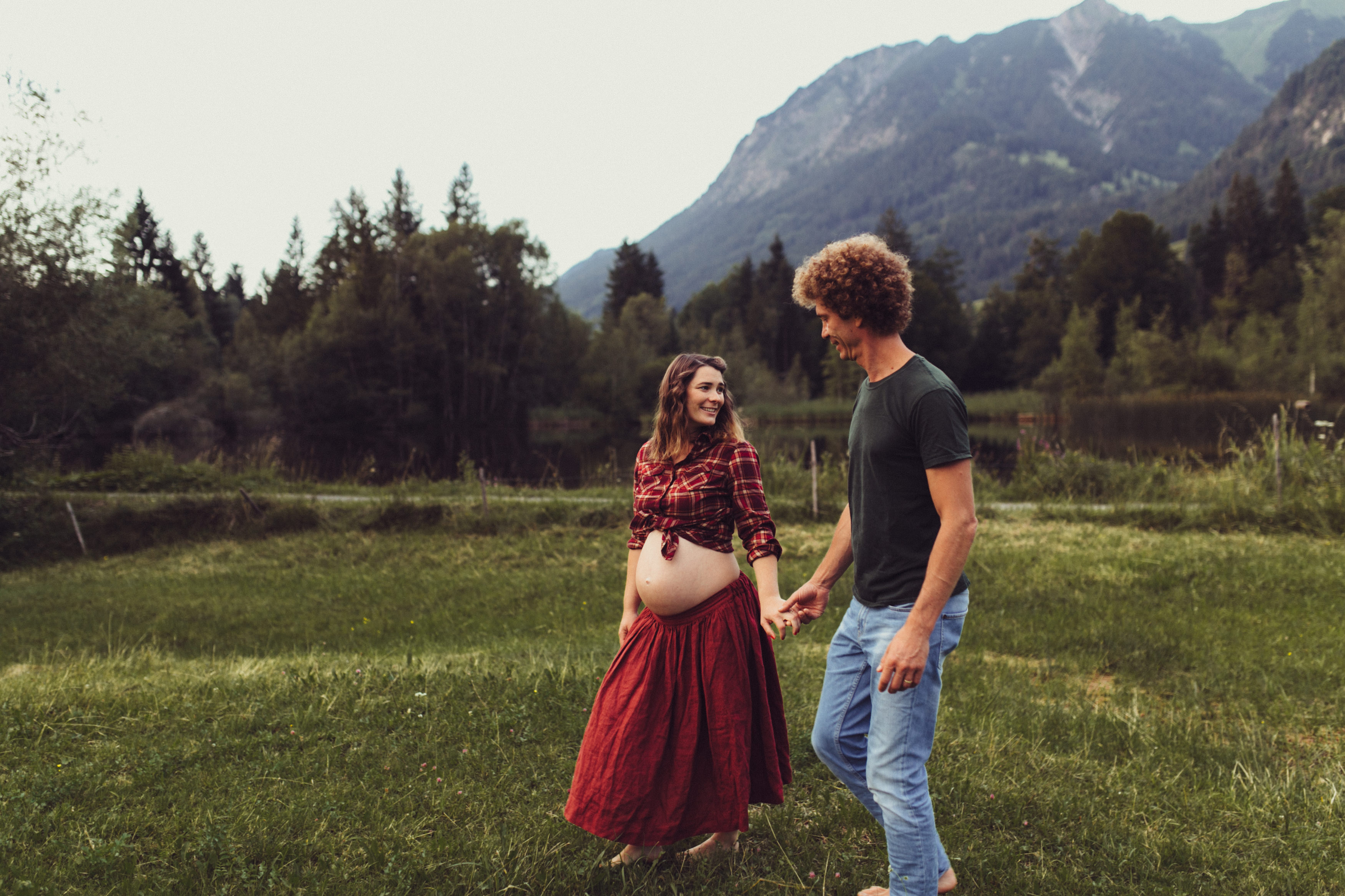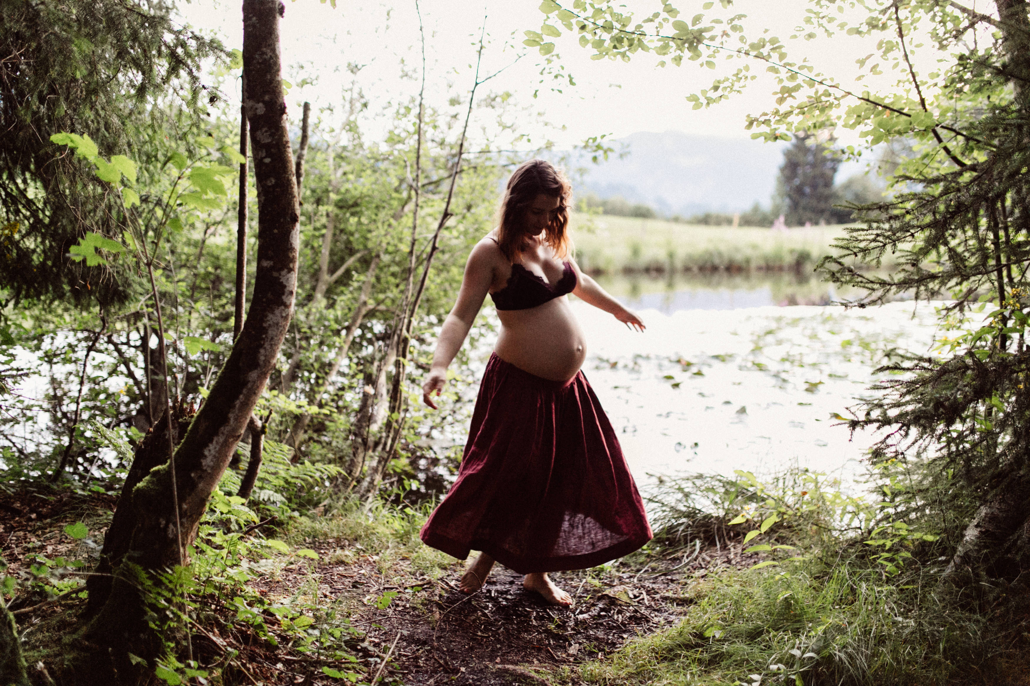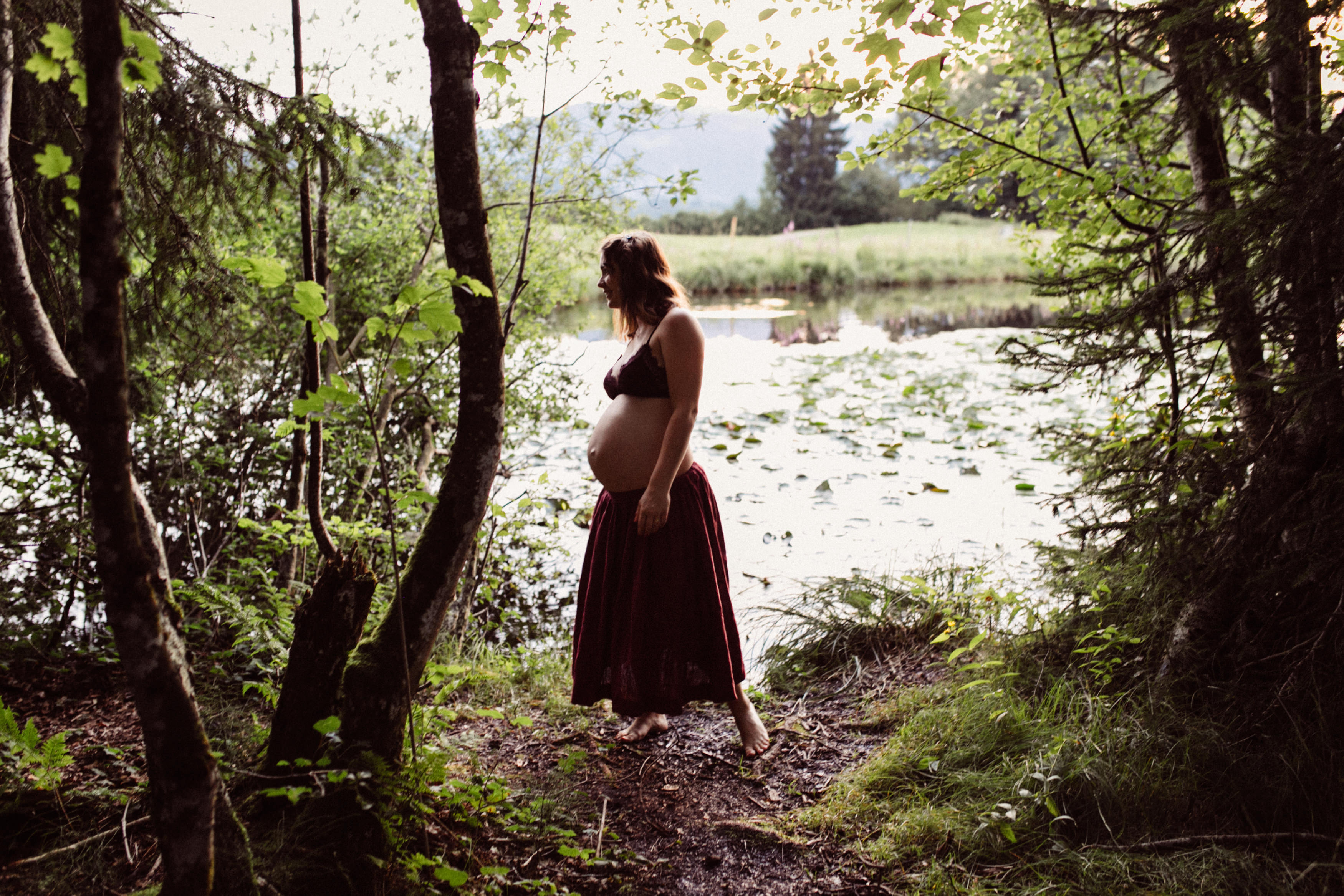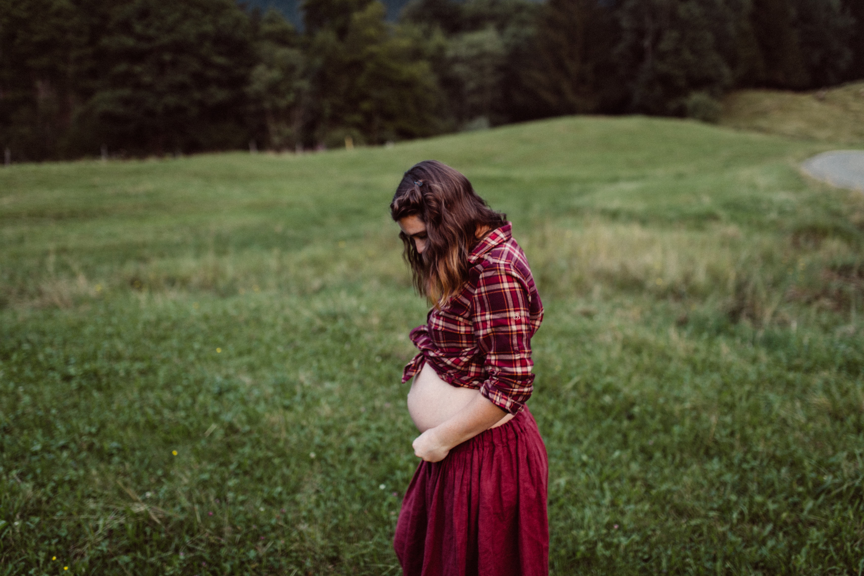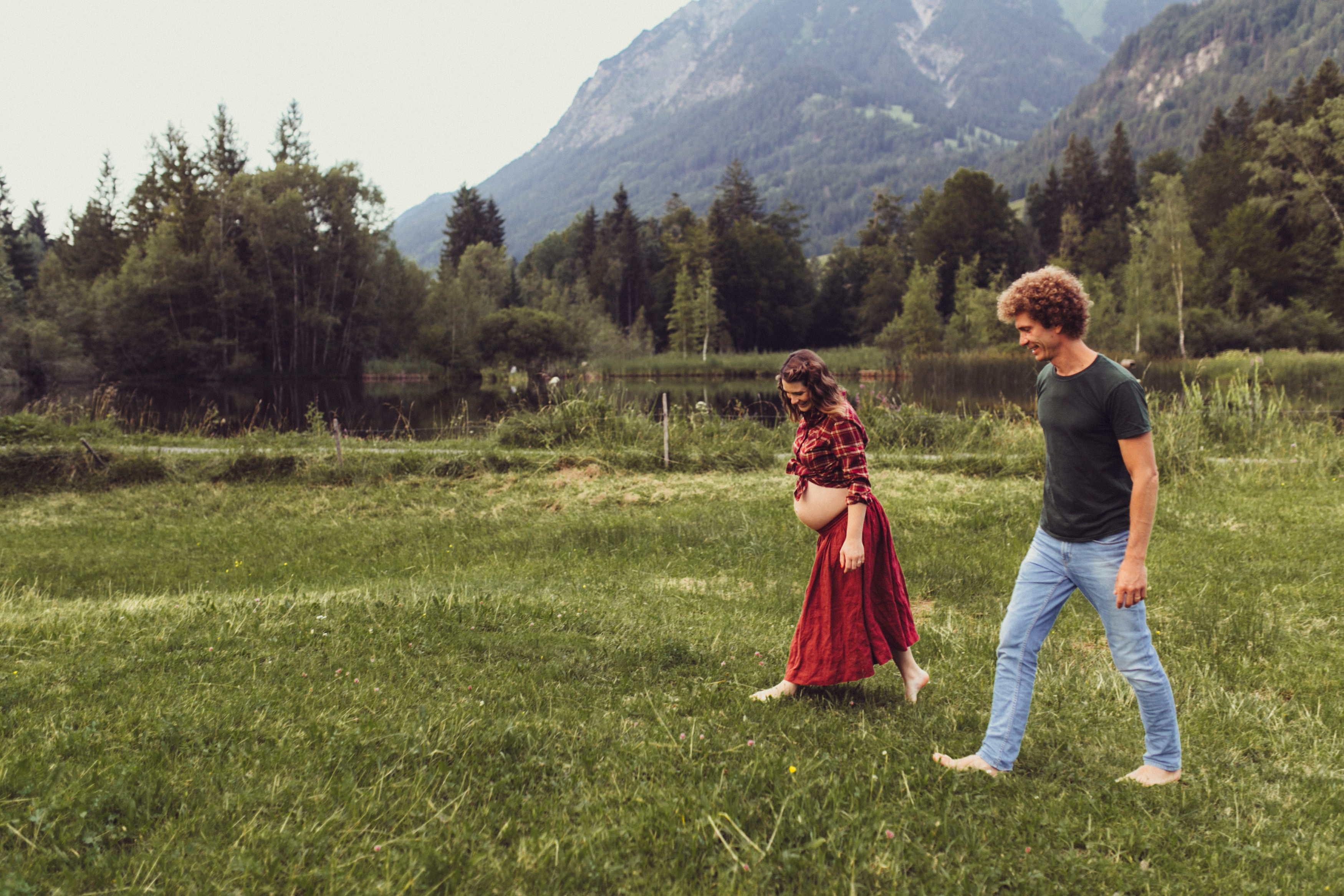 Die beiden kamen zu mir nach Oberstdorf, wir tranken einen Tee und fuhren los. Nach einem kleinen Fußmarsch erreichten wir den still gelegenen Weiher inmitten meiner neuer Heimat. Während die Sonne langsam unterging und kein Mensch weit und breit diesen Platz besuchte, verbrachten wir fast zwei gemütliche Stunden dort oben zusammen. Sophias Babybäuchlein wurde mit den drei genialen Outfits super in den Mittelpunkt gestellt. Einmal das blaue Vintage Kleid ihrer Oma, einmal das Bauchfreie, karierte Hemd mit roten Rock.Und am Ende noch das schöne, schwarz – lila Spitzentop dazu. Ich liebe, liebe, liebe deren Style. So einfach und erdig und doch mit dem gewissen Etwas. So einzigartig diese Stimmung. So wunderschön die drei ♡♡♡