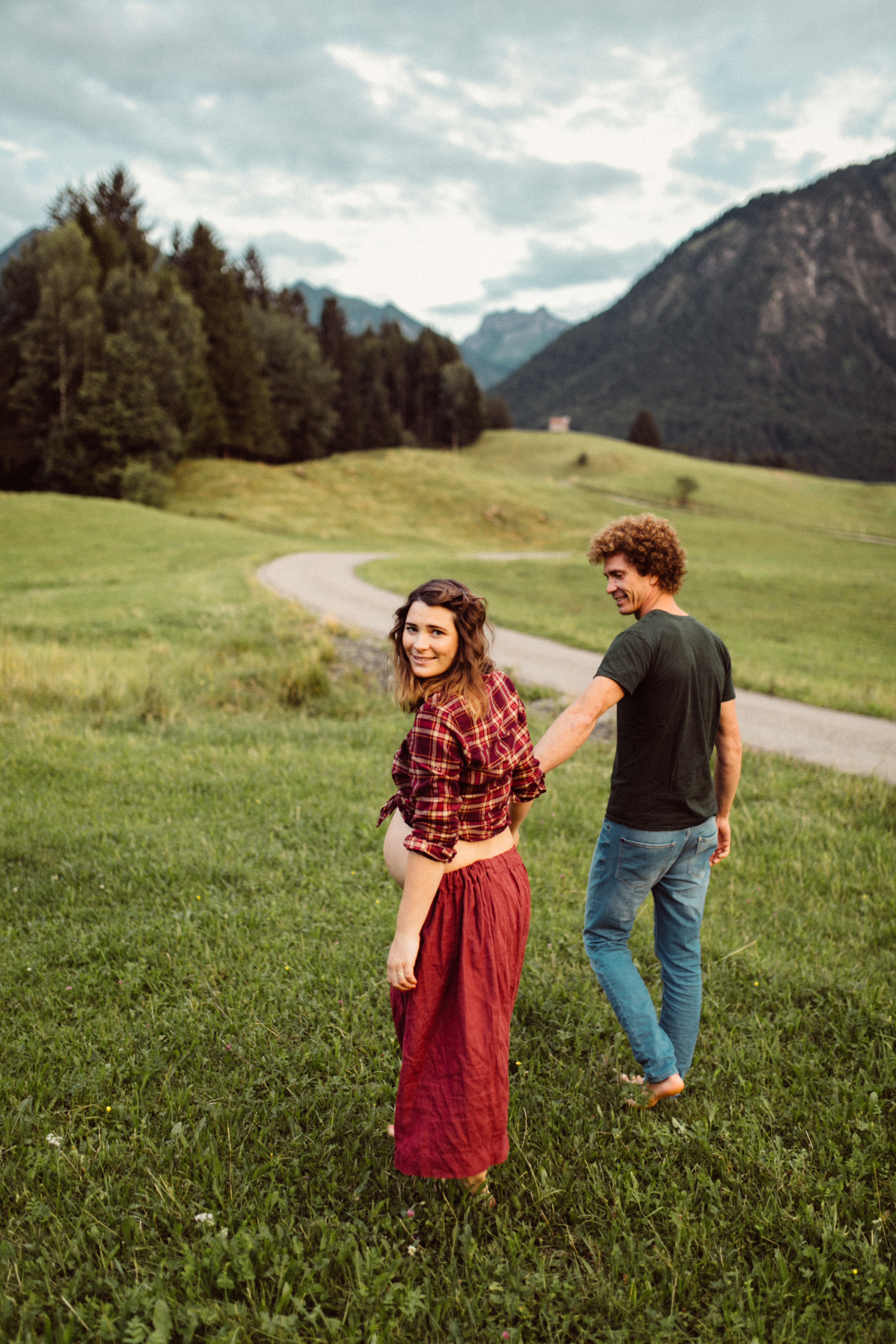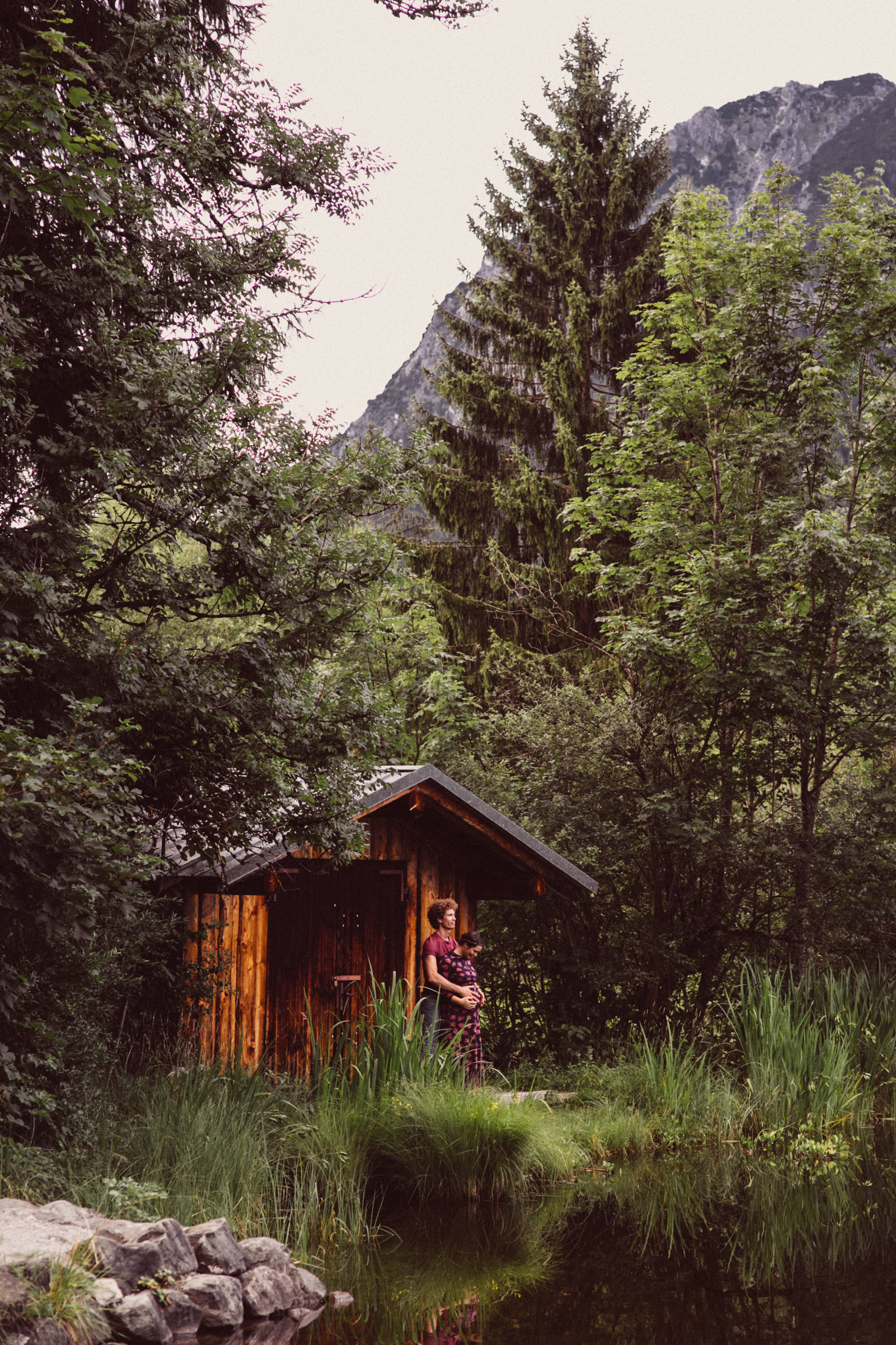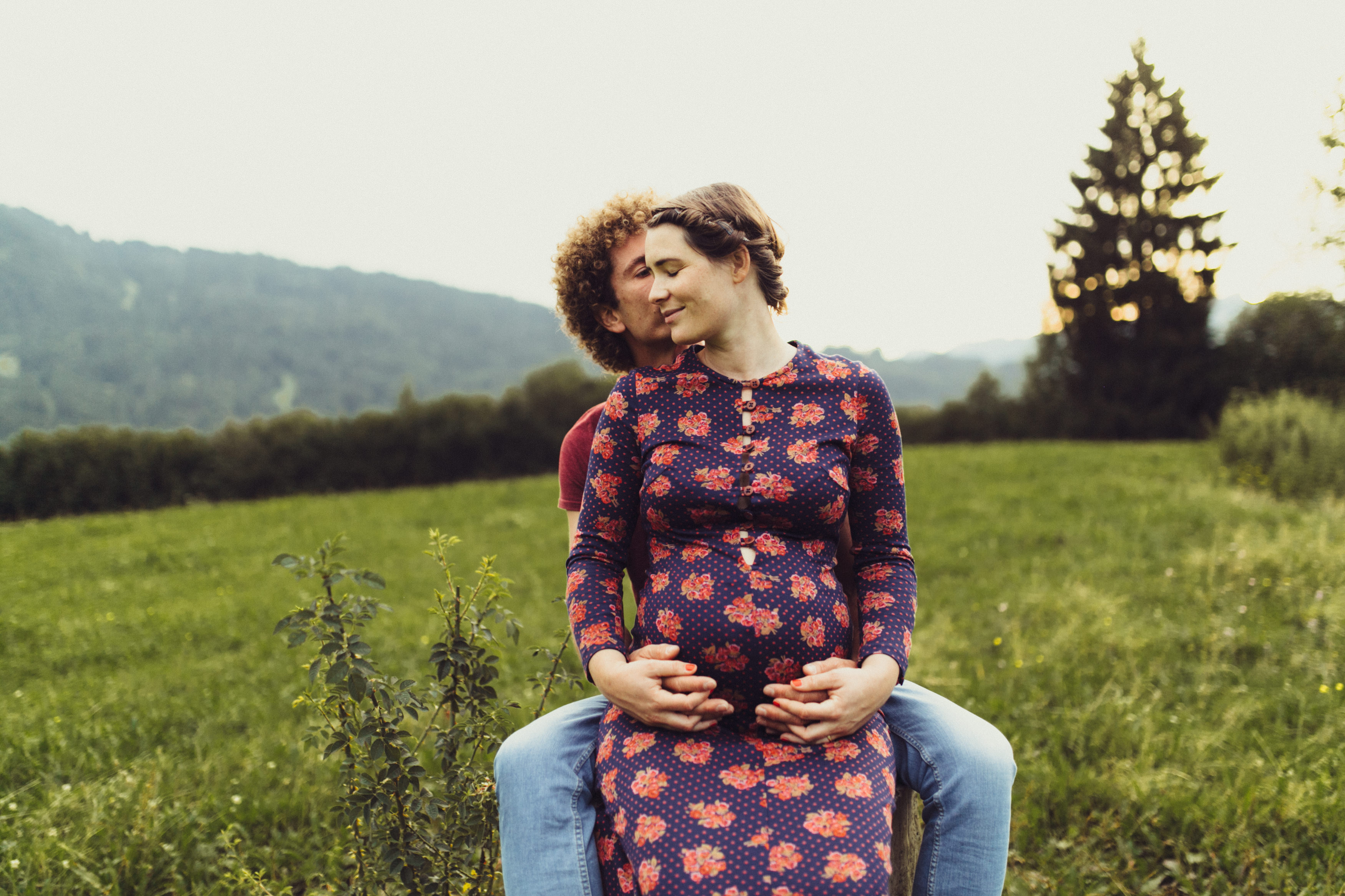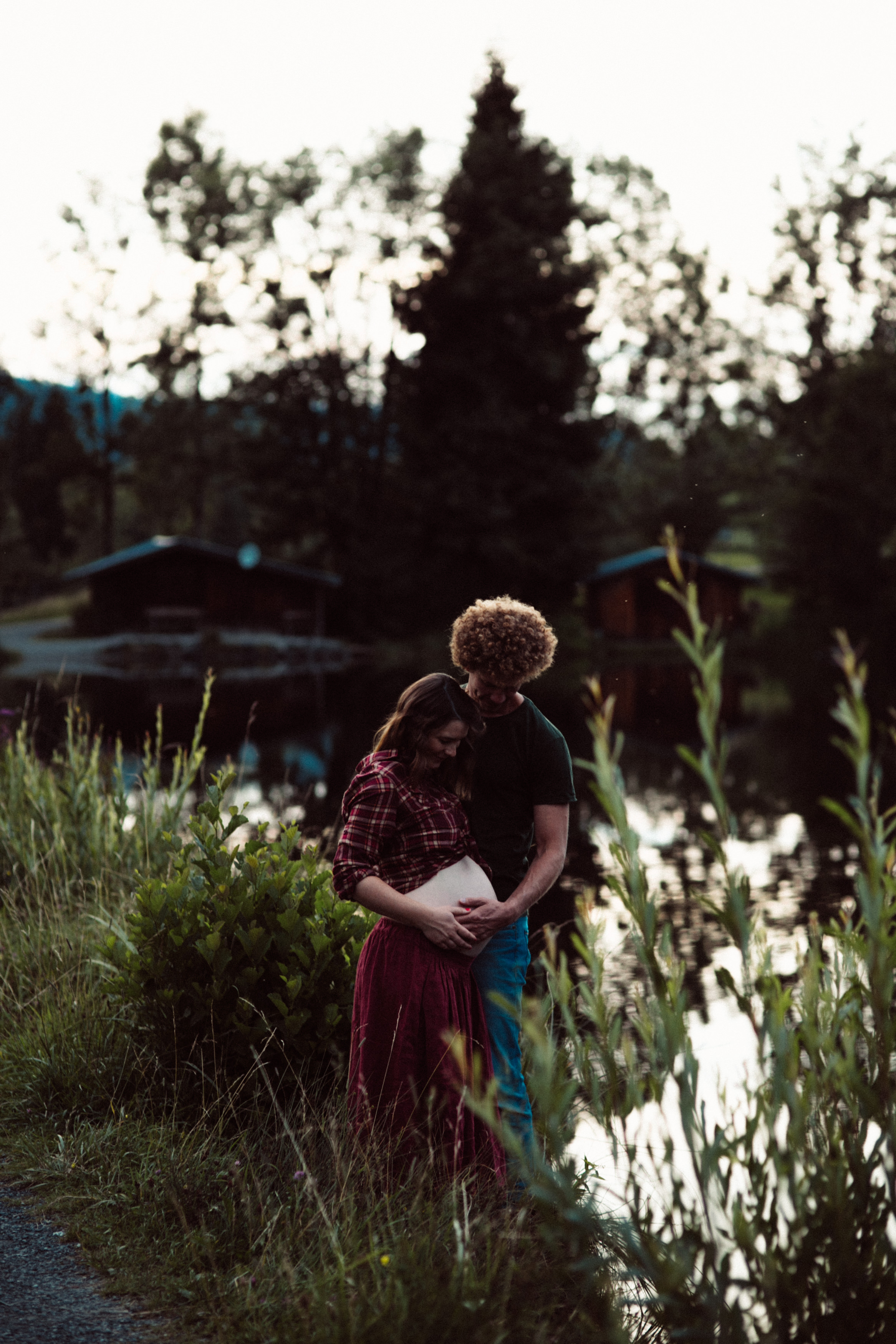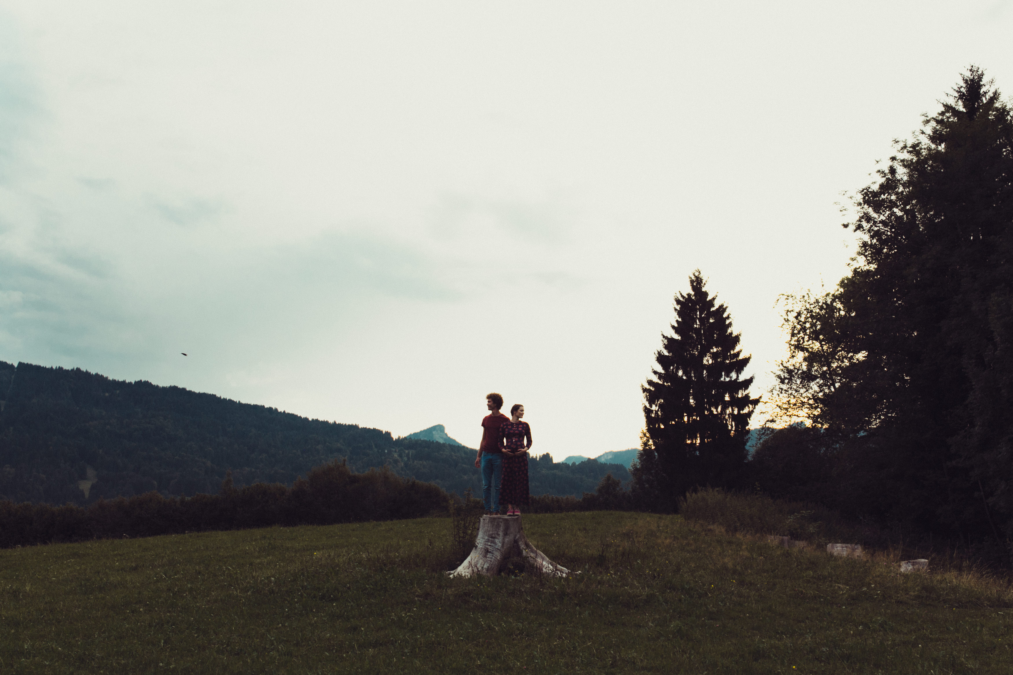 Die beiden kamen zu mir nach Oberstdorf, wir tranken einen Tee und fuhren los. Nach einem kleinen Fußmarsch erreichten wir den still gelegenen Weiher inmitten meiner neuer Heimat. Während die Sonne langsam unterging und kein Mensch weit und breit diesen Platz besuchte, verbrachten wir fast zwei gemütliche Stunden dort oben zusammen. Sophias Babybäuchlein wurde mit den drei genialen Outfits super in den Mittelpunkt gestellt. Einmal das blaue Vintage Kleid ihrer Oma, einmal das Bauchfreie, karierte Hemd mit roten Rock.Und am Ende noch das schöne, schwarz – lila Spitzentop dazu. Ich liebe, liebe, liebe deren Style. So einfach und erdig und doch mit dem gewissen Etwas. So einzigartig diese Stimmung. So wunderschön die drei ♡♡♡