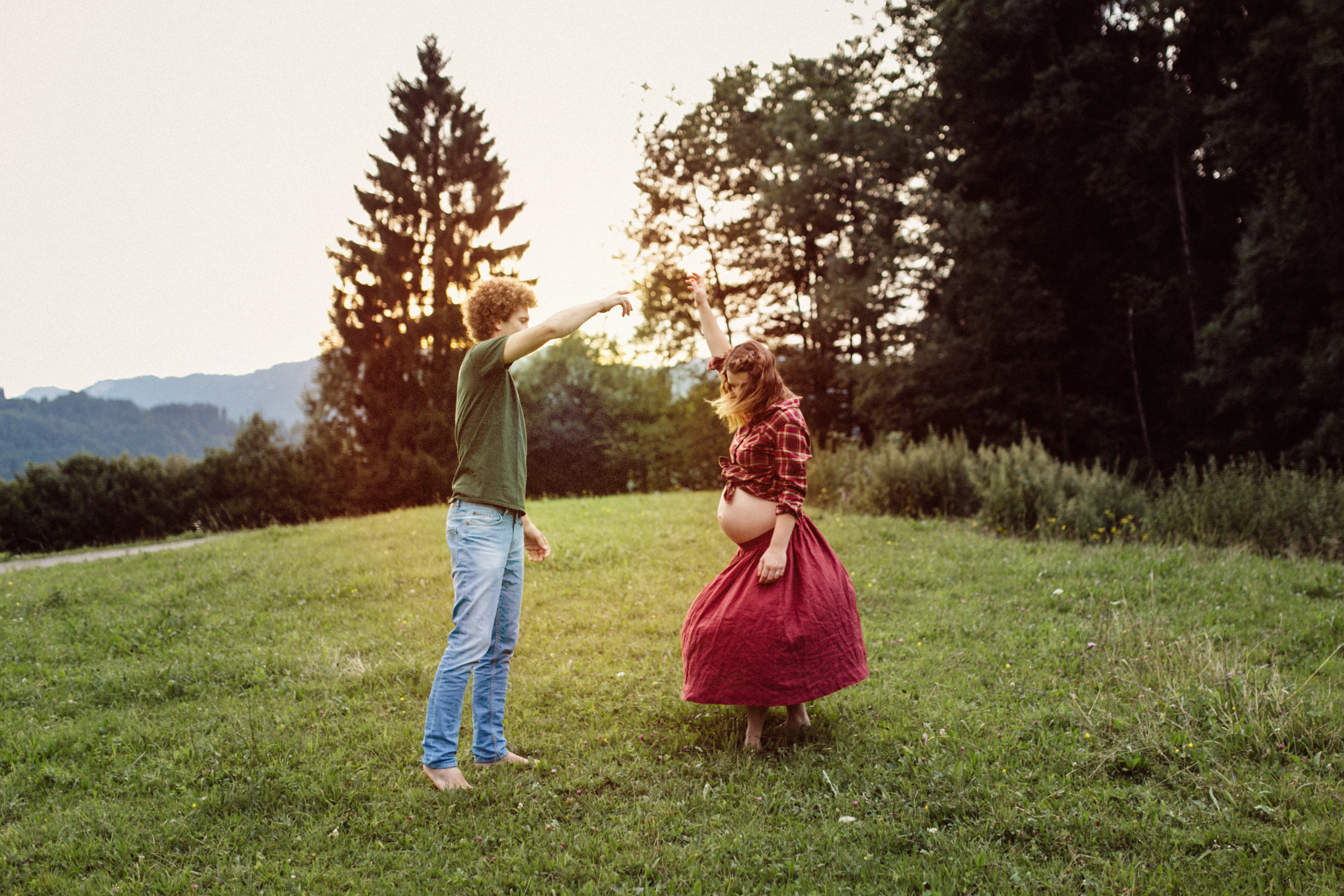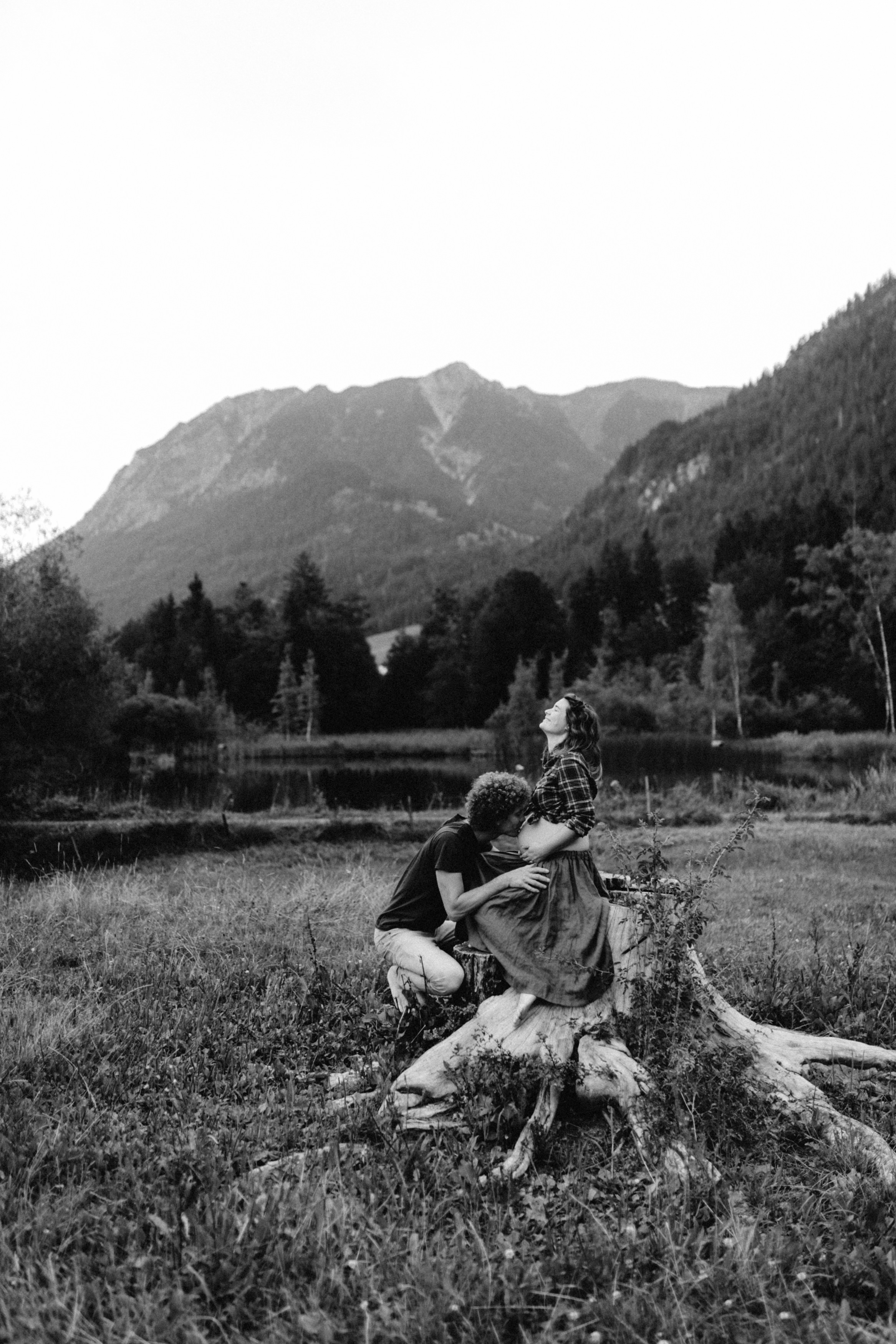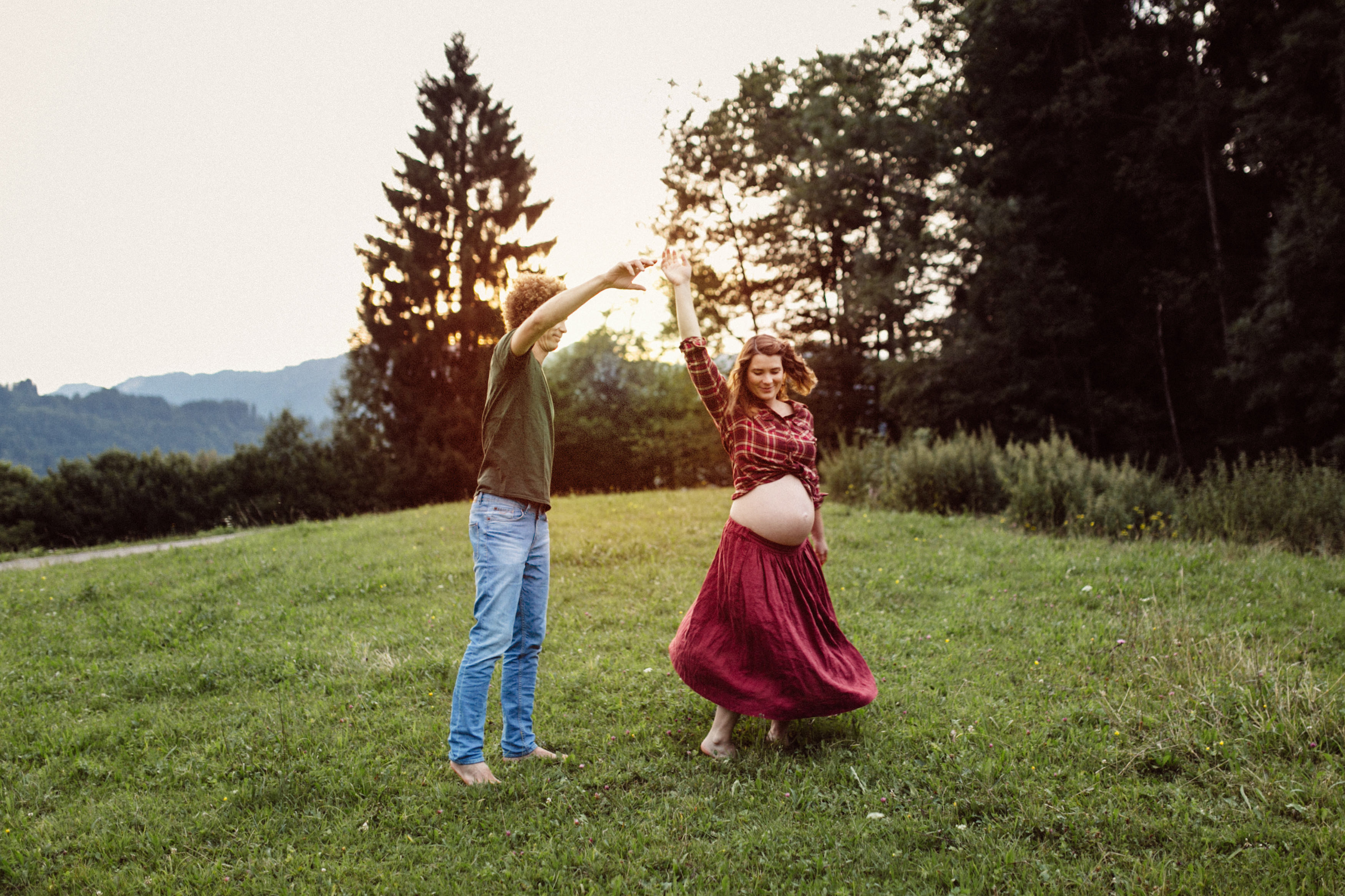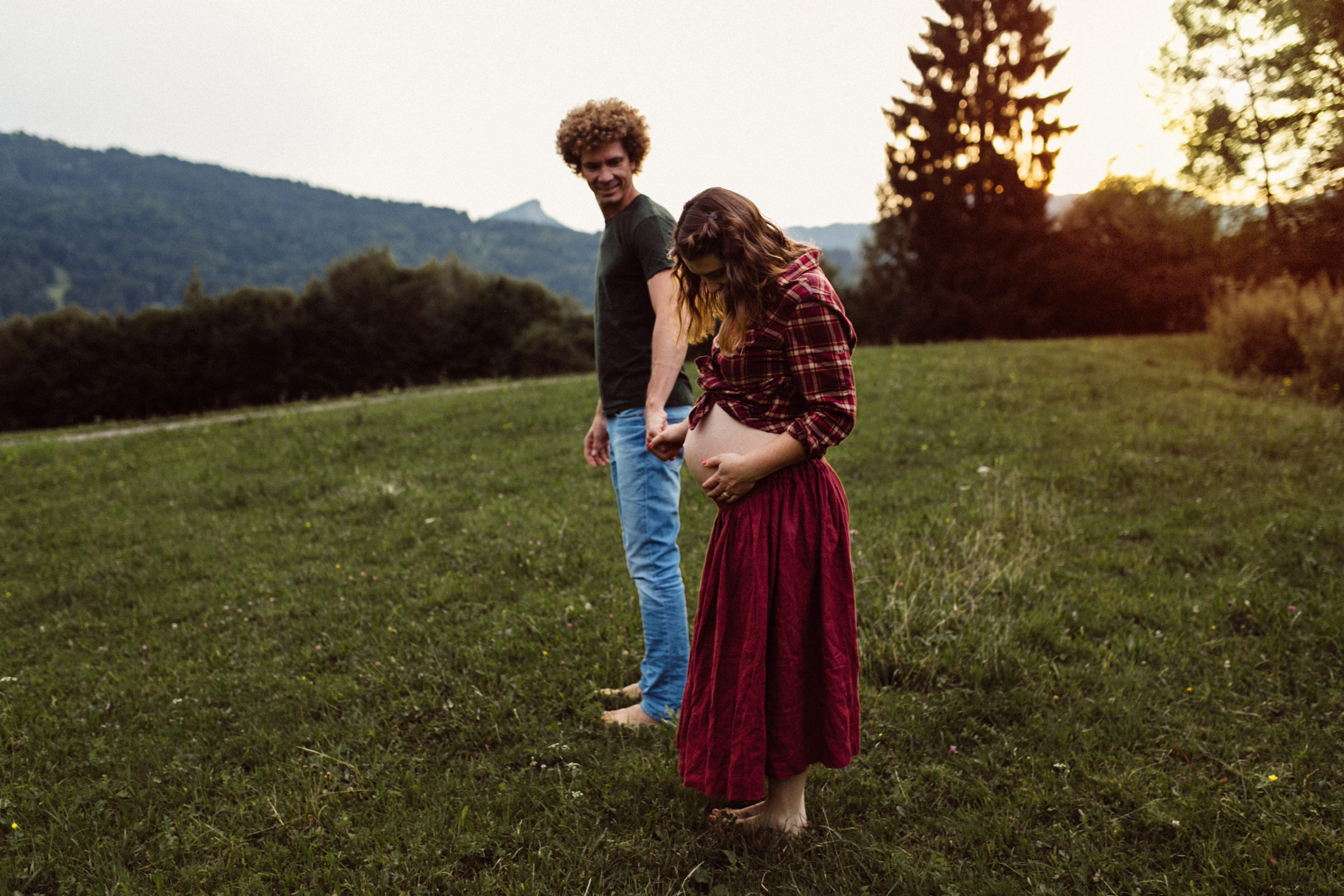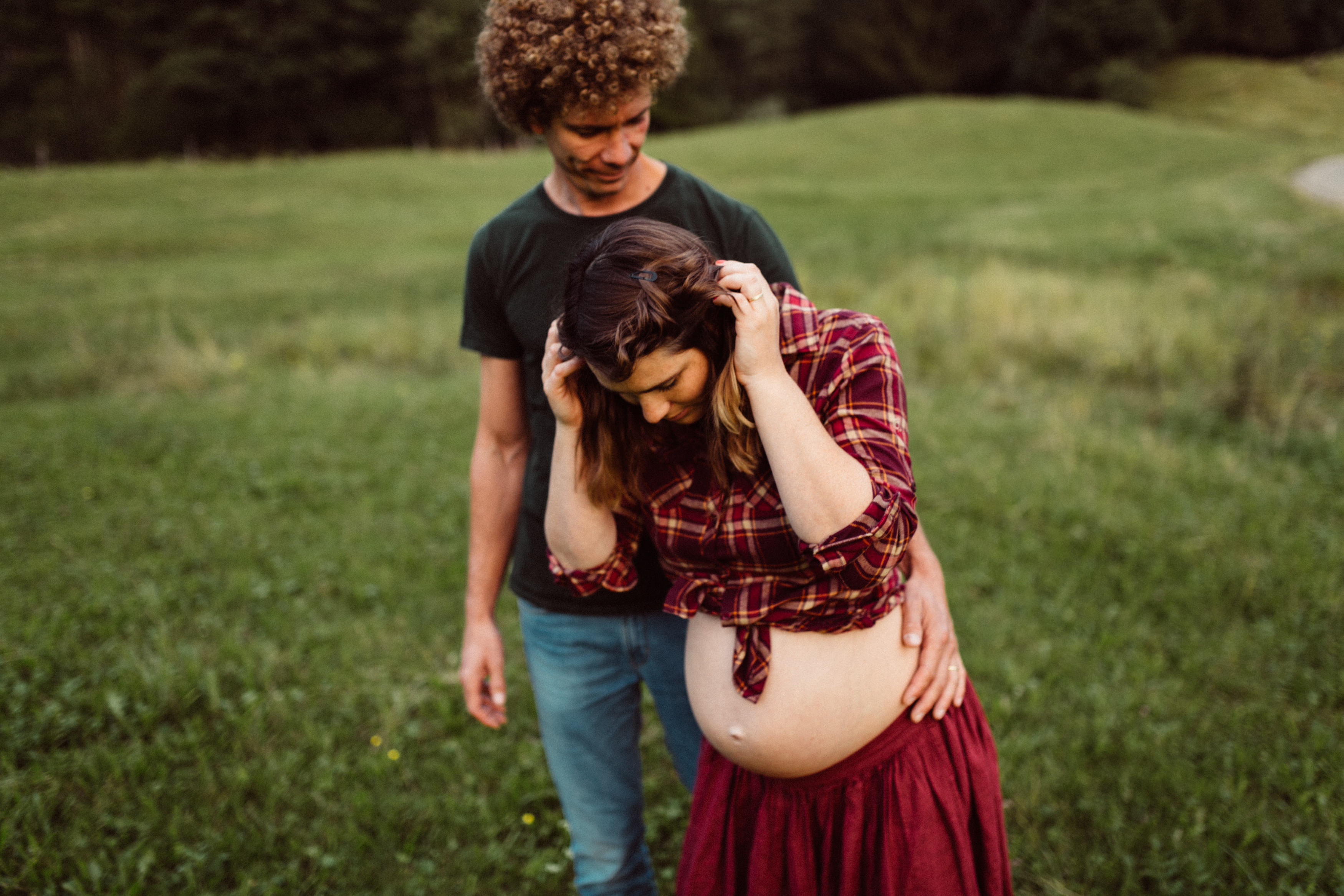 Die beiden kamen zu mir nach Oberstdorf, wir tranken einen Tee und fuhren los. Nach einem kleinen Fußmarsch erreichten wir den still gelegenen Weiher inmitten meiner neuer Heimat. Während die Sonne langsam unterging und kein Mensch weit und breit diesen Platz besuchte, verbrachten wir fast zwei gemütliche Stunden dort oben zusammen. Sophias Babybäuchlein wurde mit den drei genialen Outfits super in den Mittelpunkt gestellt. Einmal das blaue Vintage Kleid ihrer Oma, einmal das Bauchfreie, karierte Hemd mit roten Rock.Und am Ende noch das schöne, schwarz – lila Spitzentop dazu. Ich liebe, liebe, liebe deren Style. So einfach und erdig und doch mit dem gewissen Etwas. So einzigartig diese Stimmung. So wunderschön die drei ♡♡♡