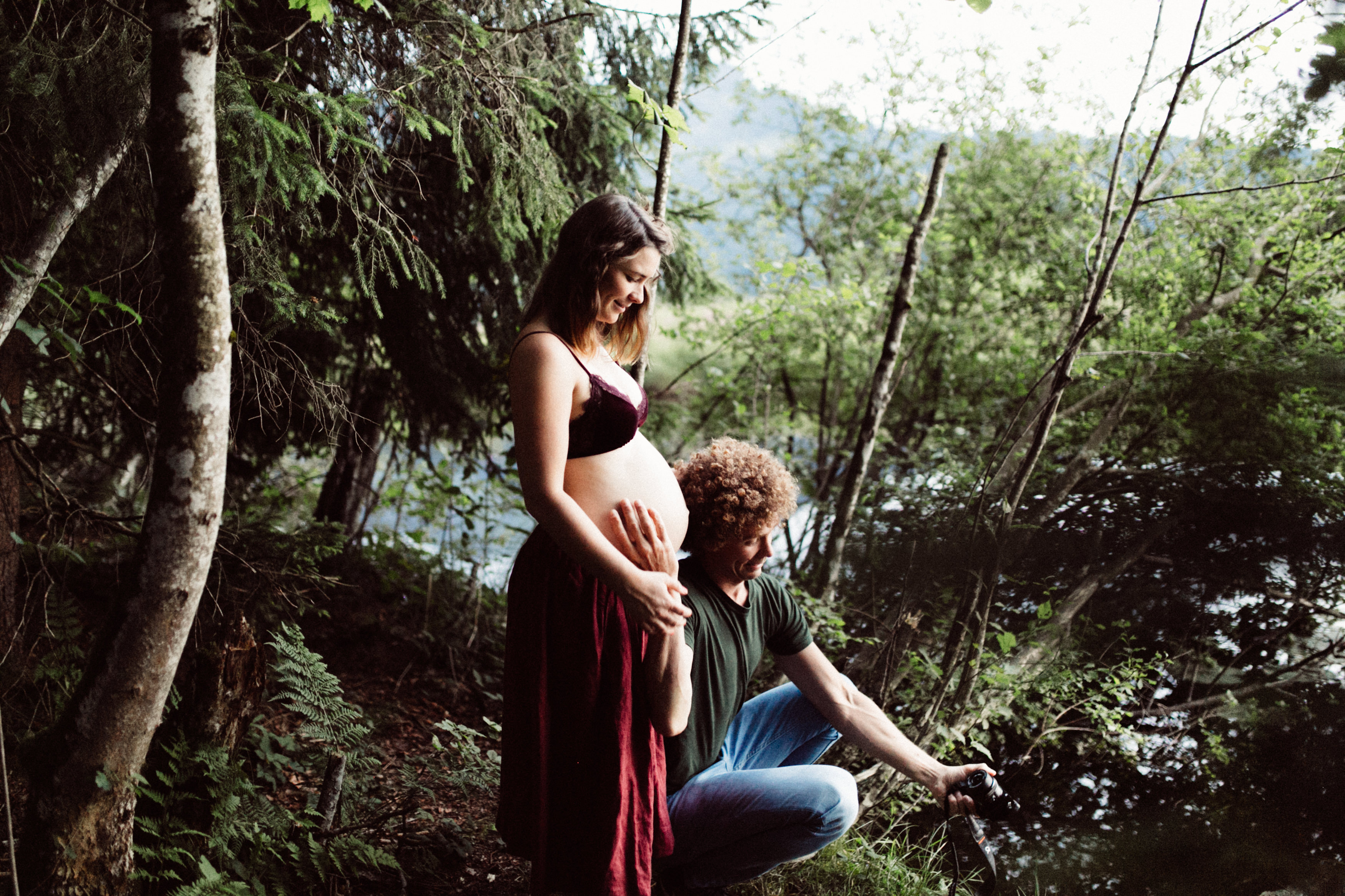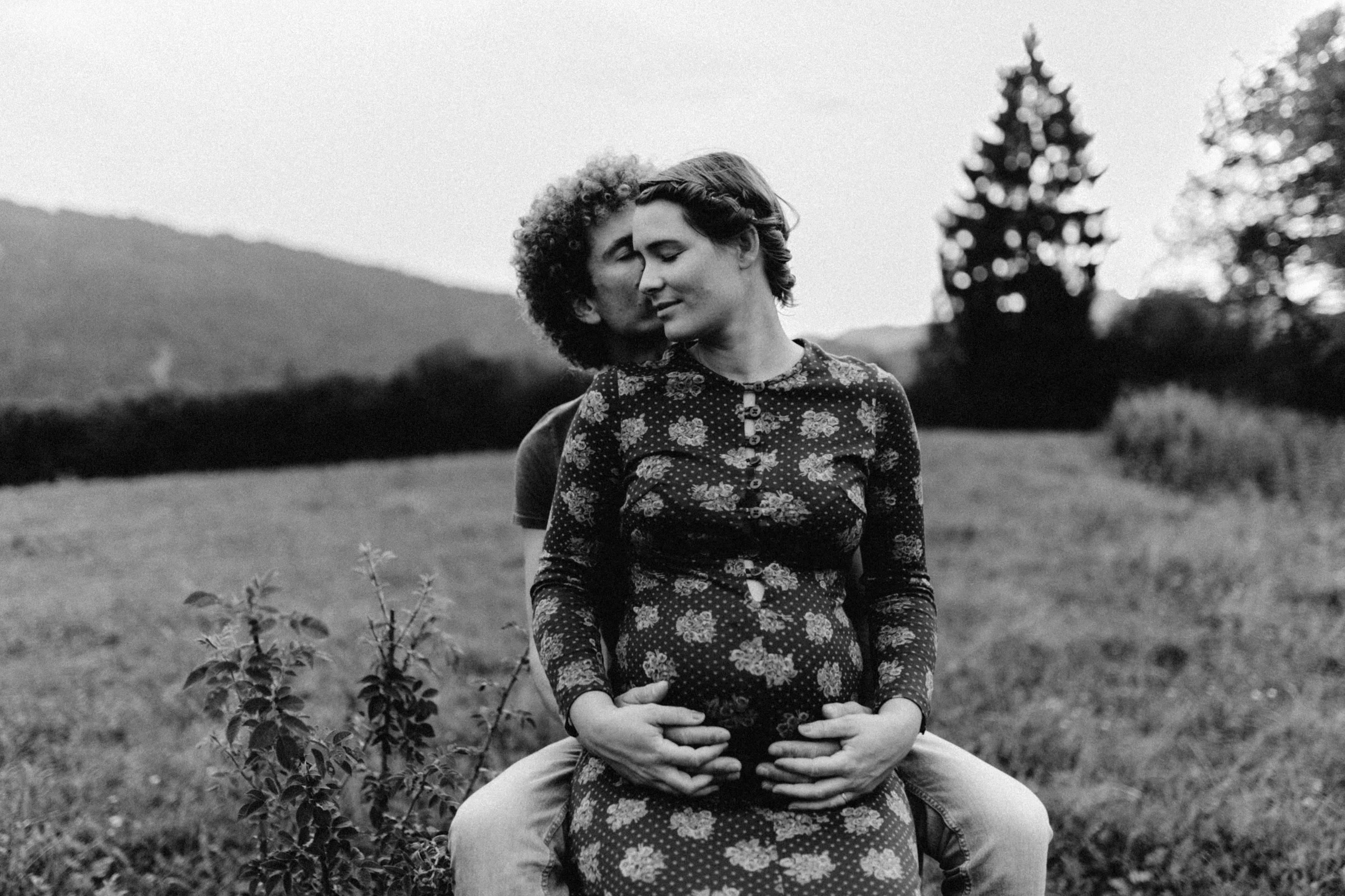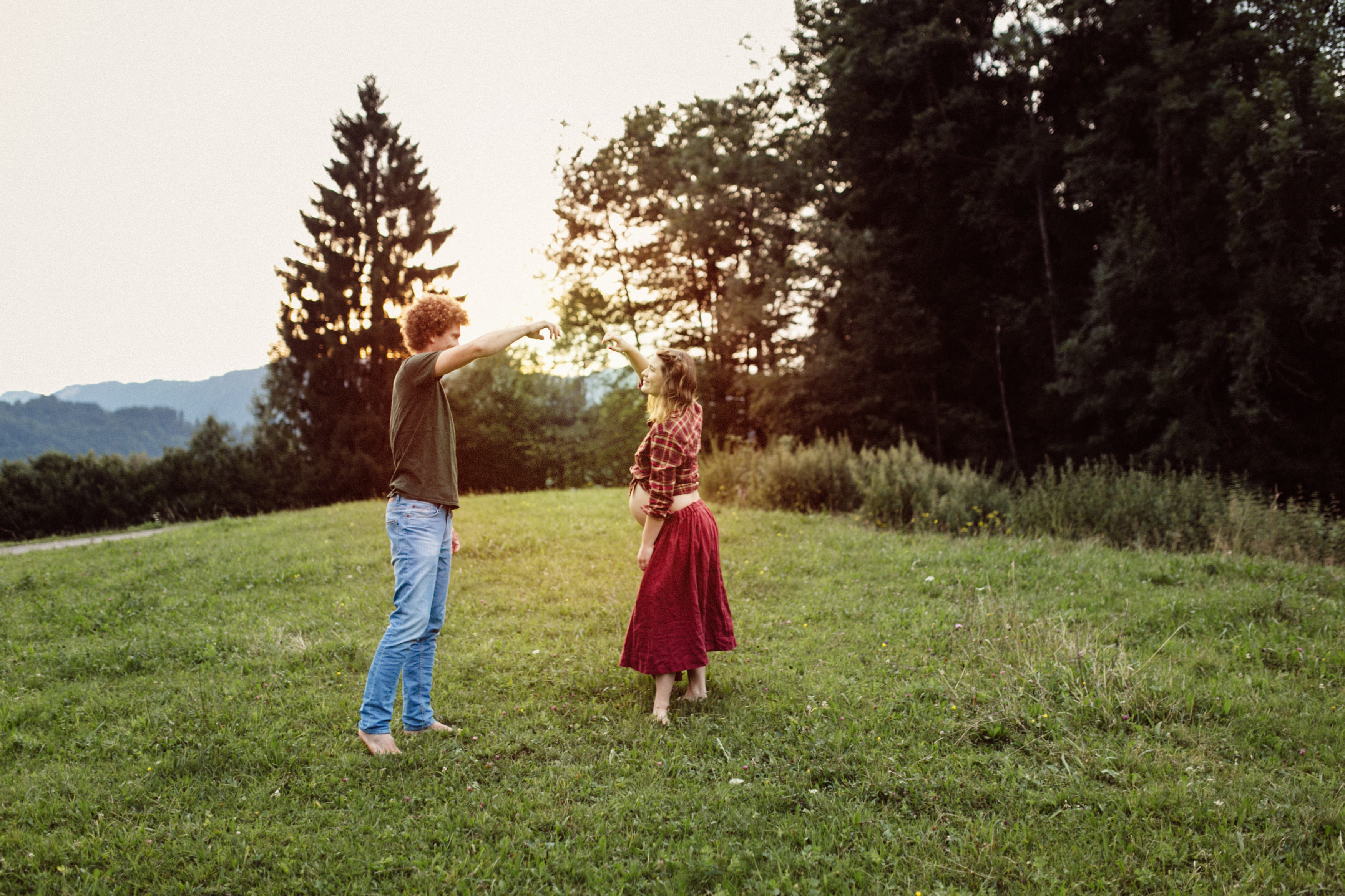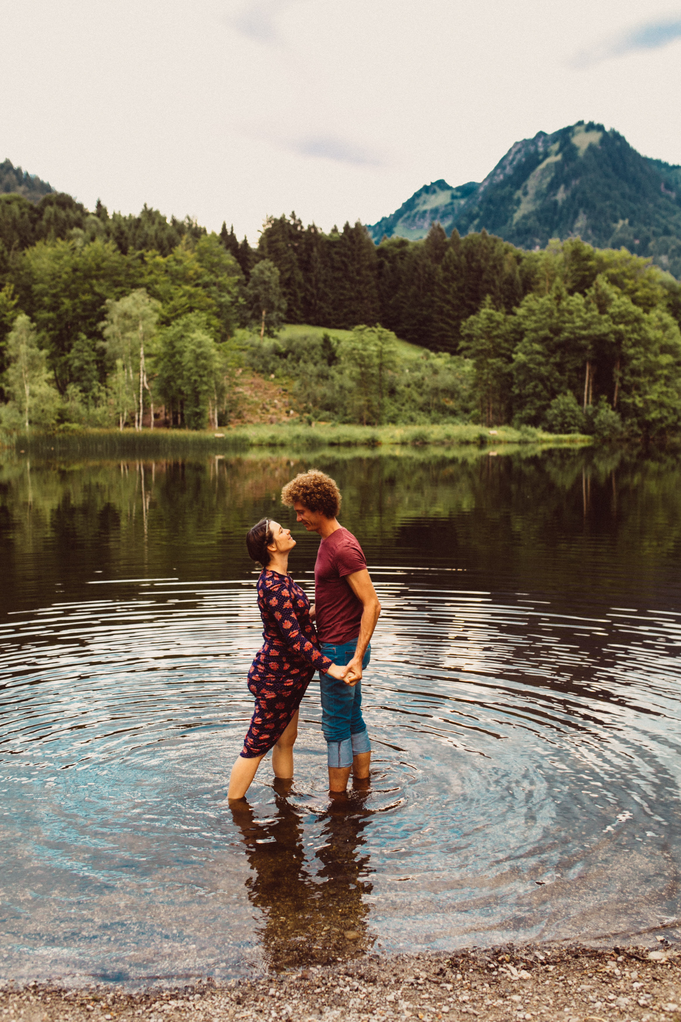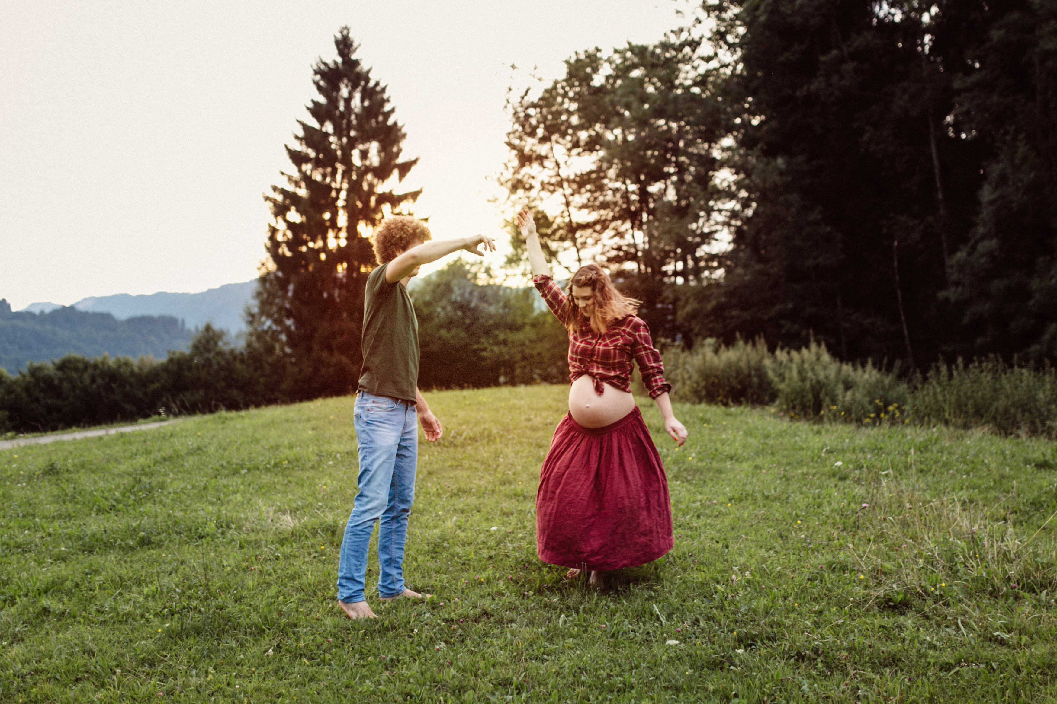 Die beiden kamen zu mir nach Oberstdorf, wir tranken einen Tee und fuhren los. Nach einem kleinen Fußmarsch erreichten wir den still gelegenen Weiher inmitten meiner neuer Heimat. Während die Sonne langsam unterging und kein Mensch weit und breit diesen Platz besuchte, verbrachten wir fast zwei gemütliche Stunden dort oben zusammen. Sophias Babybäuchlein wurde mit den drei genialen Outfits super in den Mittelpunkt gestellt. Einmal das blaue Vintage Kleid ihrer Oma, einmal das Bauchfreie, karierte Hemd mit roten Rock.Und am Ende noch das schöne, schwarz – lila Spitzentop dazu. Ich liebe, liebe, liebe deren Style. So einfach und erdig und doch mit dem gewissen Etwas. So einzigartig diese Stimmung. So wunderschön die drei ♡♡♡