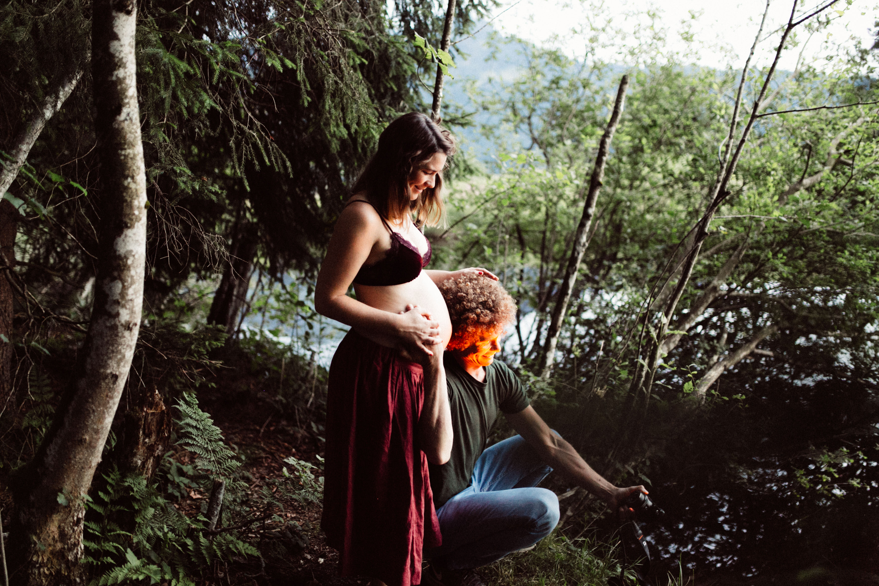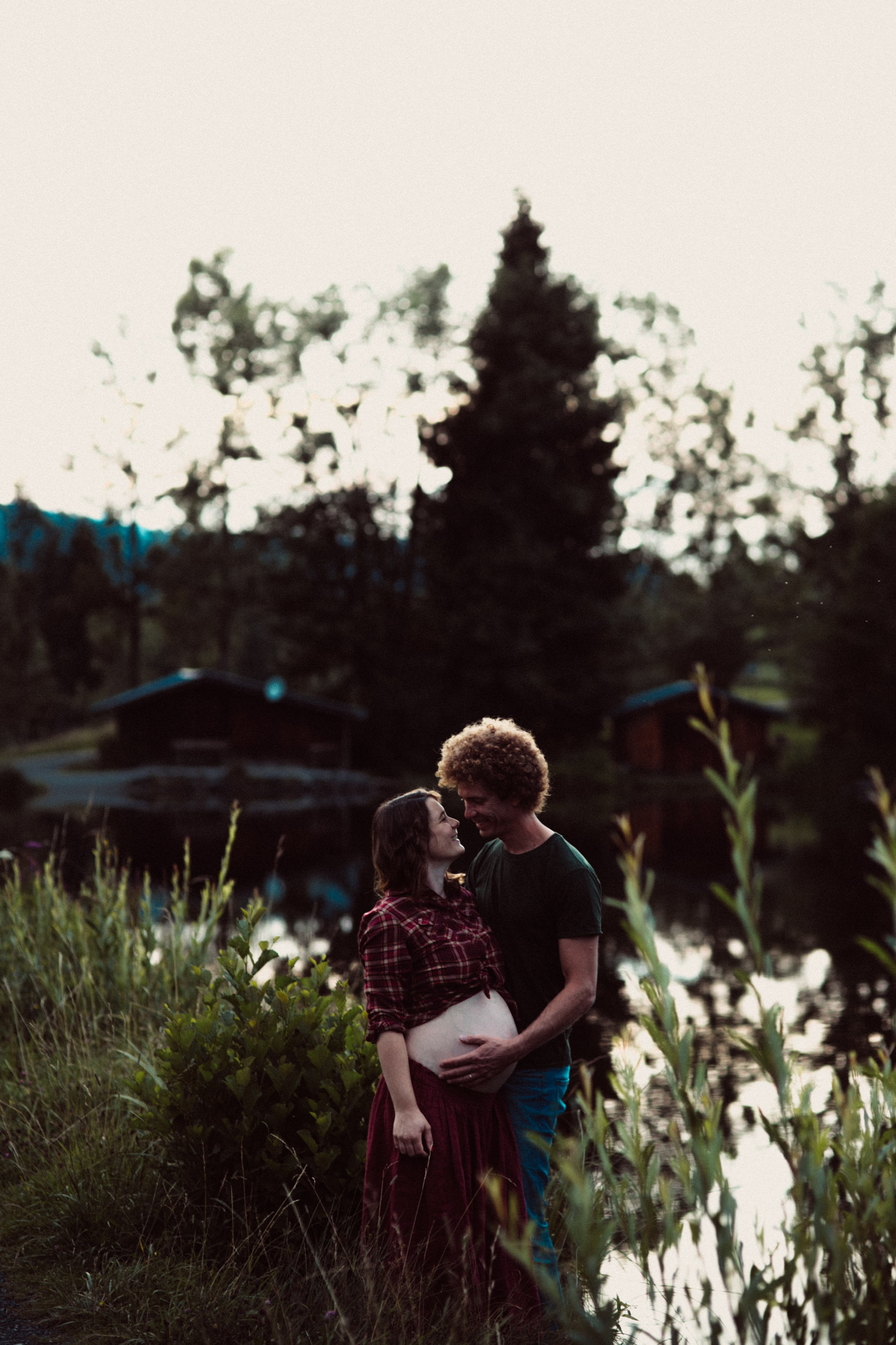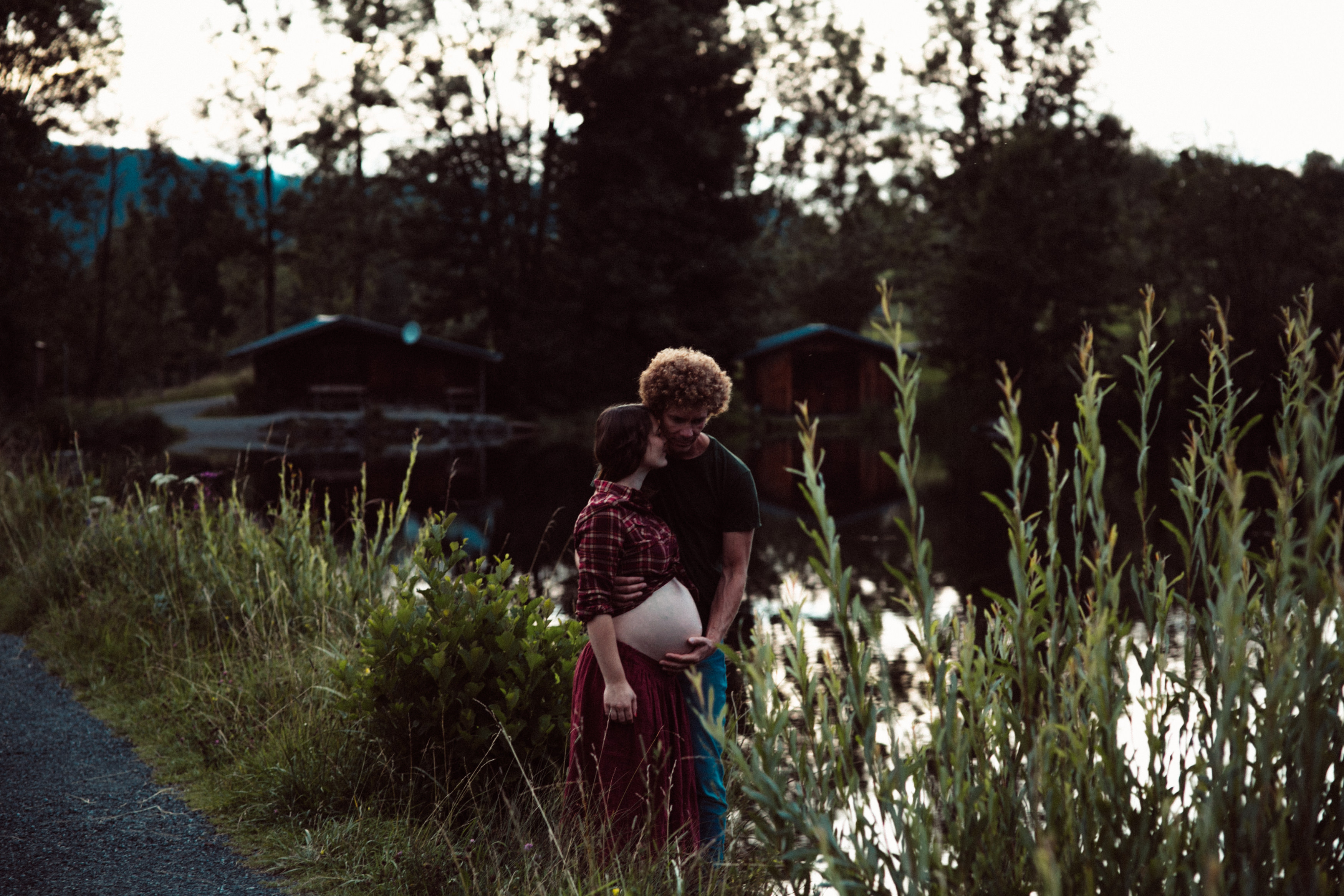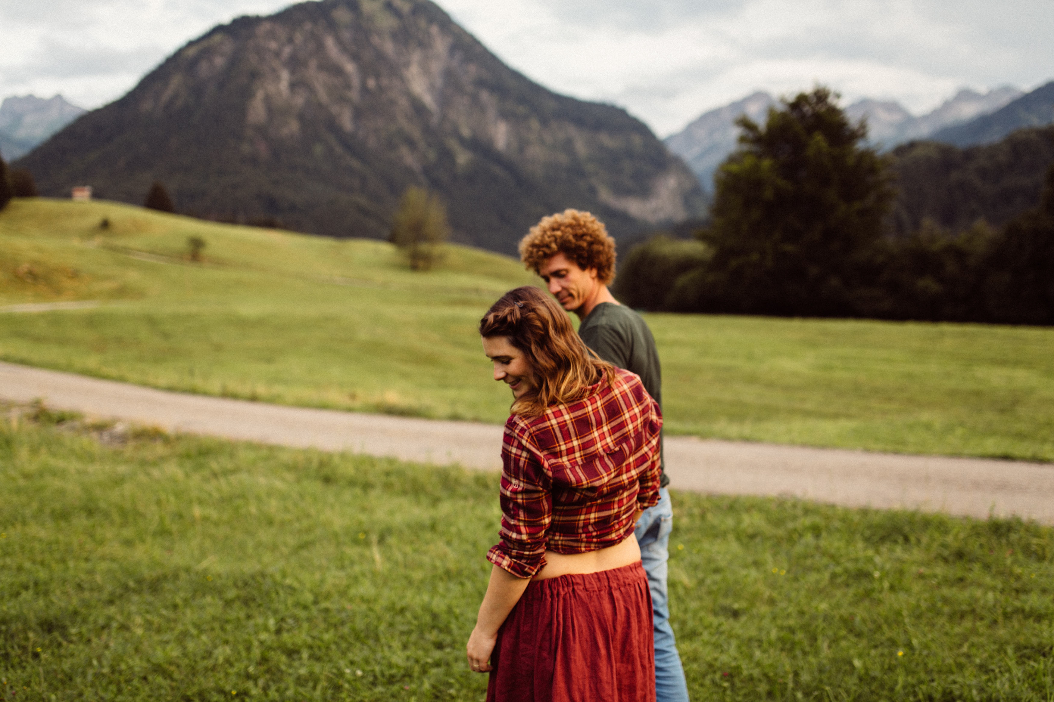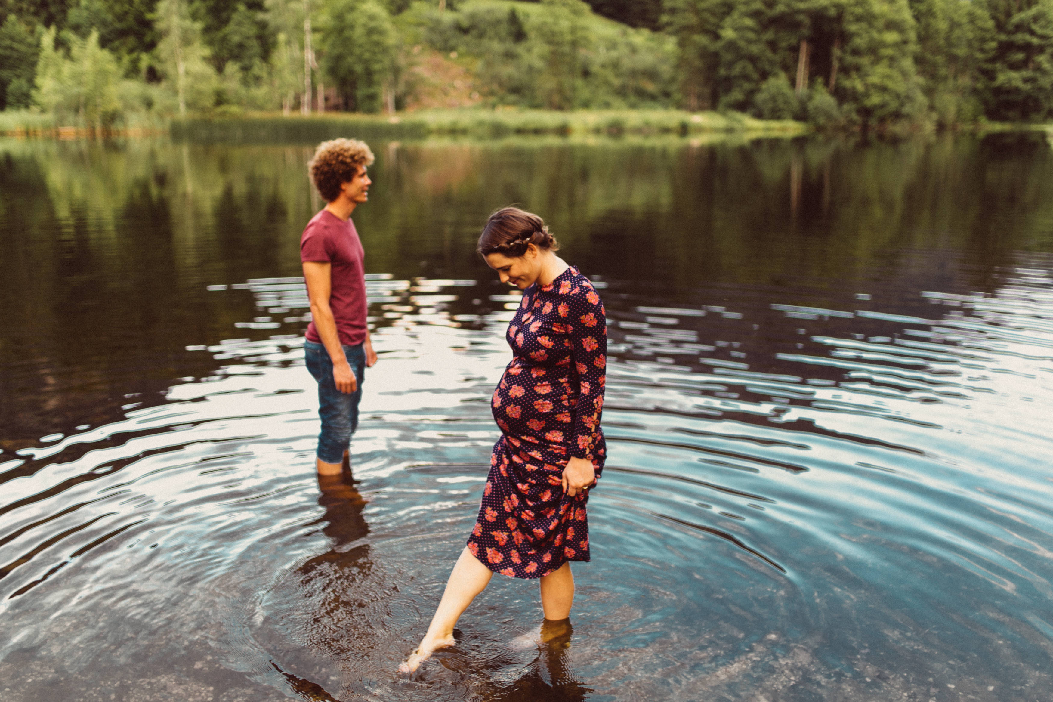 Die beiden kamen zu mir nach Oberstdorf, wir tranken einen Tee und fuhren los. Nach einem kleinen Fußmarsch erreichten wir den still gelegenen Weiher inmitten meiner neuer Heimat. Während die Sonne langsam unterging und kein Mensch weit und breit diesen Platz besuchte, verbrachten wir fast zwei gemütliche Stunden dort oben zusammen. Sophias Babybäuchlein wurde mit den drei genialen Outfits super in den Mittelpunkt gestellt. Einmal das blaue Vintage Kleid ihrer Oma, einmal das Bauchfreie, karierte Hemd mit roten Rock.Und am Ende noch das schöne, schwarz – lila Spitzentop dazu. Ich liebe, liebe, liebe deren Style. So einfach und erdig und doch mit dem gewissen Etwas. So einzigartig diese Stimmung. So wunderschön die drei ♡♡♡