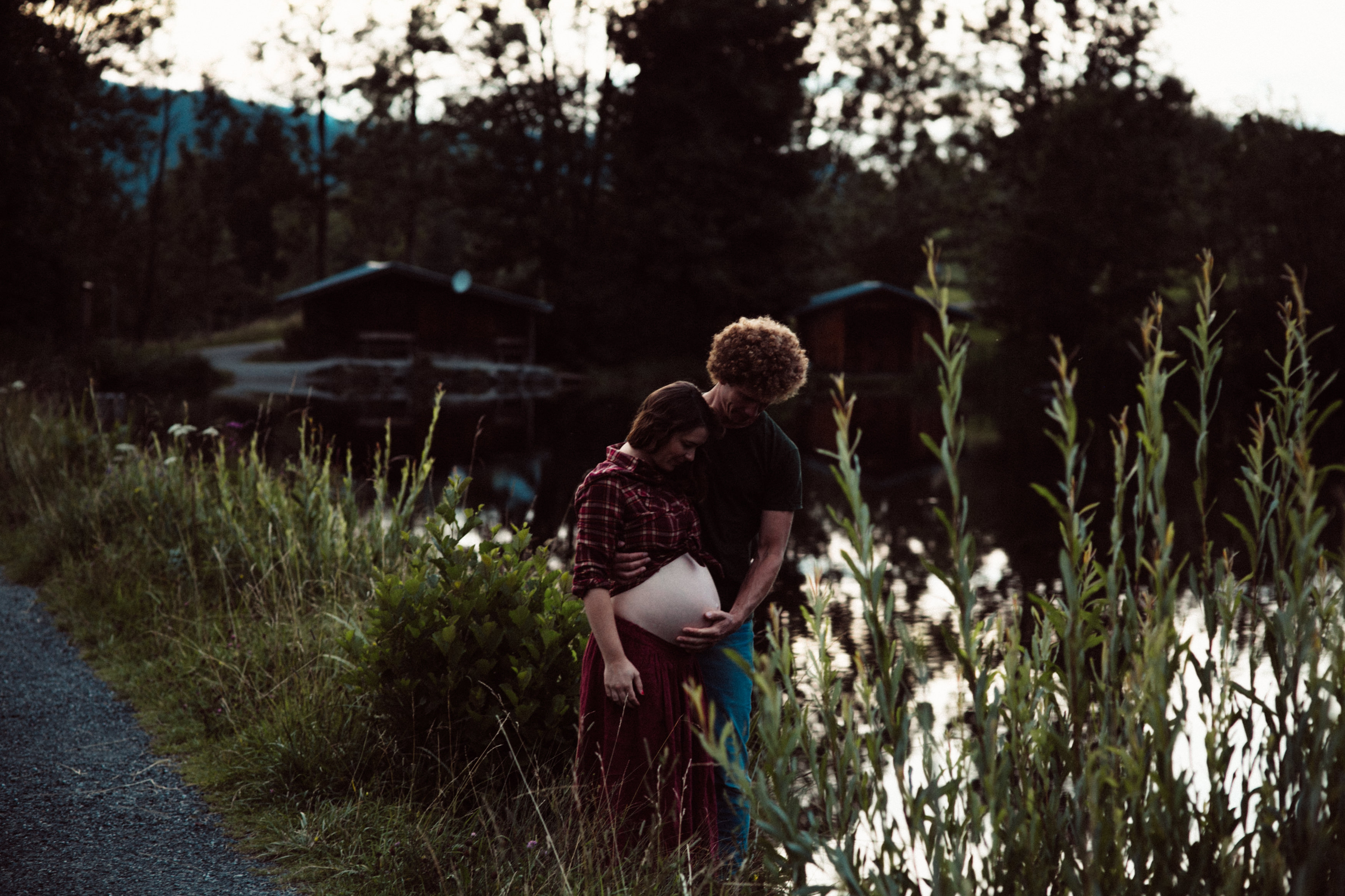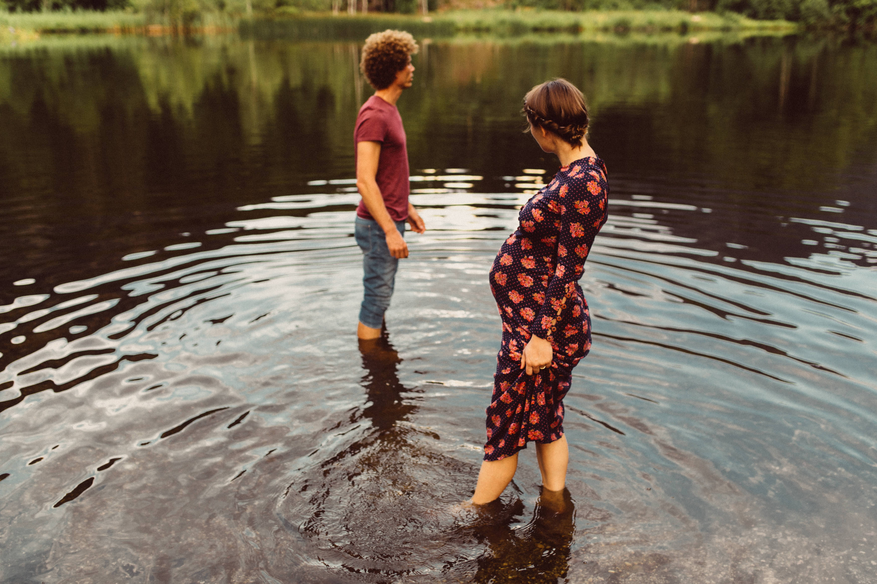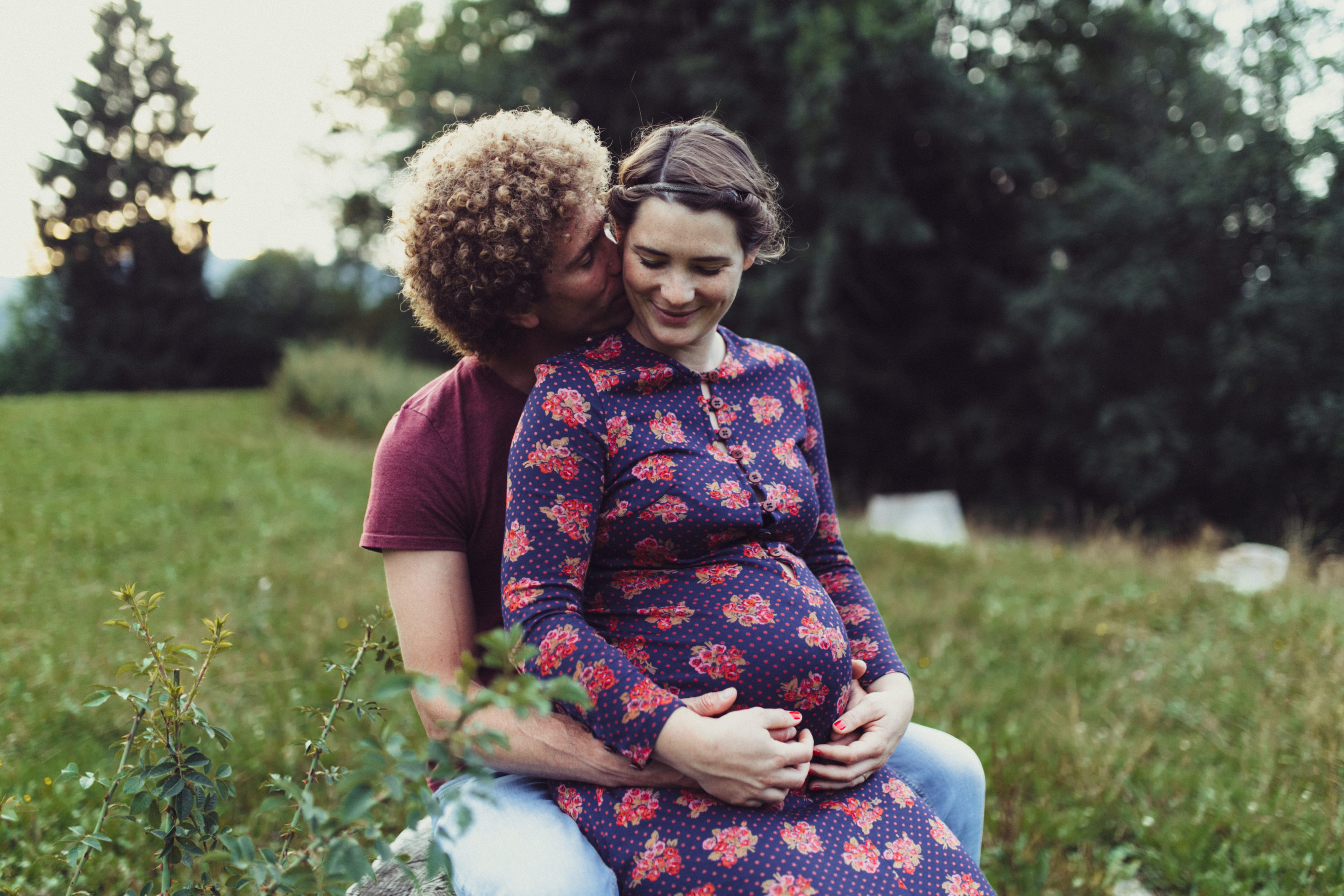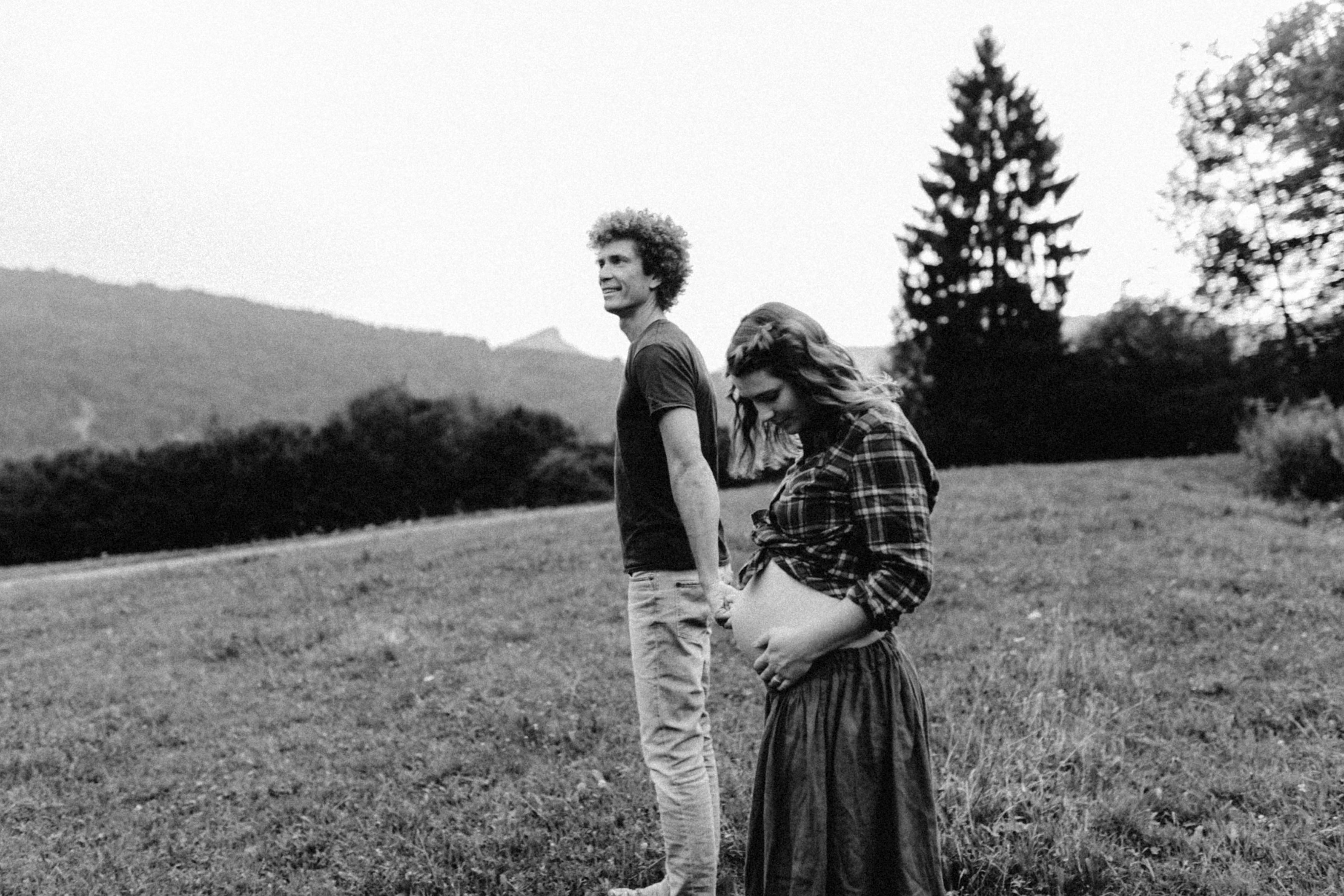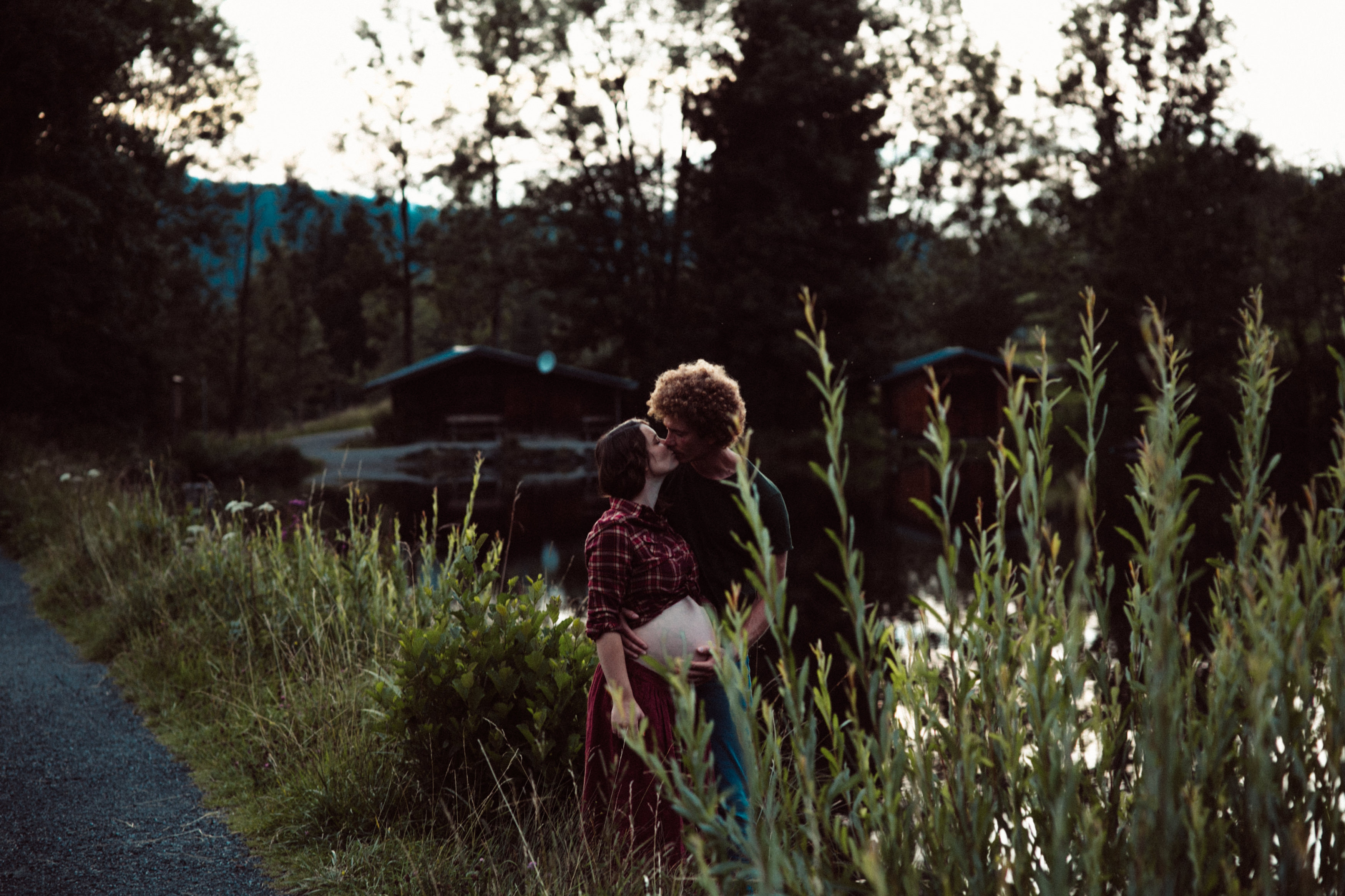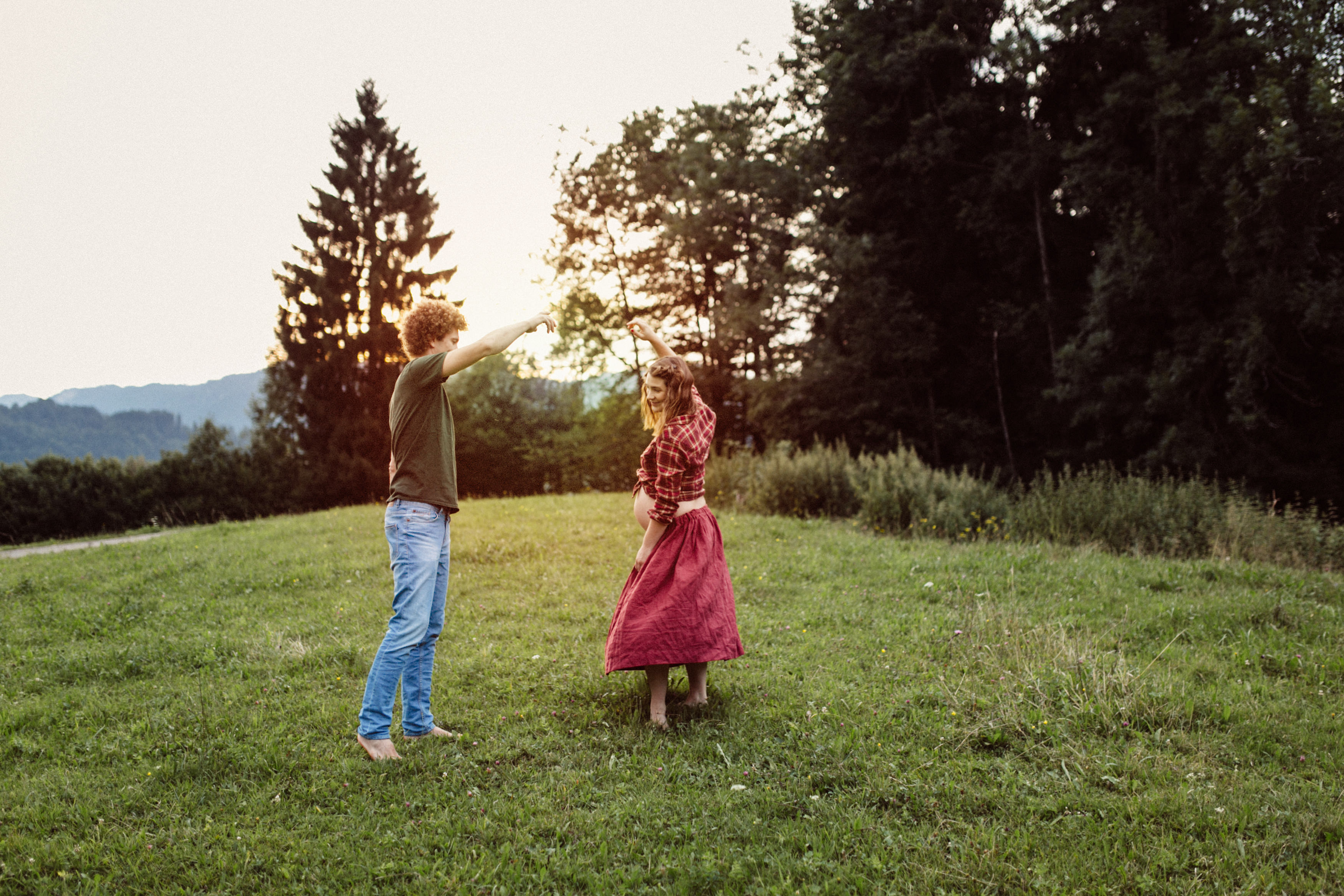 Die beiden kamen zu mir nach Oberstdorf, wir tranken einen Tee und fuhren los. Nach einem kleinen Fußmarsch erreichten wir den still gelegenen Weiher inmitten meiner neuer Heimat. Während die Sonne langsam unterging und kein Mensch weit und breit diesen Platz besuchte, verbrachten wir fast zwei gemütliche Stunden dort oben zusammen. Sophias Babybäuchlein wurde mit den drei genialen Outfits super in den Mittelpunkt gestellt. Einmal das blaue Vintage Kleid ihrer Oma, einmal das Bauchfreie, karierte Hemd mit roten Rock.Und am Ende noch das schöne, schwarz – lila Spitzentop dazu. Ich liebe, liebe, liebe deren Style. So einfach und erdig und doch mit dem gewissen Etwas. So einzigartig diese Stimmung. So wunderschön die drei ♡♡♡