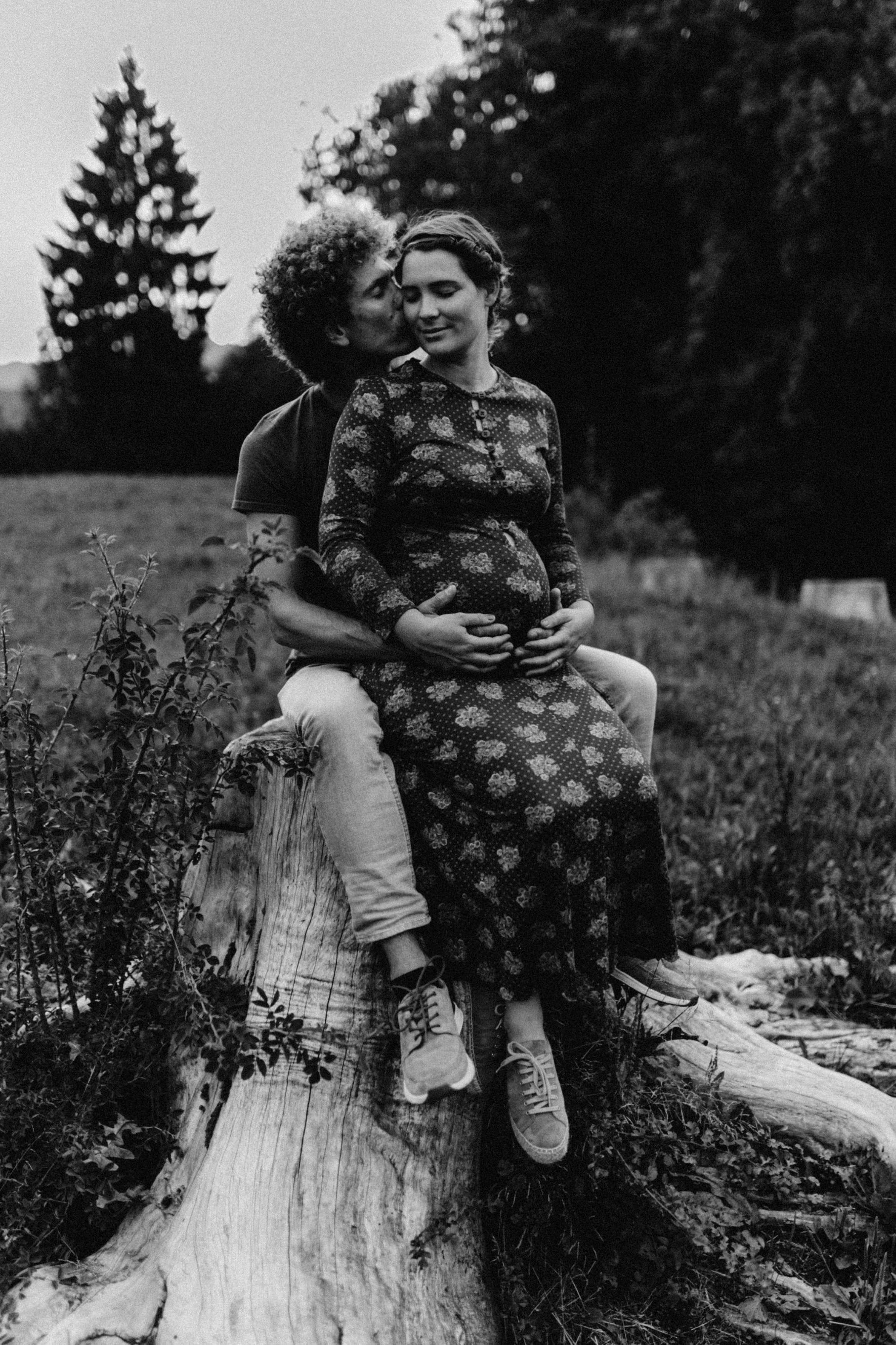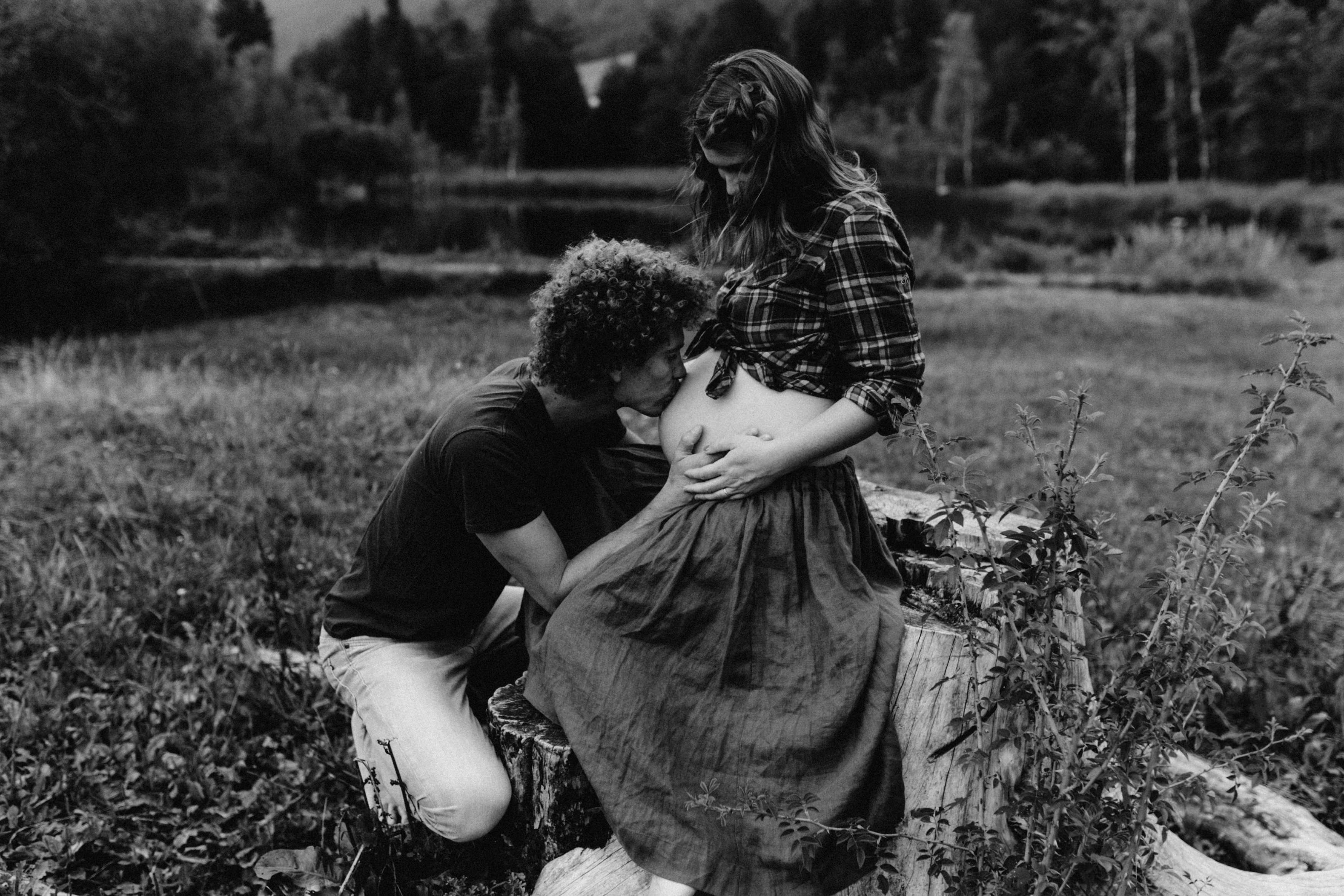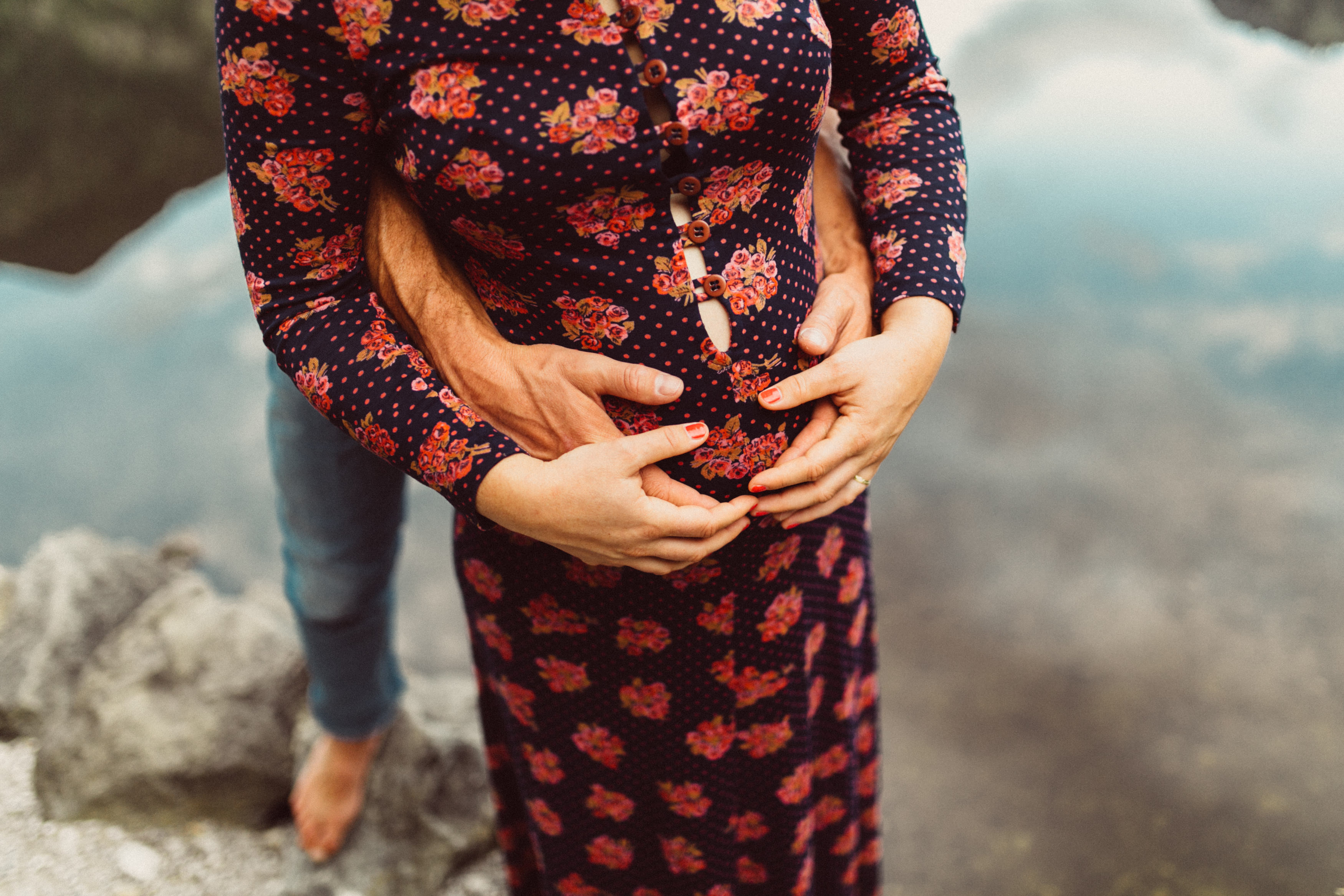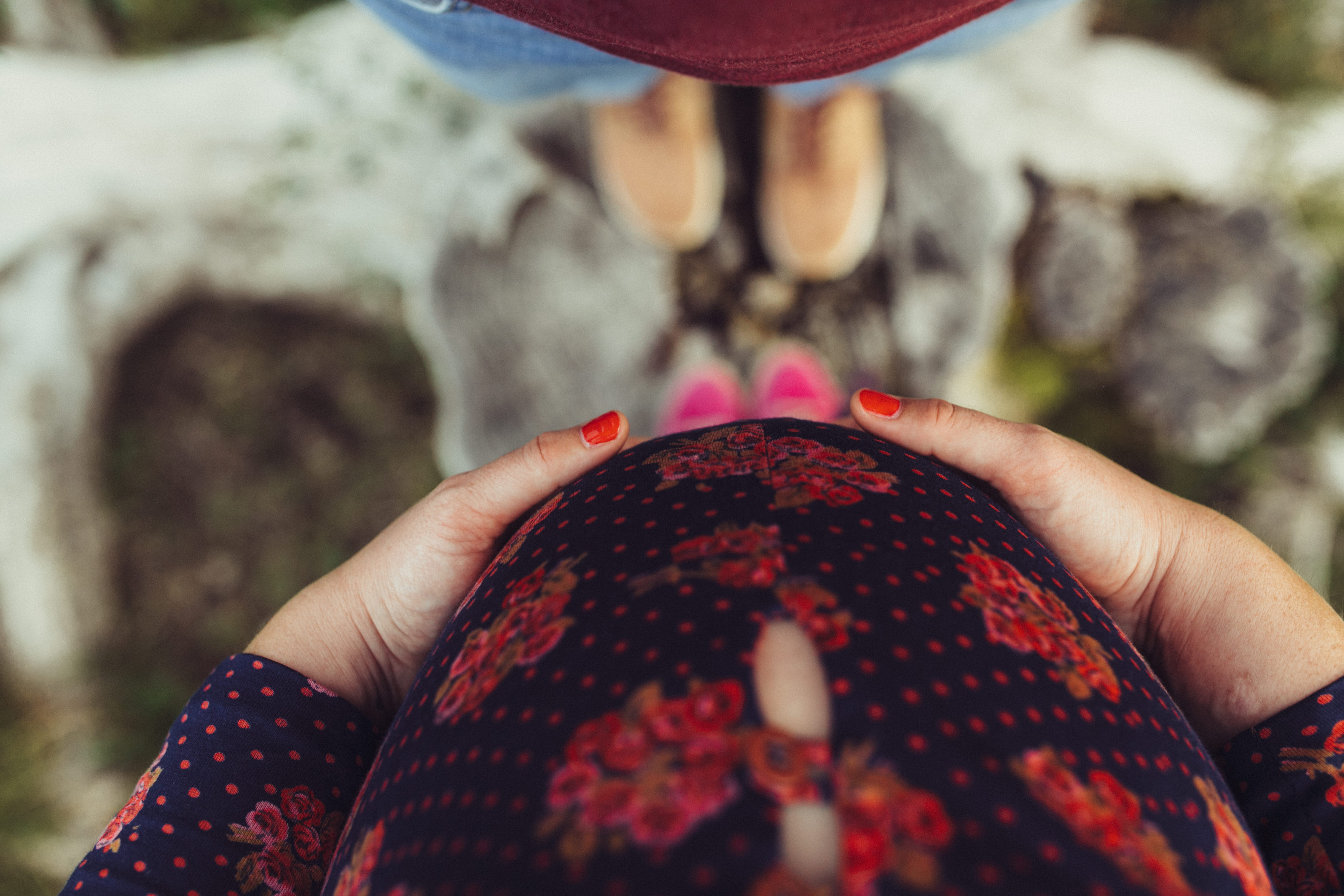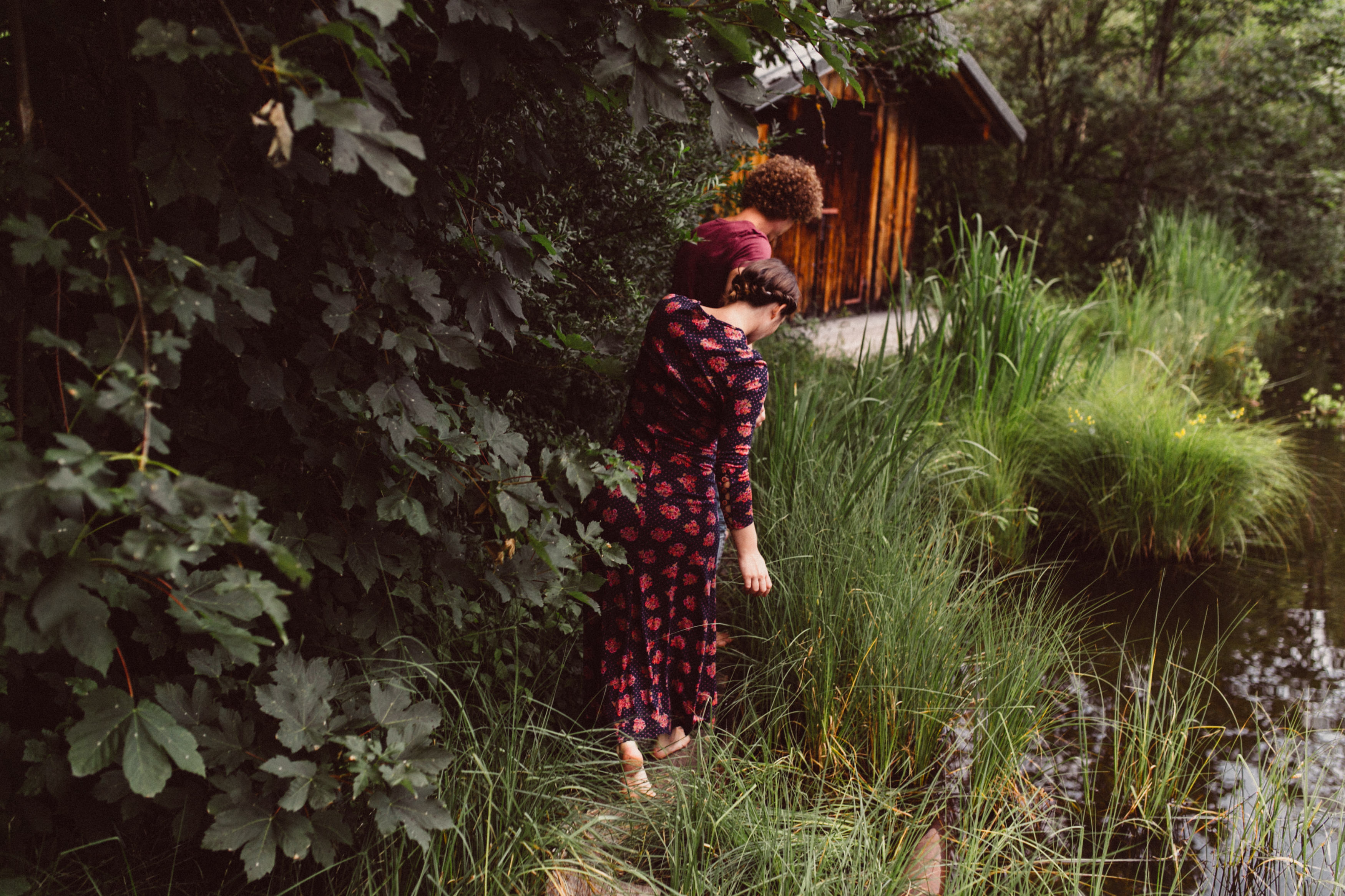 Die beiden kamen zu mir nach Oberstdorf, wir tranken einen Tee und fuhren los. Nach einem kleinen Fußmarsch erreichten wir den still gelegenen Weiher inmitten meiner neuer Heimat. Während die Sonne langsam unterging und kein Mensch weit und breit diesen Platz besuchte, verbrachten wir fast zwei gemütliche Stunden dort oben zusammen. Sophias Babybäuchlein wurde mit den drei genialen Outfits super in den Mittelpunkt gestellt. Einmal das blaue Vintage Kleid ihrer Oma, einmal das Bauchfreie, karierte Hemd mit roten Rock.Und am Ende noch das schöne, schwarz – lila Spitzentop dazu. Ich liebe, liebe, liebe deren Style. So einfach und erdig und doch mit dem gewissen Etwas. So einzigartig diese Stimmung. So wunderschön die drei ♡♡♡