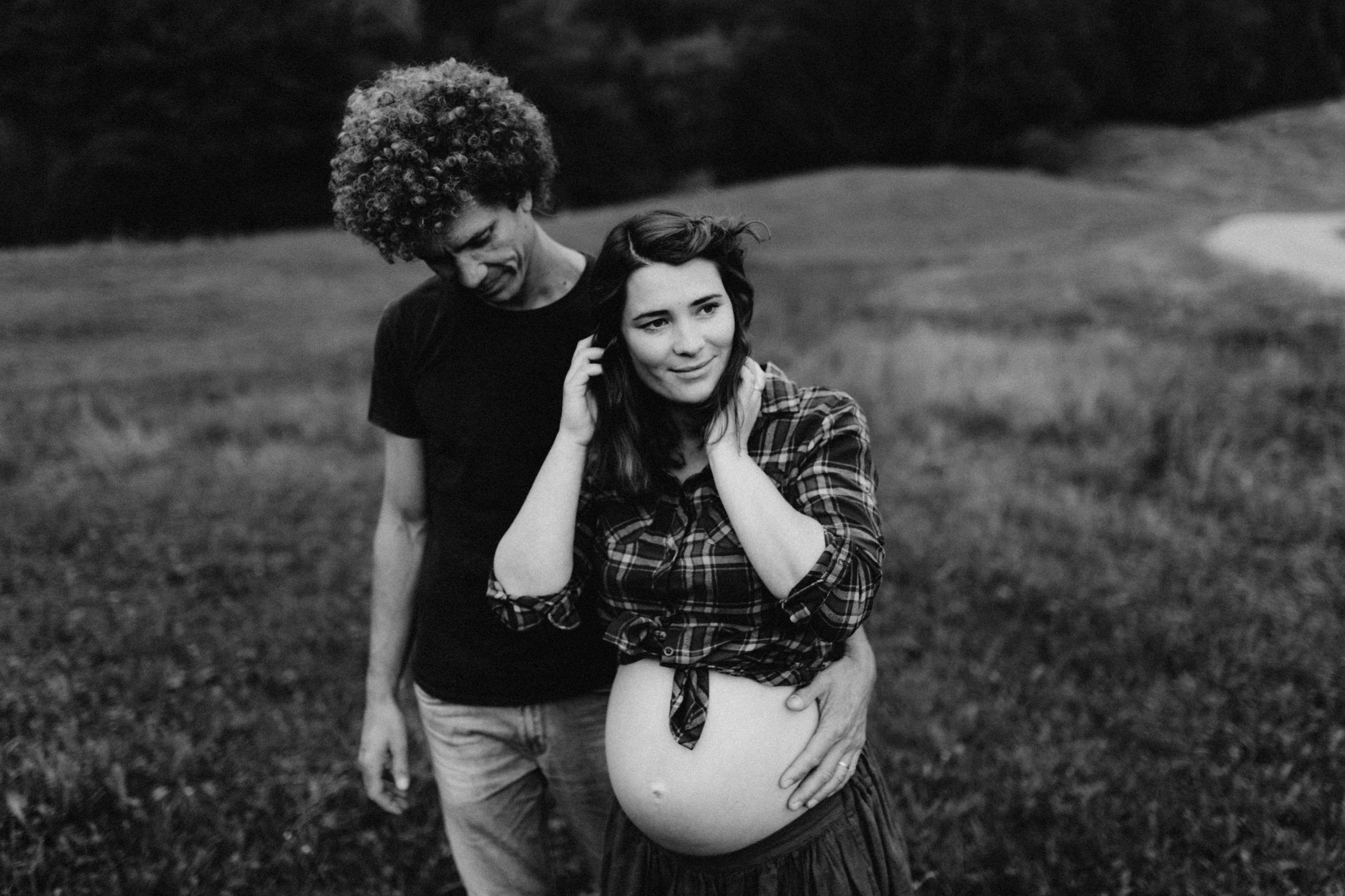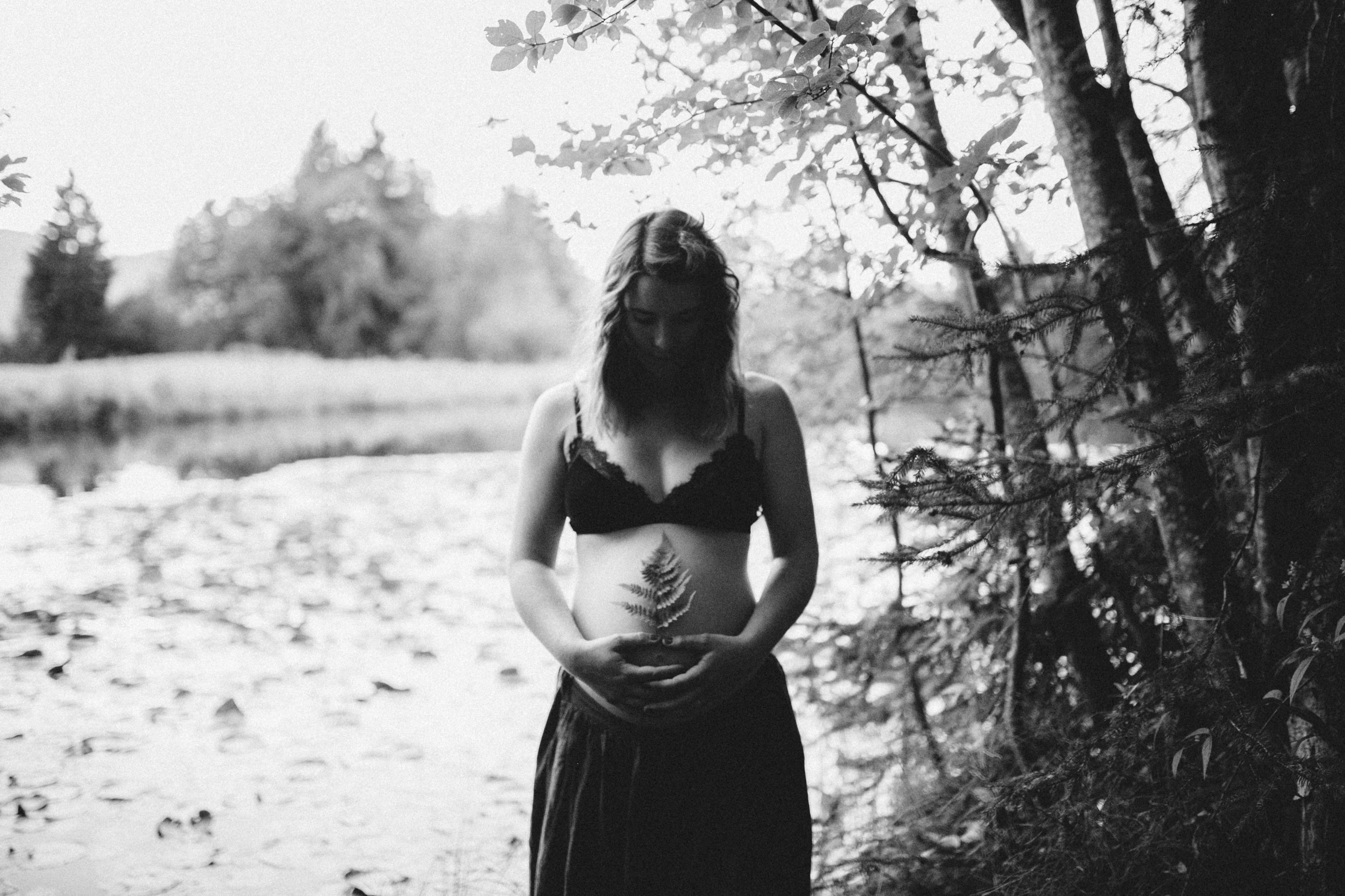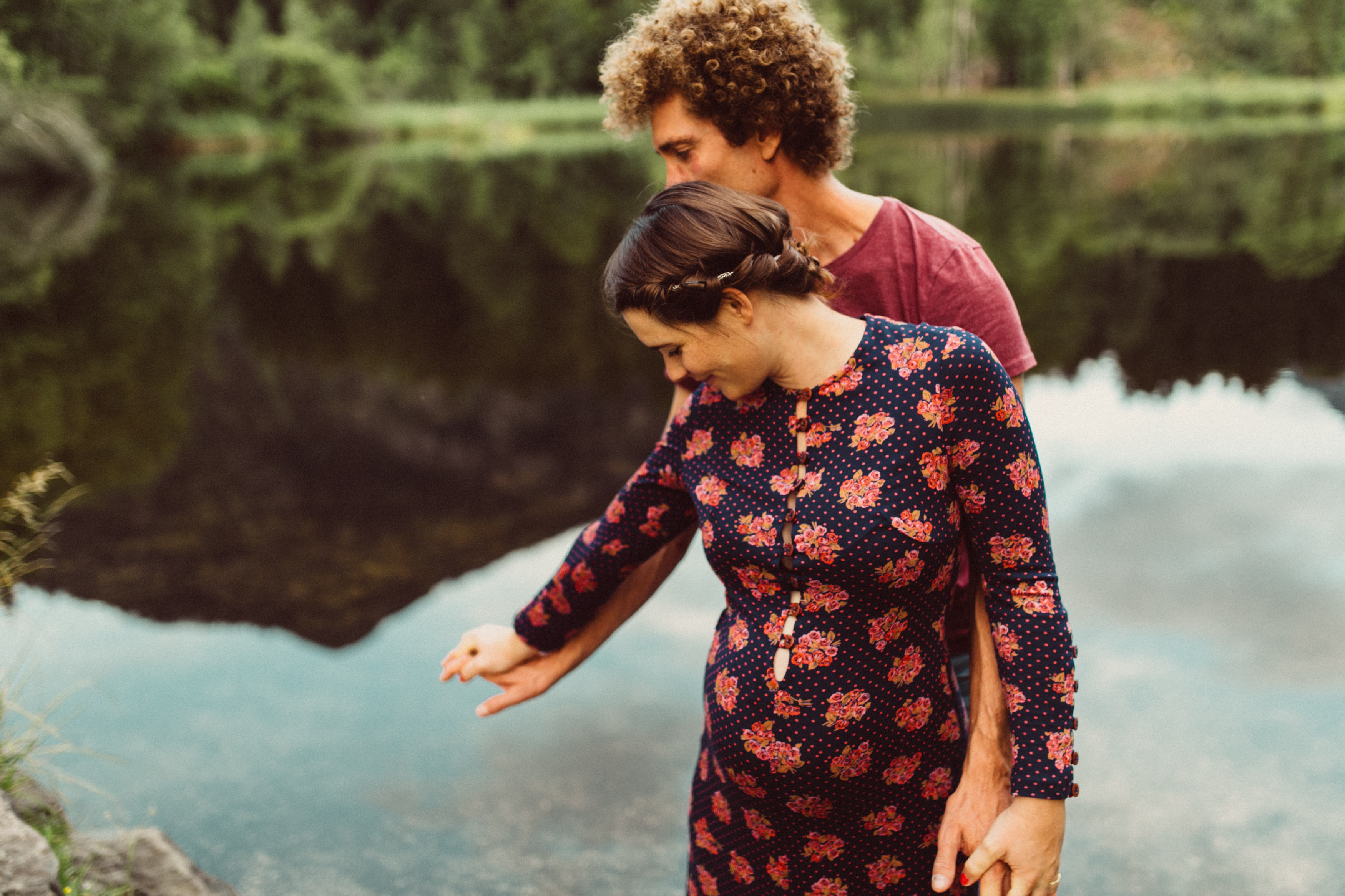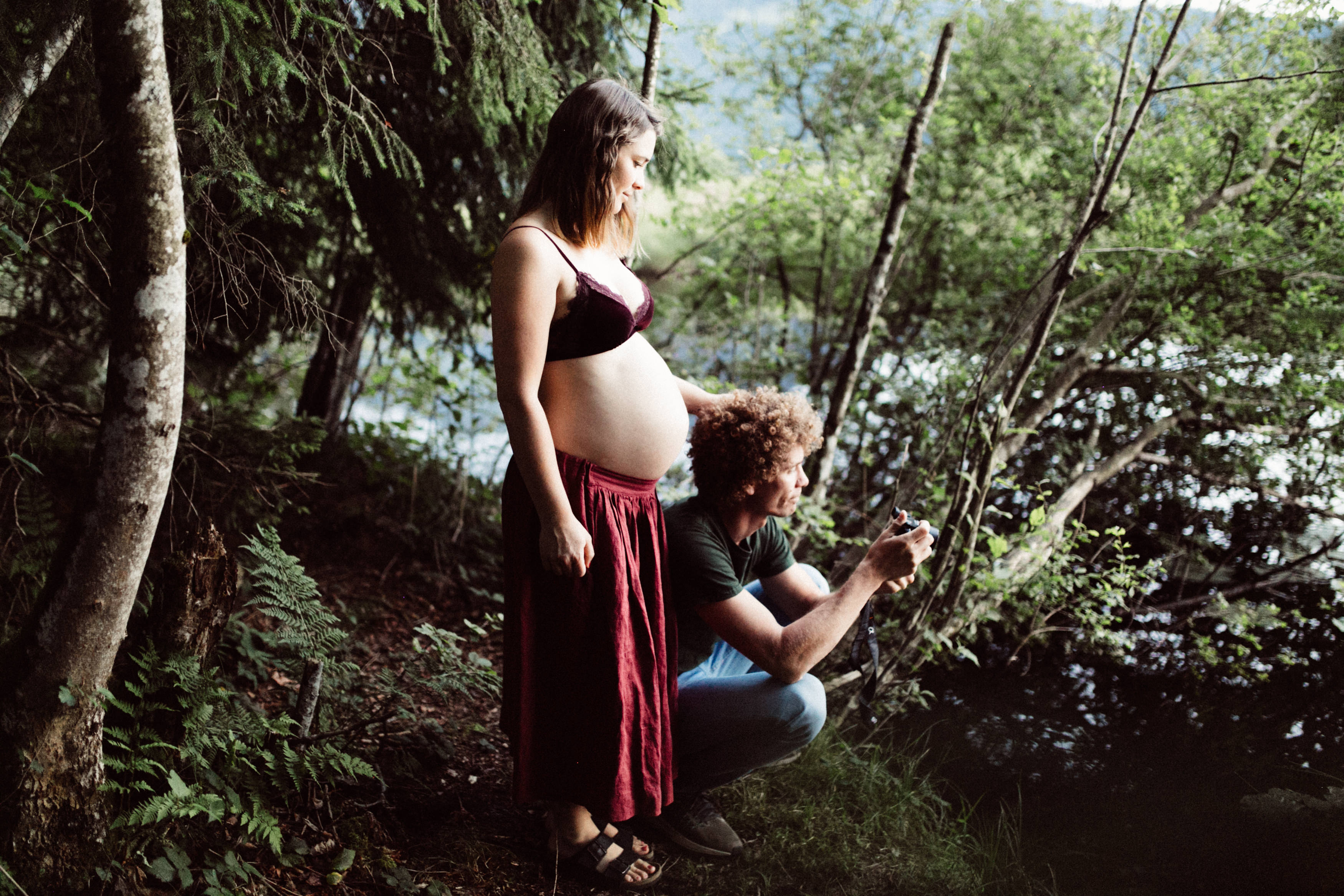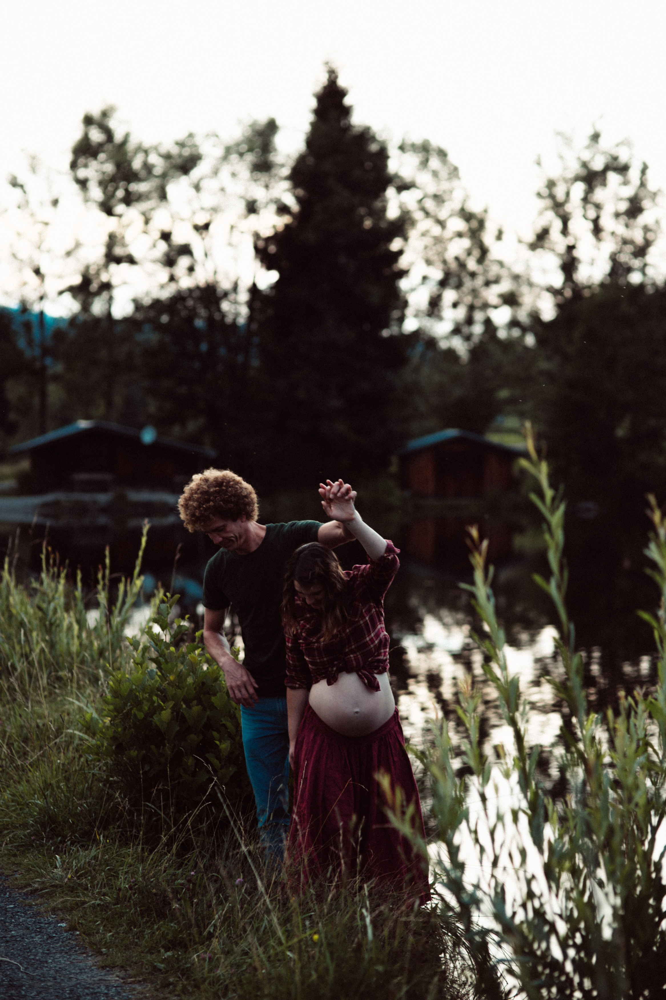 Die beiden kamen zu mir nach Oberstdorf, wir tranken einen Tee und fuhren los. Nach einem kleinen Fußmarsch erreichten wir den still gelegenen Weiher inmitten meiner neuer Heimat. Während die Sonne langsam unterging und kein Mensch weit und breit diesen Platz besuchte, verbrachten wir fast zwei gemütliche Stunden dort oben zusammen. Sophias Babybäuchlein wurde mit den drei genialen Outfits super in den Mittelpunkt gestellt. Einmal das blaue Vintage Kleid ihrer Oma, einmal das Bauchfreie, karierte Hemd mit roten Rock.Und am Ende noch das schöne, schwarz – lila Spitzentop dazu. Ich liebe, liebe, liebe deren Style. So einfach und erdig und doch mit dem gewissen Etwas. So einzigartig diese Stimmung. So wunderschön die drei ♡♡♡