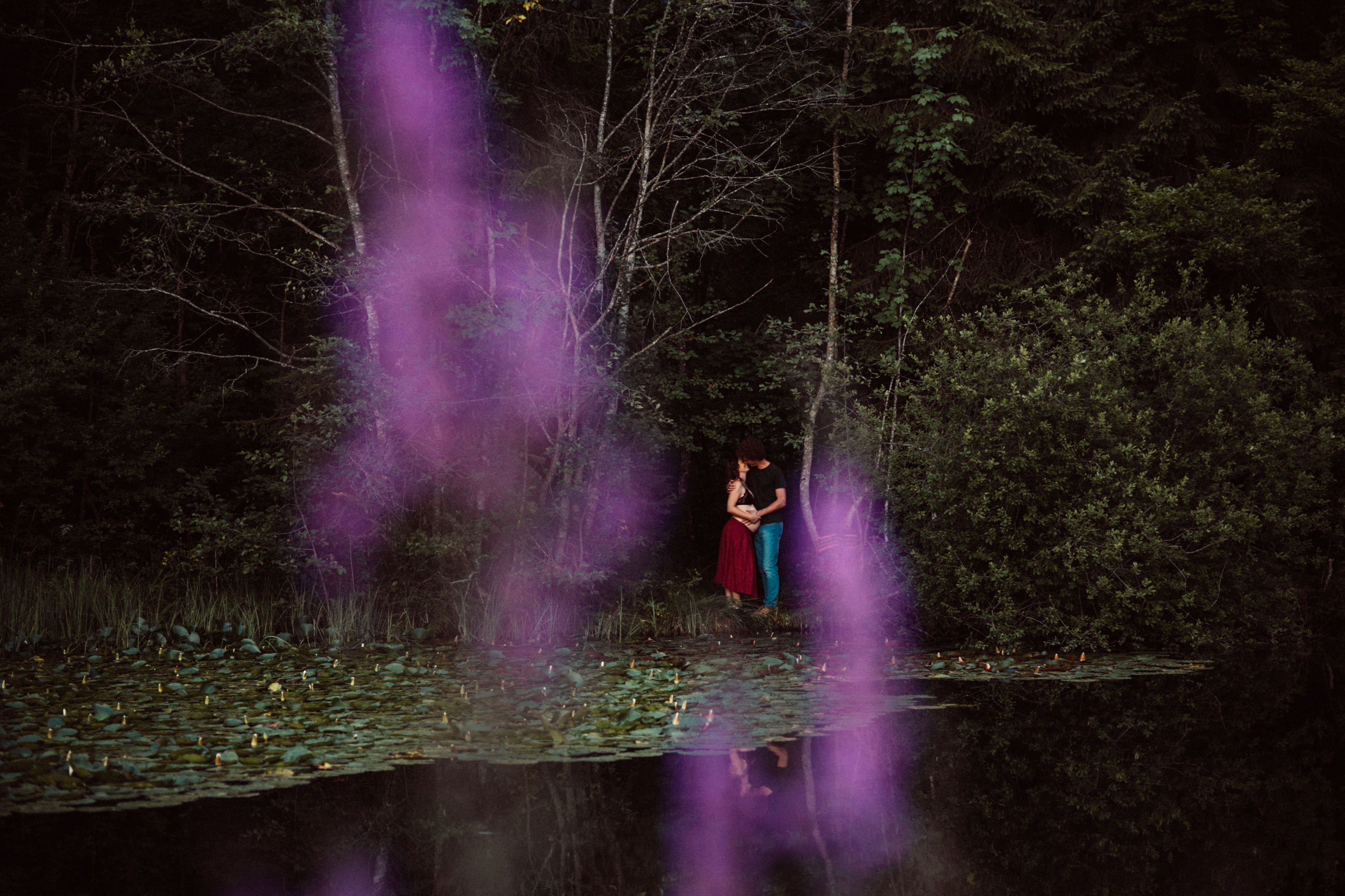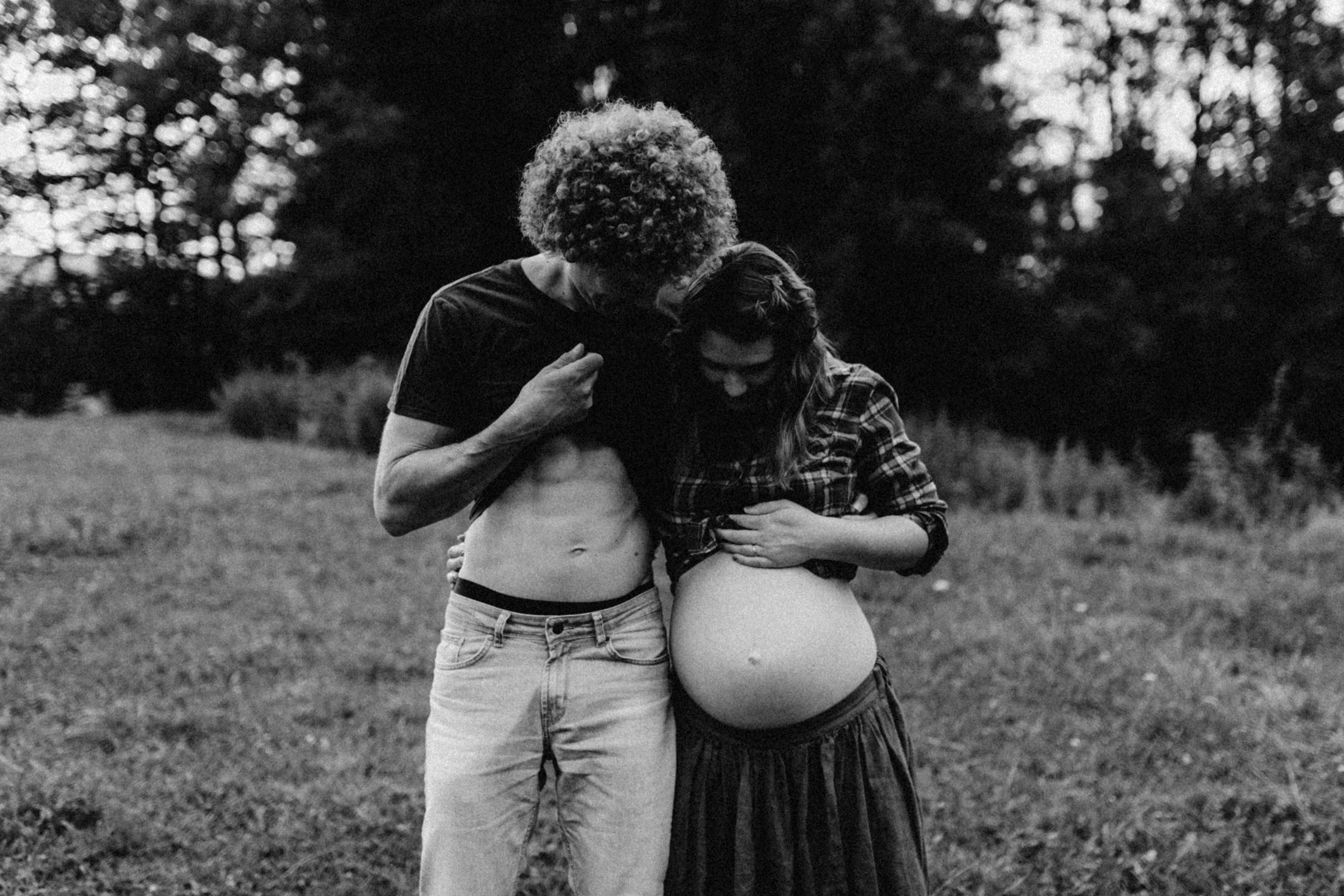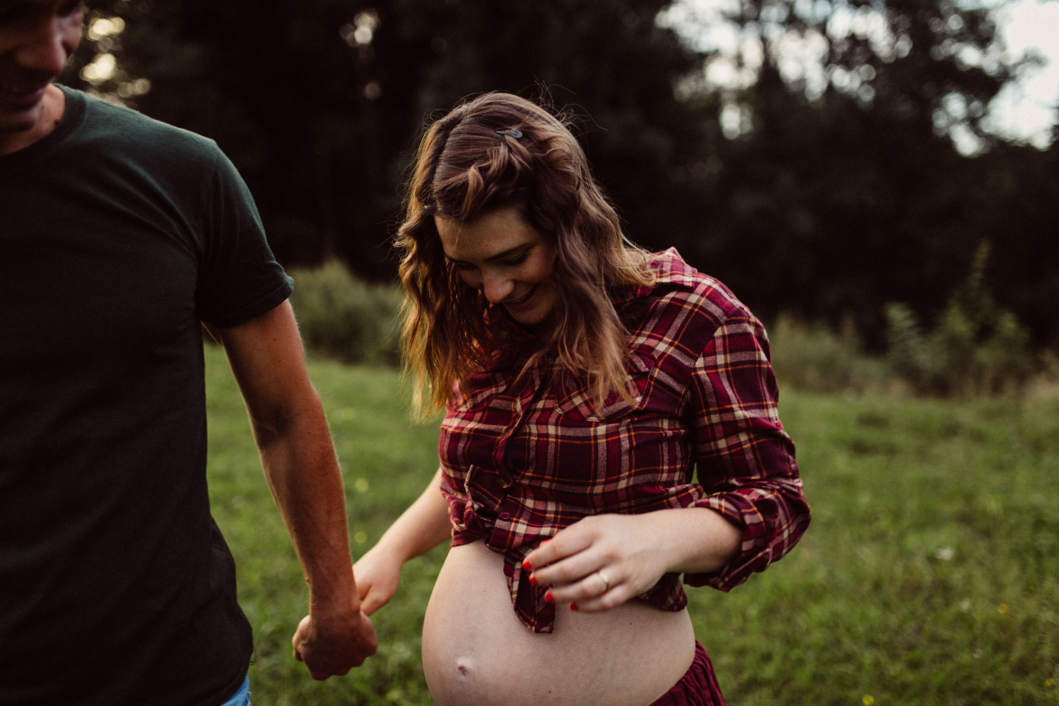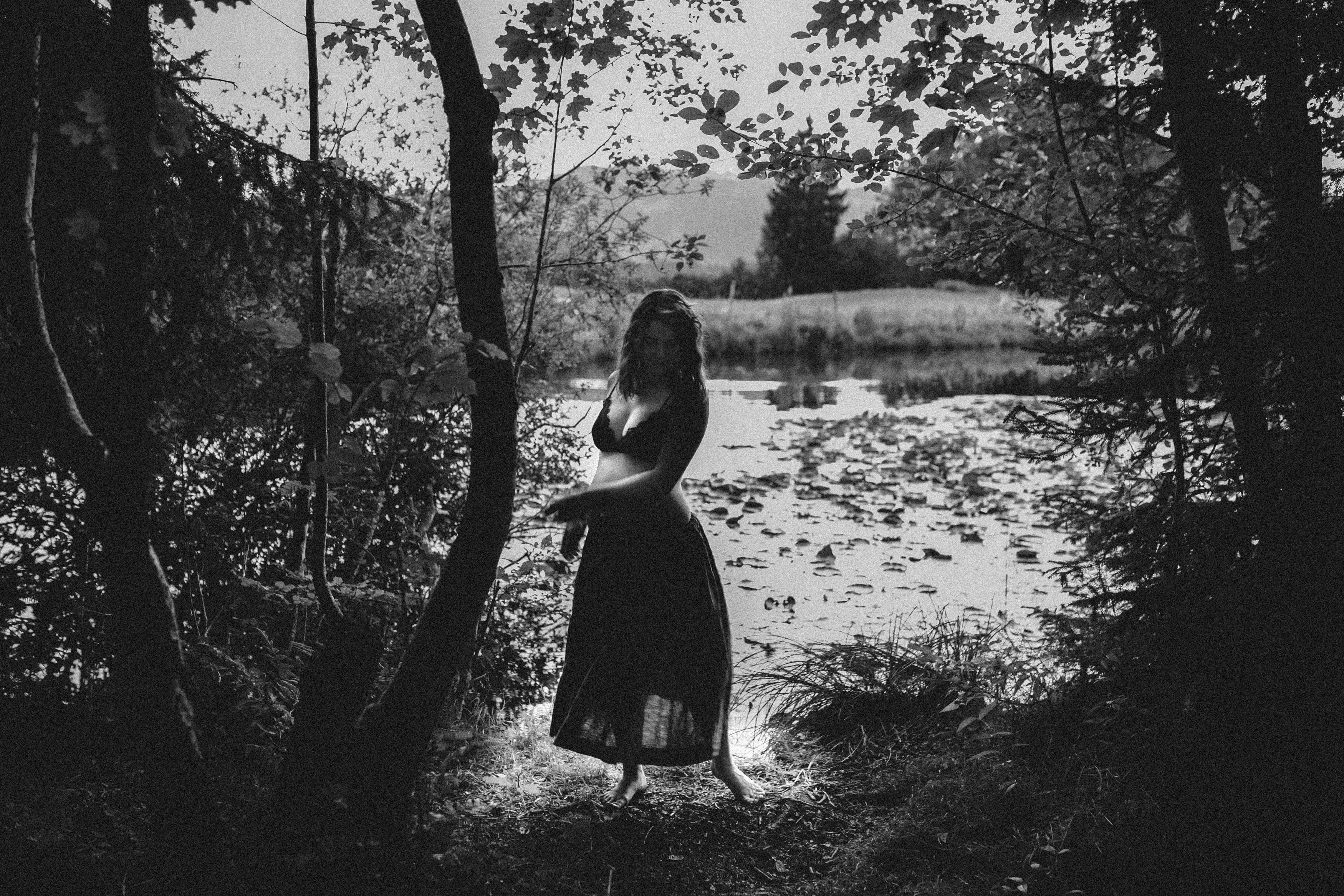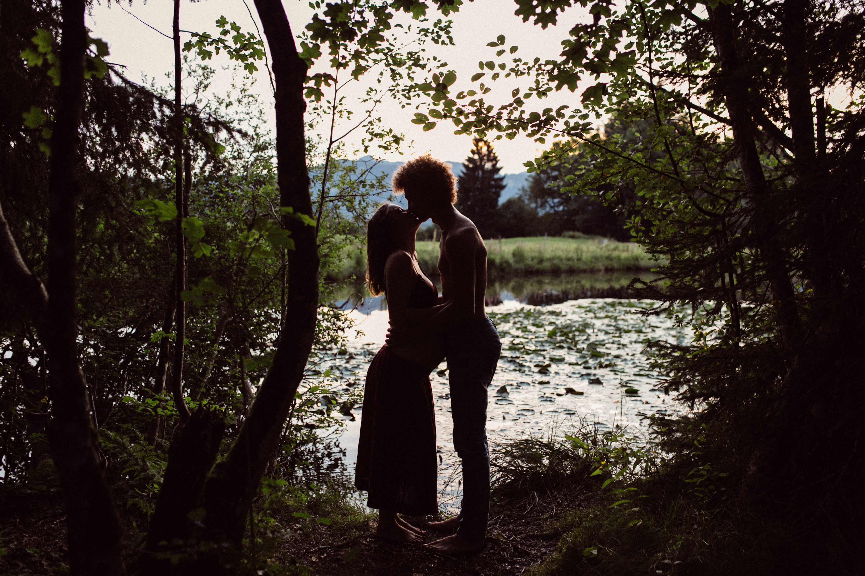 Die beiden kamen zu mir nach Oberstdorf, wir tranken einen Tee und fuhren los. Nach einem kleinen Fußmarsch erreichten wir den still gelegenen Weiher inmitten meiner neuer Heimat. Während die Sonne langsam unterging und kein Mensch weit und breit diesen Platz besuchte, verbrachten wir fast zwei gemütliche Stunden dort oben zusammen. Sophias Babybäuchlein wurde mit den drei genialen Outfits super in den Mittelpunkt gestellt. Einmal das blaue Vintage Kleid ihrer Oma, einmal das Bauchfreie, karierte Hemd mit roten Rock.Und am Ende noch das schöne, schwarz – lila Spitzentop dazu. Ich liebe, liebe, liebe deren Style. So einfach und erdig und doch mit dem gewissen Etwas. So einzigartig diese Stimmung. So wunderschön die drei ♡♡♡