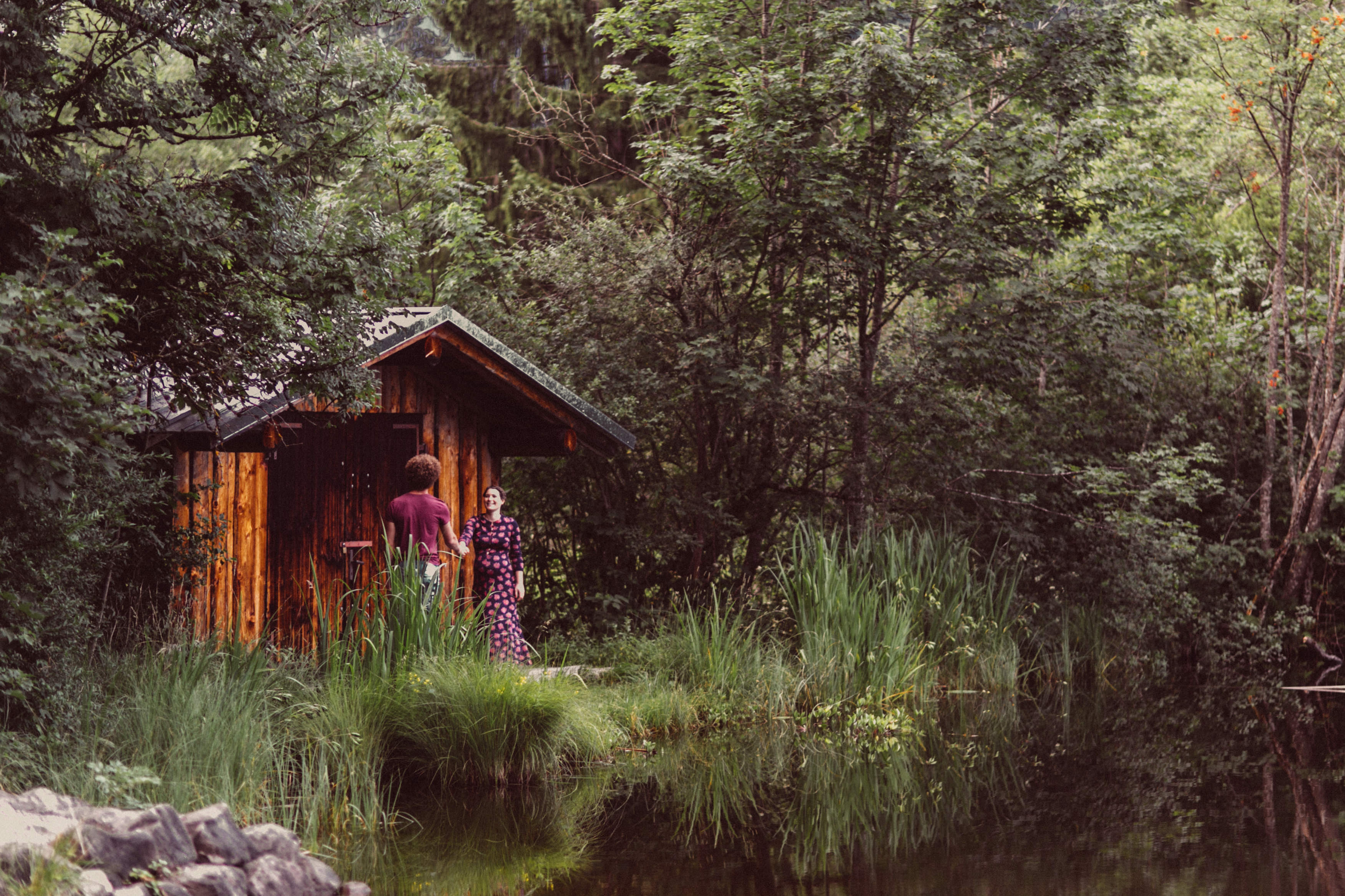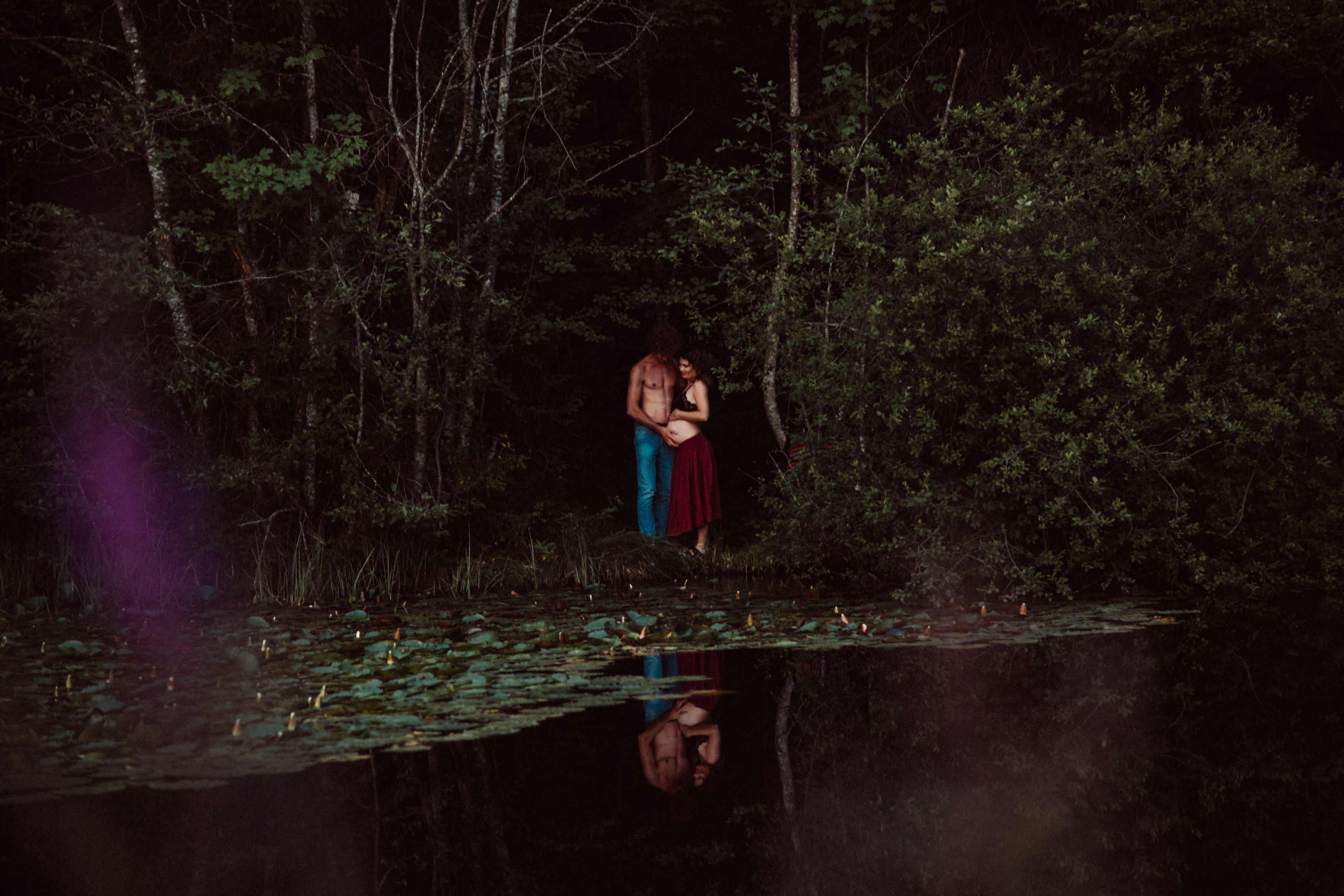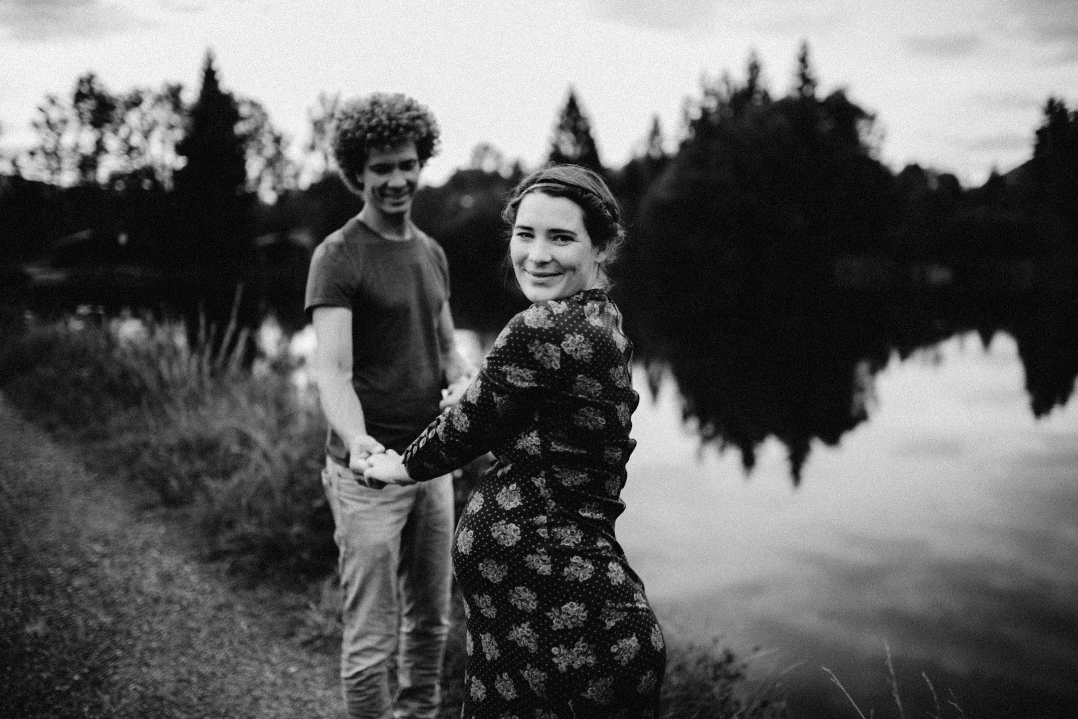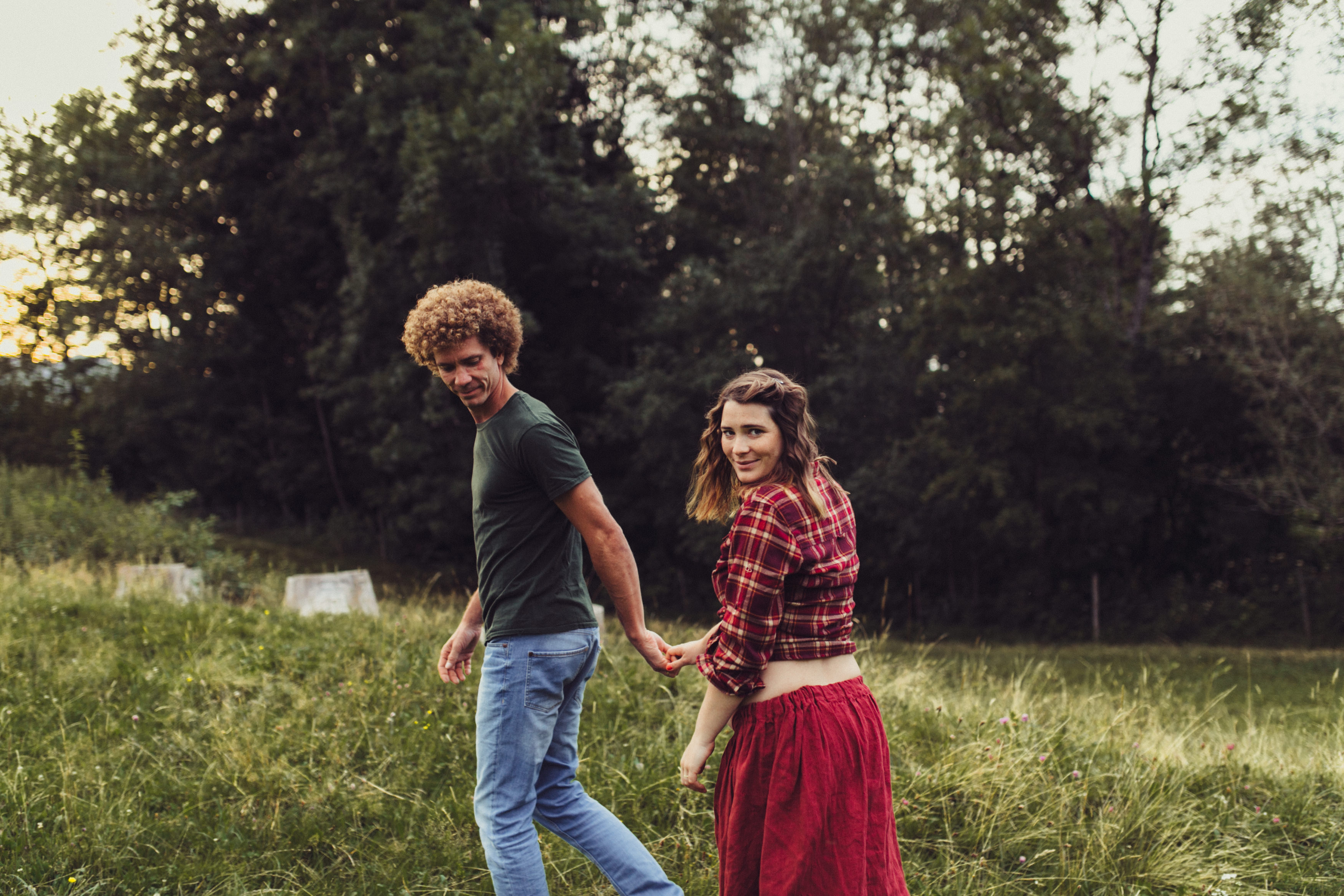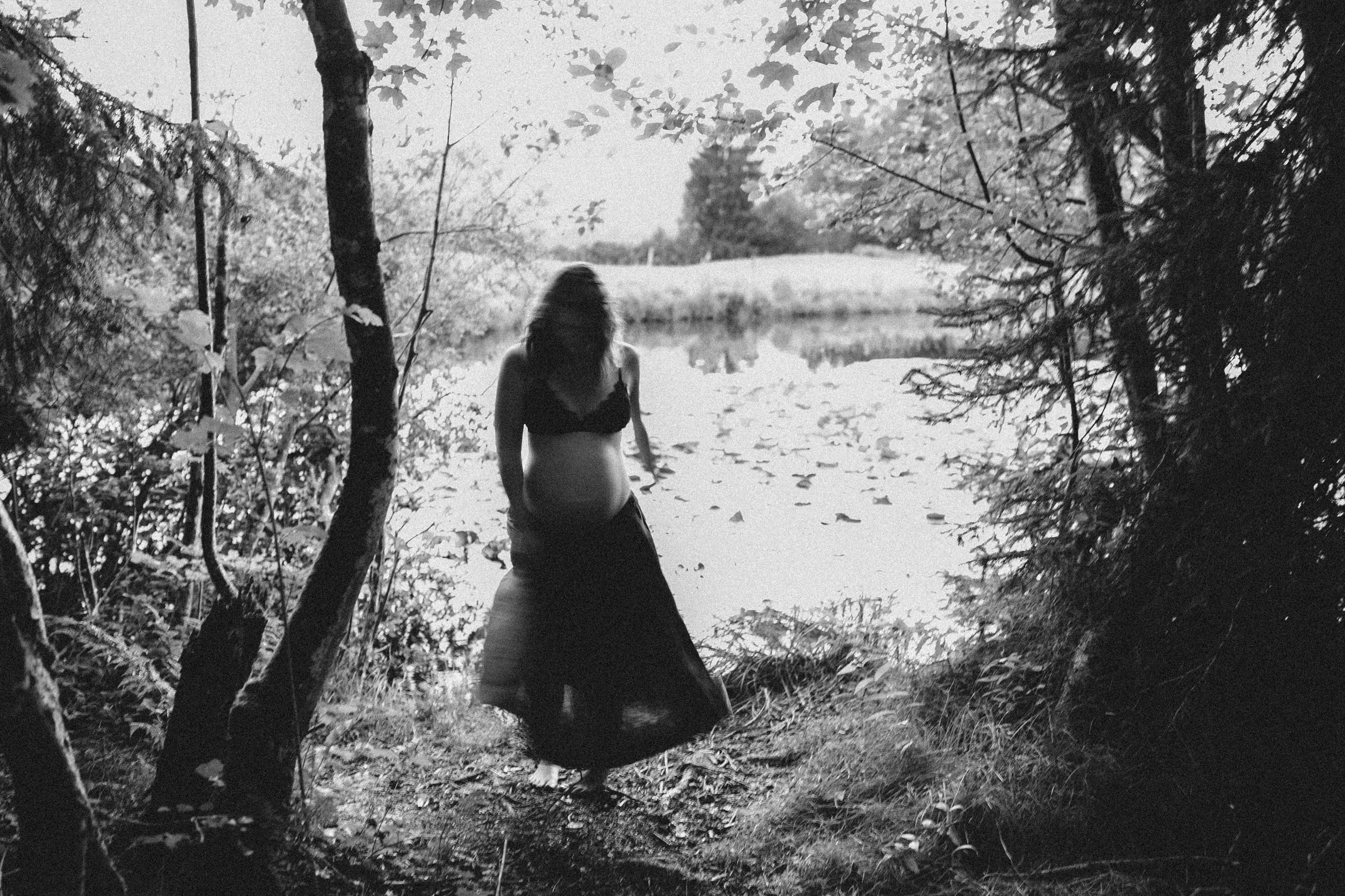 Die beiden kamen zu mir nach Oberstdorf, wir tranken einen Tee und fuhren los. Nach einem kleinen Fußmarsch erreichten wir den still gelegenen Weiher inmitten meiner neuer Heimat. Während die Sonne langsam unterging und kein Mensch weit und breit diesen Platz besuchte, verbrachten wir fast zwei gemütliche Stunden dort oben zusammen. Sophias Babybäuchlein wurde mit den drei genialen Outfits super in den Mittelpunkt gestellt. Einmal das blaue Vintage Kleid ihrer Oma, einmal das Bauchfreie, karierte Hemd mit roten Rock.Und am Ende noch das schöne, schwarz – lila Spitzentop dazu. Ich liebe, liebe, liebe deren Style. So einfach und erdig und doch mit dem gewissen Etwas. So einzigartig diese Stimmung. So wunderschön die drei ♡♡♡