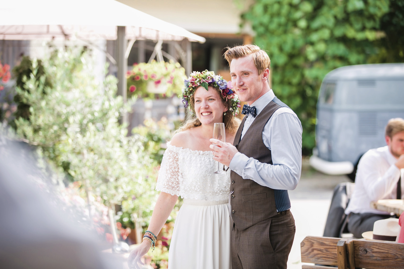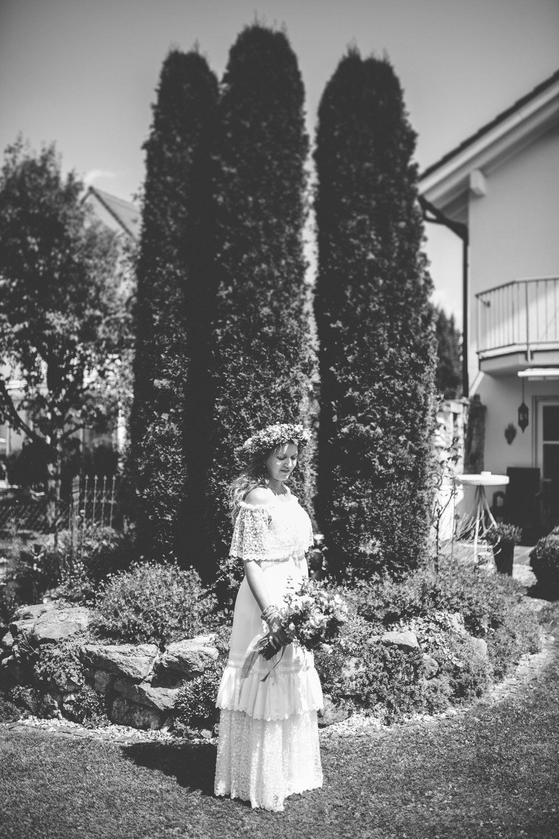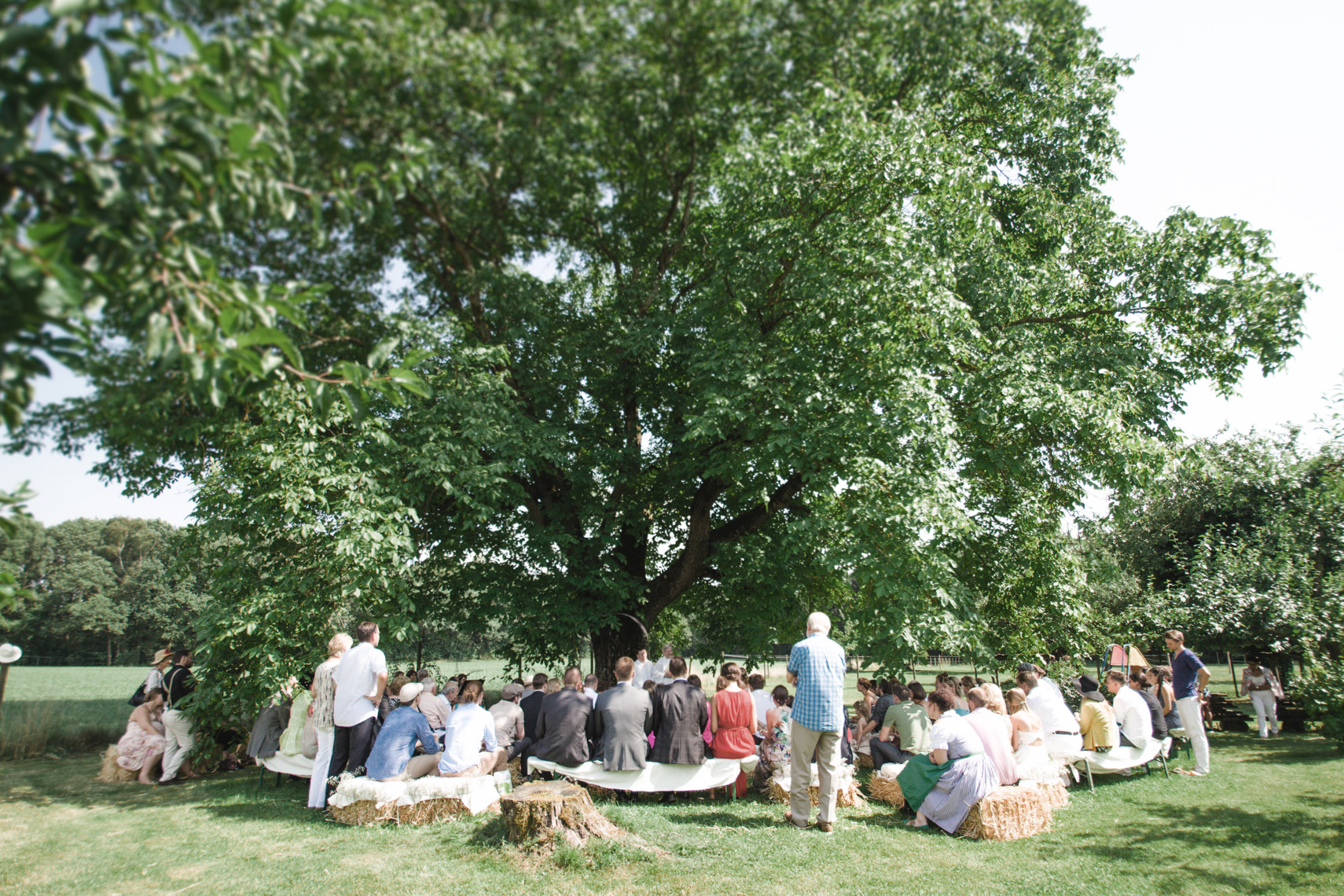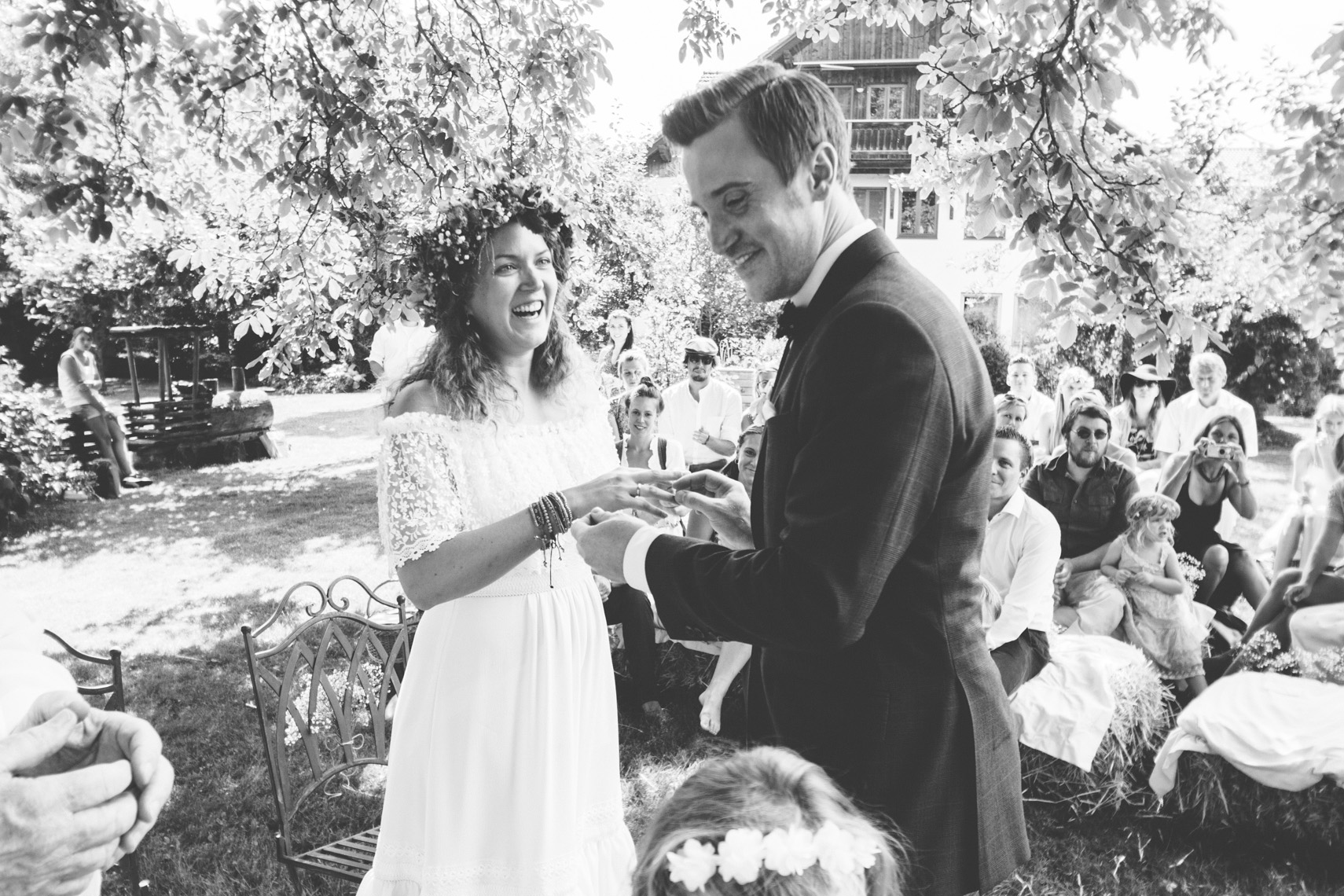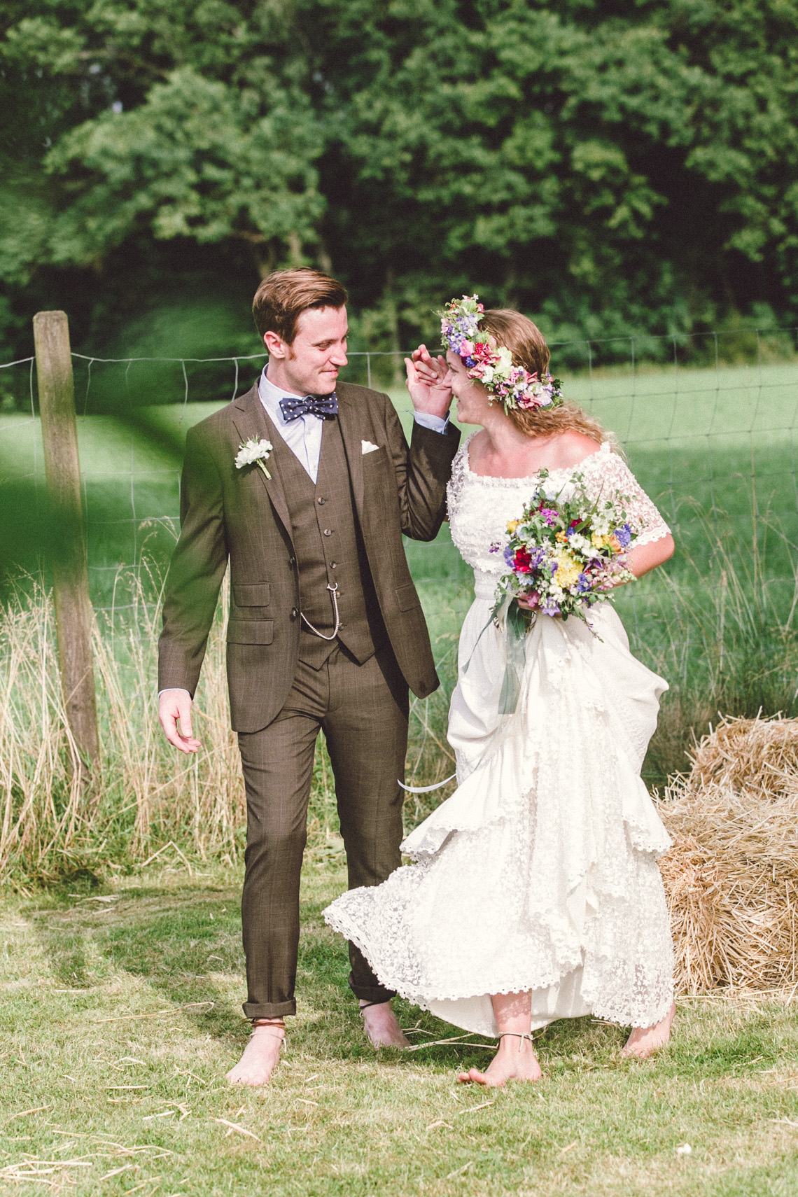 „…Hallo Alexandra, wir sind Mihi und Felix, wir heiraten und weil wir auch auf unserer Hochzeit so wie immer bleiben wollen, wird unser Fest total entspannt, locker und natürlich. Unter anderem werden wir auf jeden Fall barfuß feiern… “ Ich las nur “ barfuß “ und in diesem Moment dachte ich, die Beiden musst du unbedingt kennenlernen. Denn wer barfuß heiratet, passt zu dir. Seit dem sprach ich, wenn es um Mihi und Felix`Hochzeit ging, immer von der “ Barfußhochzeit “ die am Ende genau so schön wurde, wie ich es mir vorgestellt hatte. Eine süße Hippie Braut, ohne Make up und dafür mit ganz vielen bunten Armbändchen, einem großen Blumenkranz für den Kopf und einem Wildblumenstrauß als Hochzeitsbouquet in der Hand. Und ihr treuster Felix als Bräutigam, mit luftigem aber chicen Anzug, hochgekrempelter Hose und einem über den Tag andauerndem verschmitztem Grinsen im Gesicht. Da saßen sie also, unter einem großen Haselnussbaum und gaben sich ihr Eheversprechen, feierten und tanzten daraufhin bis in aller Früh und strahlten wie die Sommersonne. Und selbstverständlich fühlten sich nicht nur die Beiden barfuß am wohlsten, auch Gäste und Fotografin blieben den Tag lang ohne Schuhwerk.