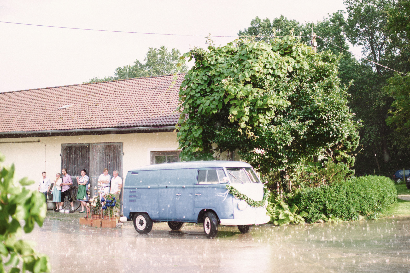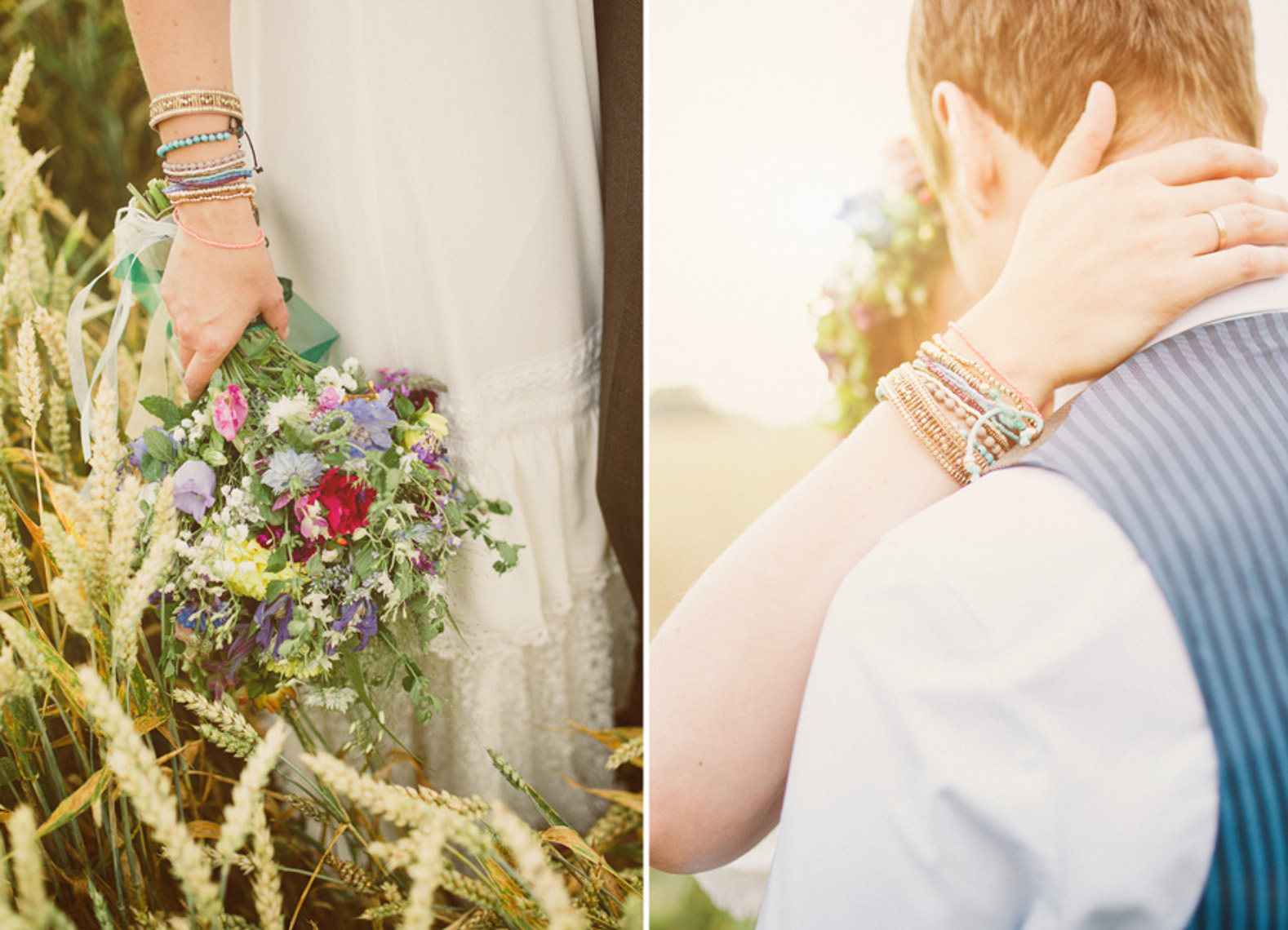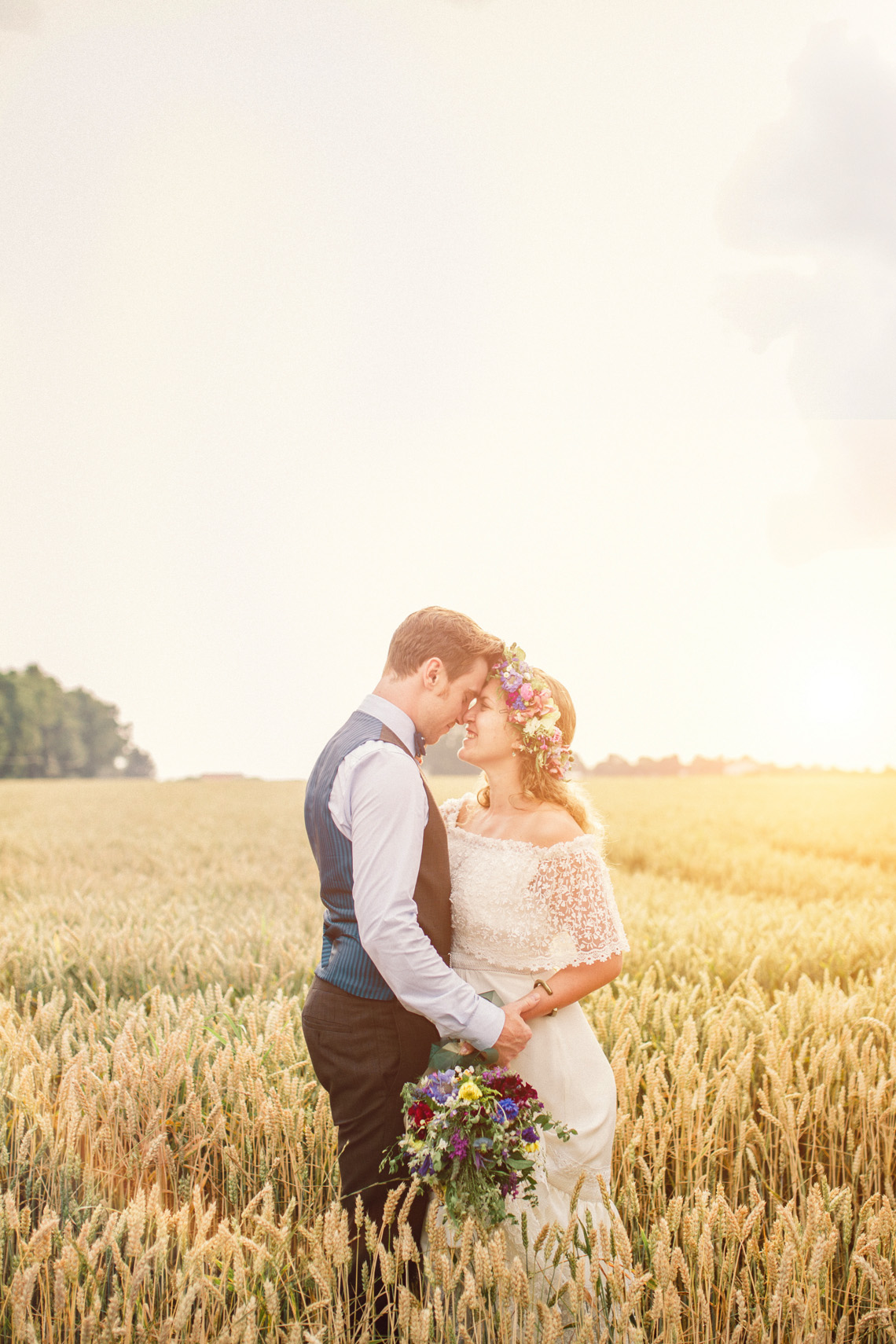 Als klar war dass ich eure Hochzeit fotografiere, wünschte ich mir so sehr dass ihr Sonnenschein für euren Tag bekommt. Nicht falsch verstehen, ich wünsche all meinen Brautpaaren Sonnenschein an ihrem Hochzeitstag. Aber bei euch war es mir ein besonderes Anliegen, denn ich hatte dieses Bild im Kopf wie ihr barfuß in einem goldenen Feld steht das von der Abendsonne beleuchtet wird. Also sprach ich zur Wetterfee: “ Liebe Wetterfee, bitte mach dass auf Mihi und Felix`Hochzeit die Sonne scheint. Es wird eine wirklich richtig tolle Hochzeit in einer alten Scheune, mit Blumenkranz, einem Bulli, einem handgemachtem Brautkleid von Mihis Freundin und vor allem: Die Beiden sind barfuß! “ Nun also, ich sage euch etwas. Die Wetterfee hatte für diesen Tag Regen eingeplant und sie meinte, sie würde uns den Wunsch erfüllen, mit der Ausnahme dass Nachmittags ein kurzer Schauer runterkommt. Der wird aber einen anderen Zweck erfüllen als einfach nur den Boden nass zu machen. Und genau so sollte es sein. Ihr habt geheiratet, seid barfuß durch diesen Sommertag gelaufen und als ein kurzer Regenschauer kam, gerade als wir im Shooting waren, da machten wir eine Pause. Diese Pause hat sich gelohnt, denn später, als die Sonne erneut heraus kam, leuchtete sie goldener als zuvor über das Weizenfeld in dem ihr standet und diese wunderschönen Aufnahmen von euch entstehen konnten. Was lehrte euch die Wetterfee also? Nach jedem Regen kommt Sonne? Neee, viel zu einfach. Macht in Regenmomenten einfach mal eine Pause zum Durchatmen und genießt die Sonnenstunden daraufhin doppelt so intensiv wie vorher. Kann man drüber nachdenken, oder?