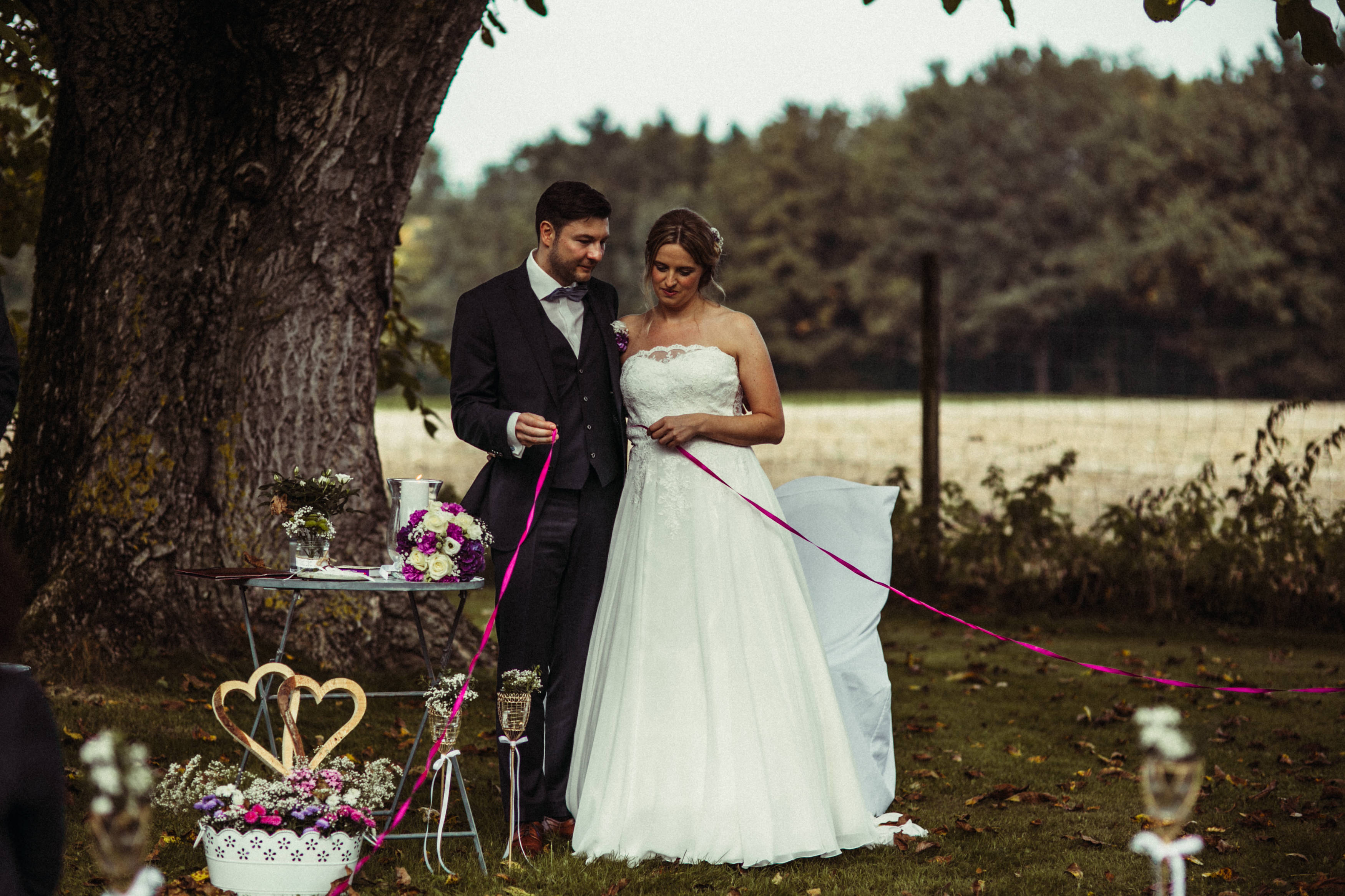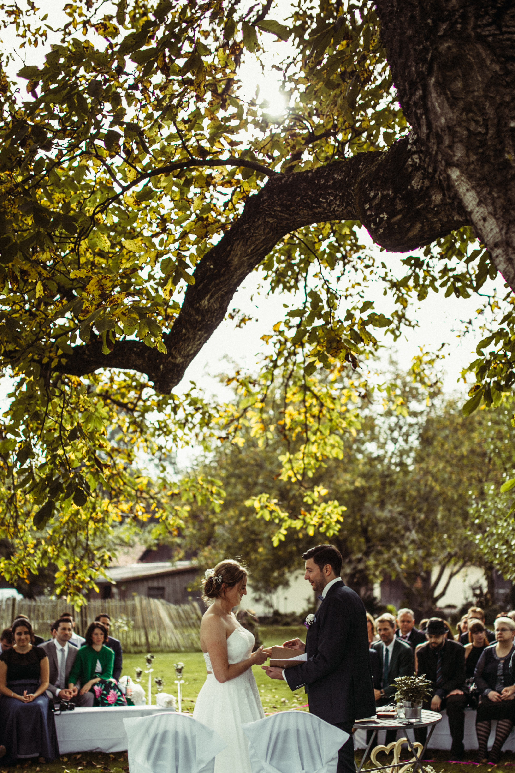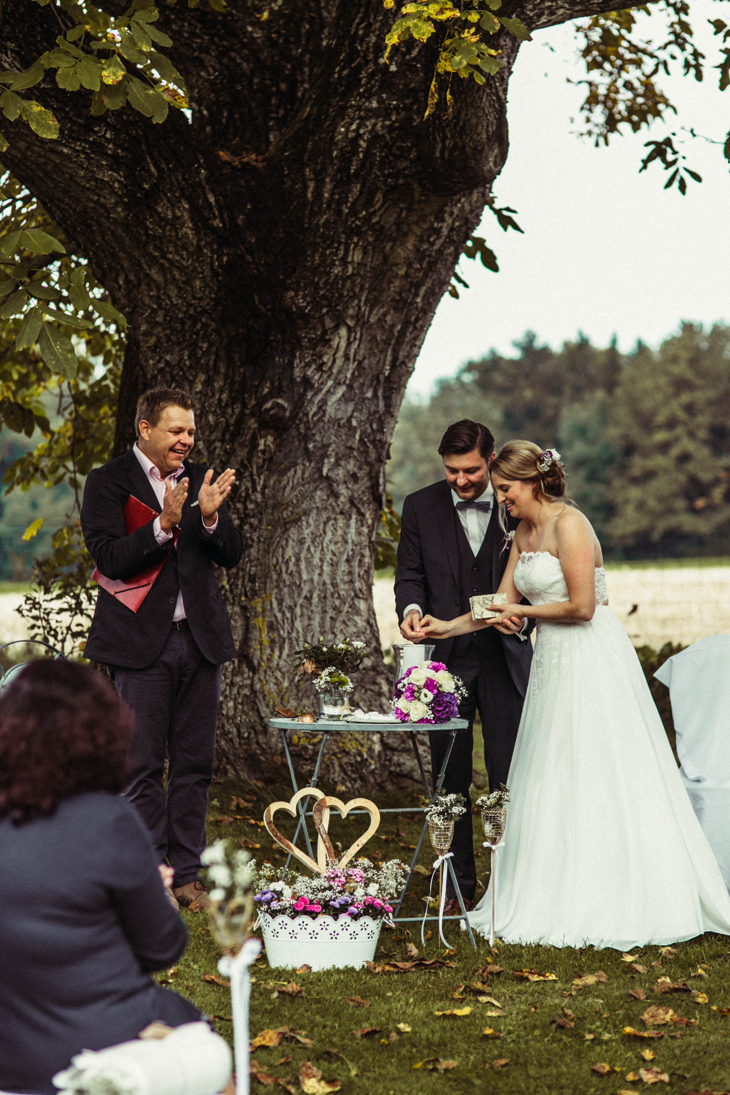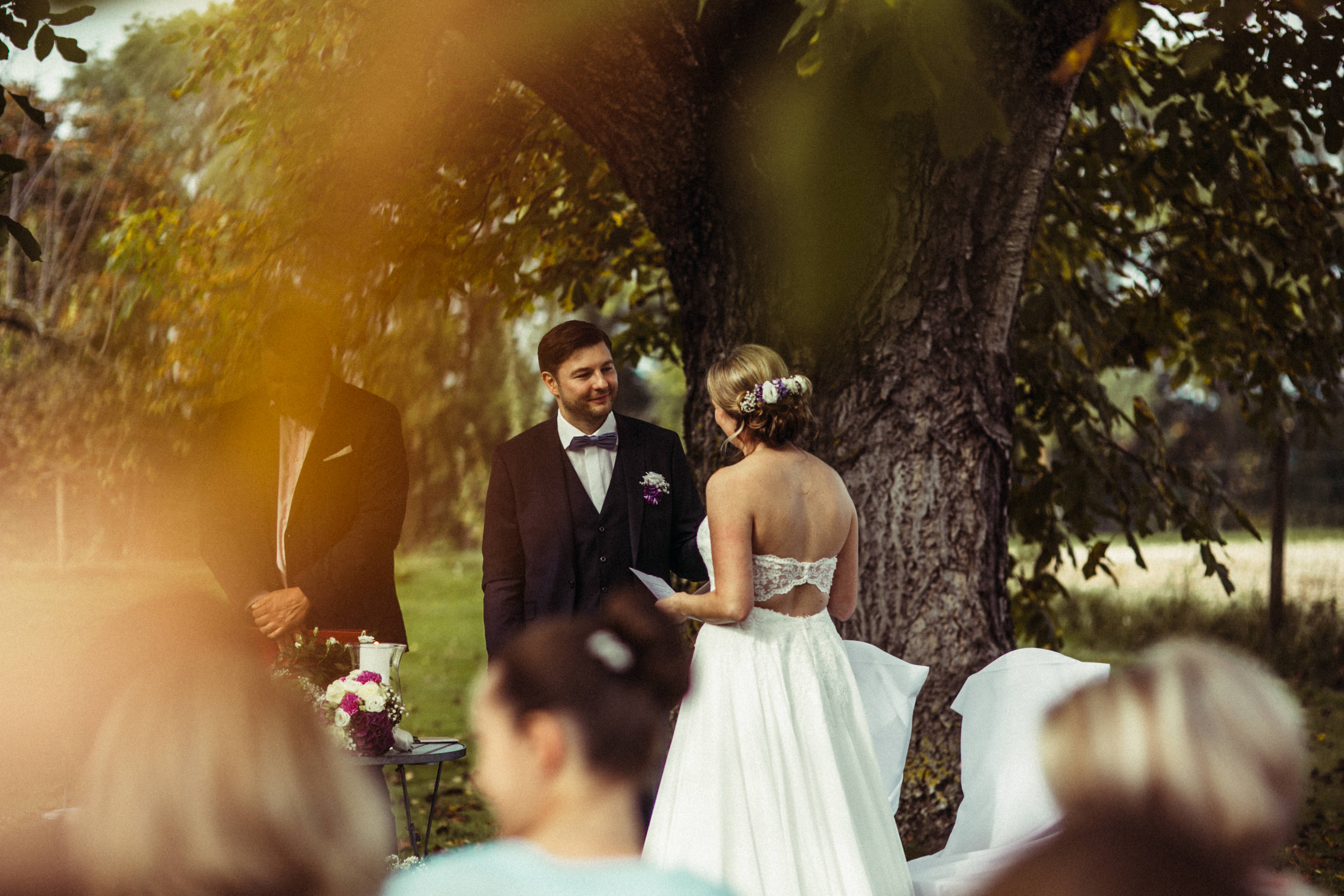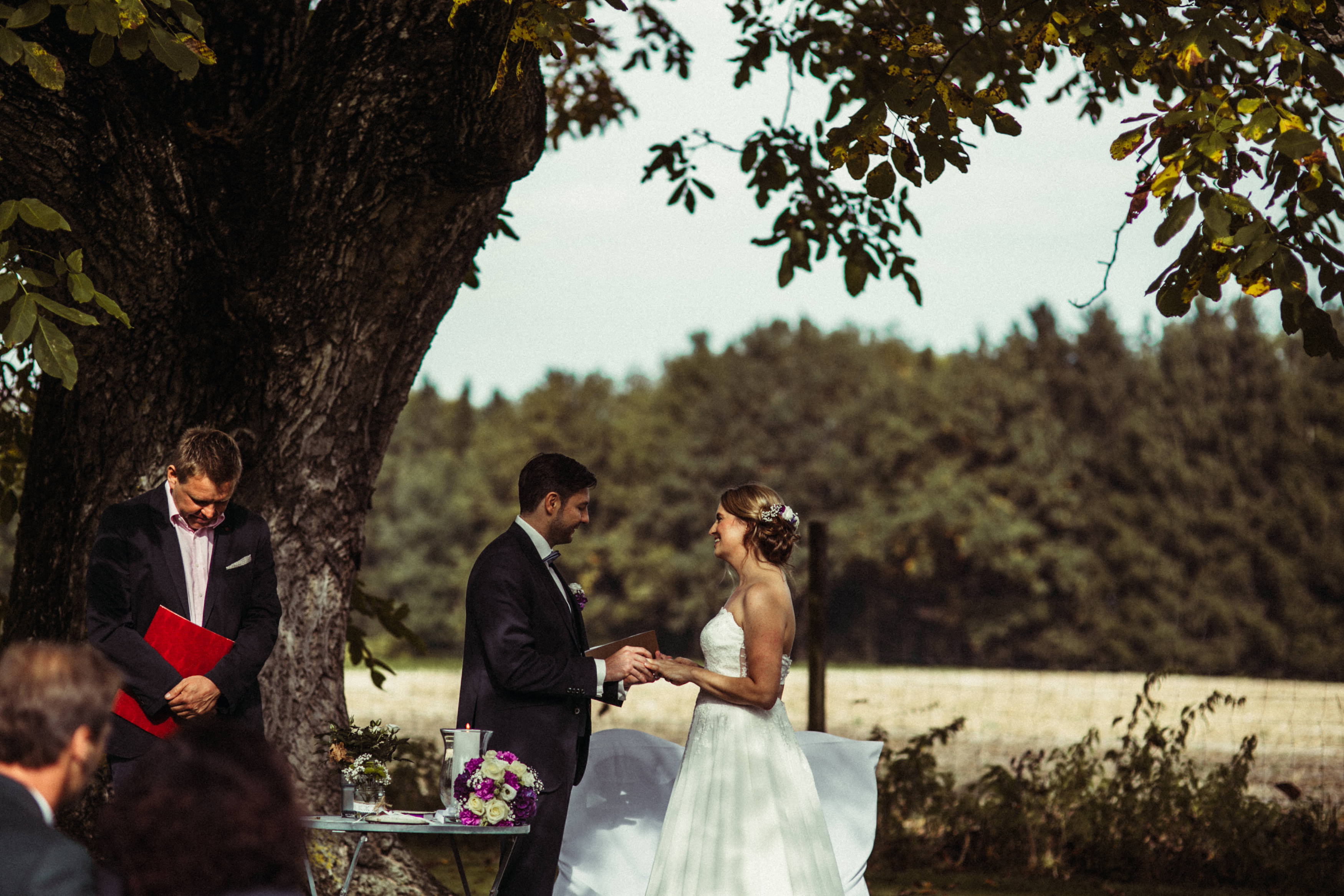 ihr beide habt euch eine zauberhafte Location für eure noch zauberhaftere Trauung ausgesucht. Ich bin mir total sicher dass all die schönen Menschen die mit euch feierten, sich so sehr für euch freuten und diese tolle Kulisse mit jedem Atemzug eingesogen haben, damit es als Erinnerung ewig in den Herzen weilen kann. Die alte Kastanie, die herunterfallenden, bunten Blätter, das versteckte Licht zwischen den Bäumen, zwei verliebte Pferde auf der Koppel und ihr mitten drin unter freiem Himmel. Wie schön die Welt doch ist, nicht wahr? So schön und besonders und immer wieder zauberhaft. Ich wünsche euch, dass ihr das Zauberhafte jeden Tag in eurer Leben und eure Beziehung mit einfließen lasst. Dass ihr die Einladungen erkennen könnt und sie annehmt, in Gesprächen, im Zuhören, in einem duftenden Blumenfeld oder der Musik eines Quells an dem ihr vorbeigeht. All diese Dinge sind so wertvoll für jeden Tag und knüpfen ananeinandergereiht das Band des Lebens, des Glücks und der Wertschätzung. So wie auch das Band über welches eure Ringe durch die Hände eurer Liebsten gleiten durften, so soll auch eure Liebe jeden Tag mit den Geschenken eures Lebens wachsen. Das Leben ist so wunderschön wie ihr es seid, zueinander und miteinander.