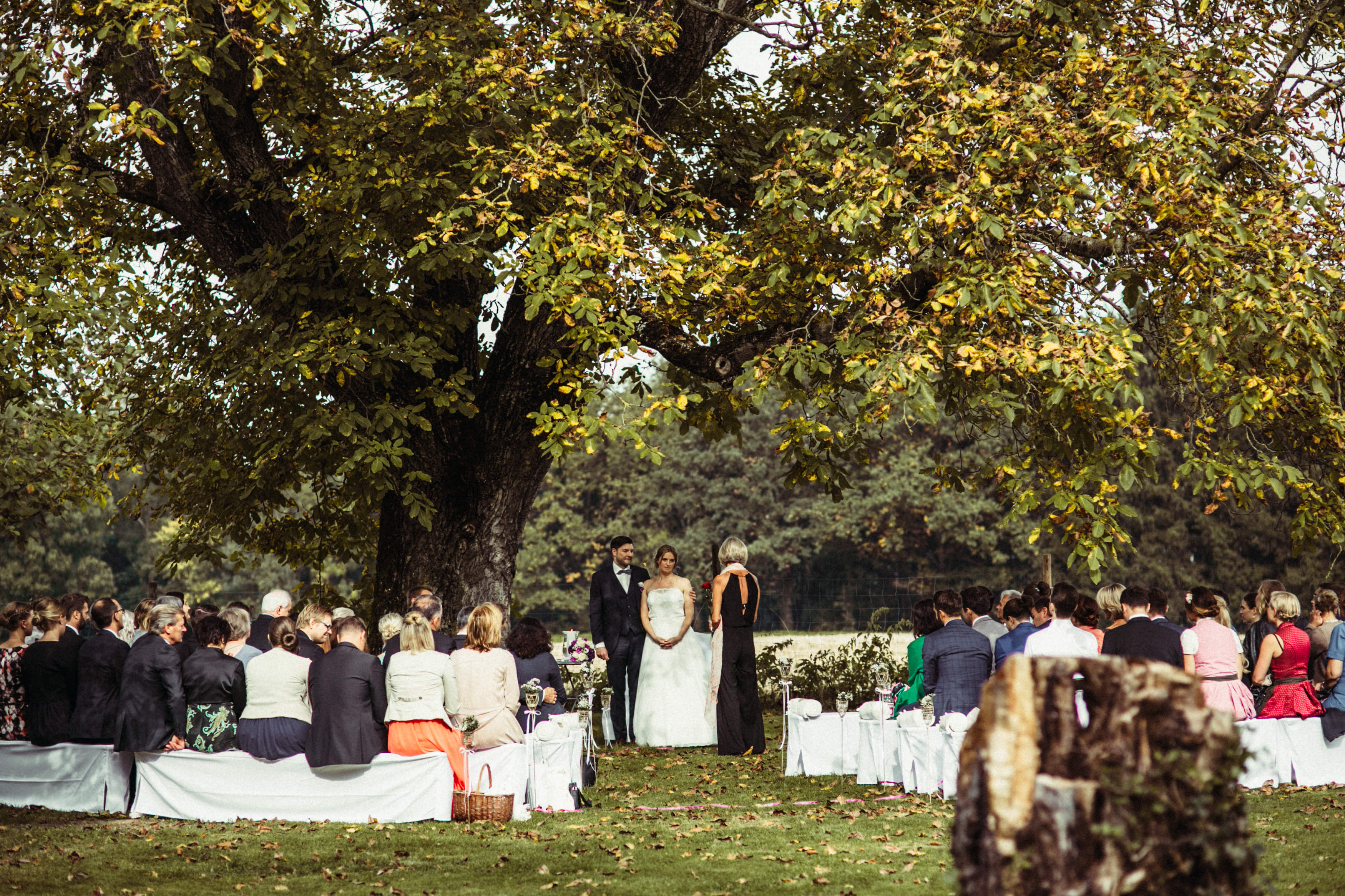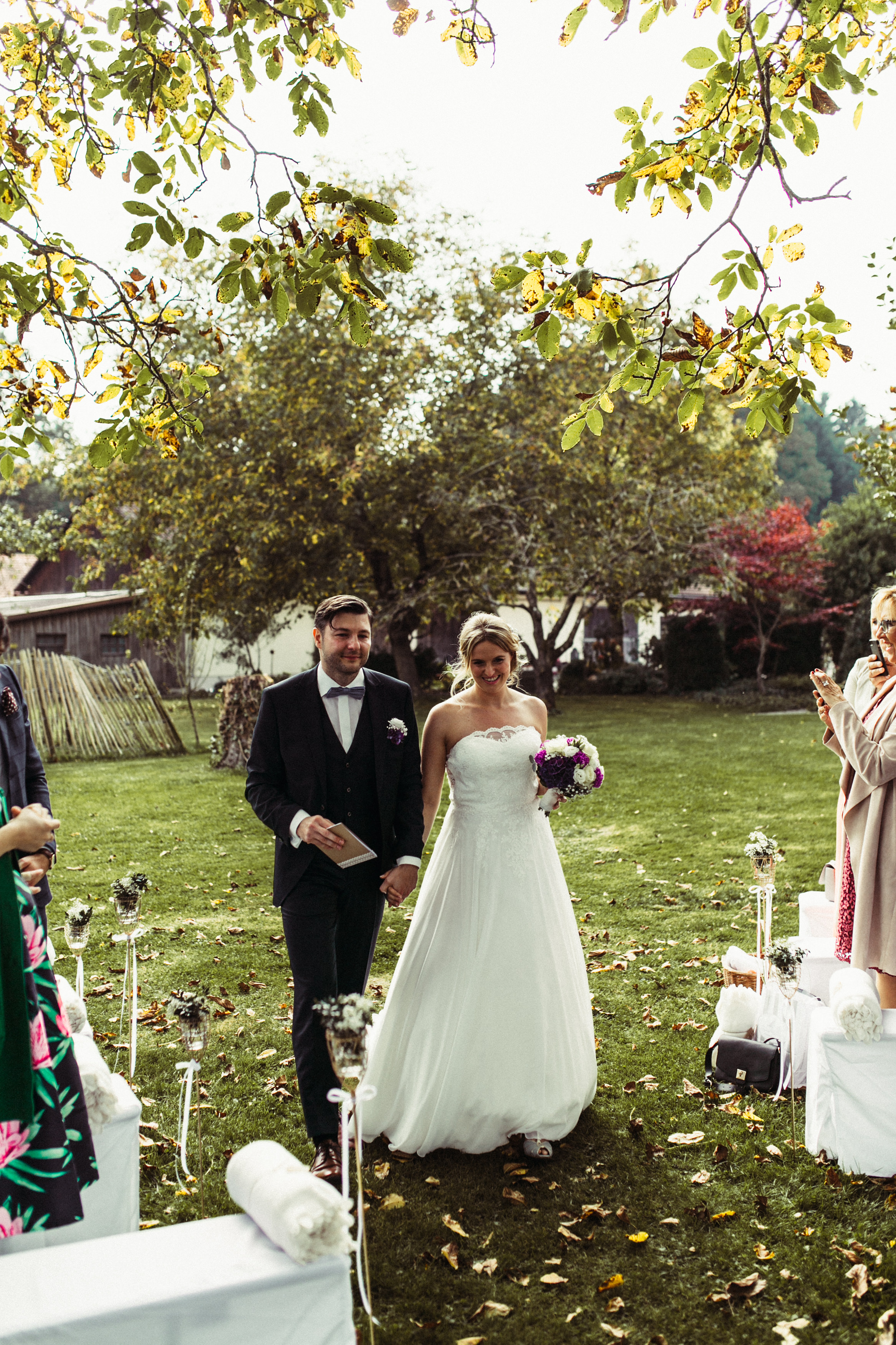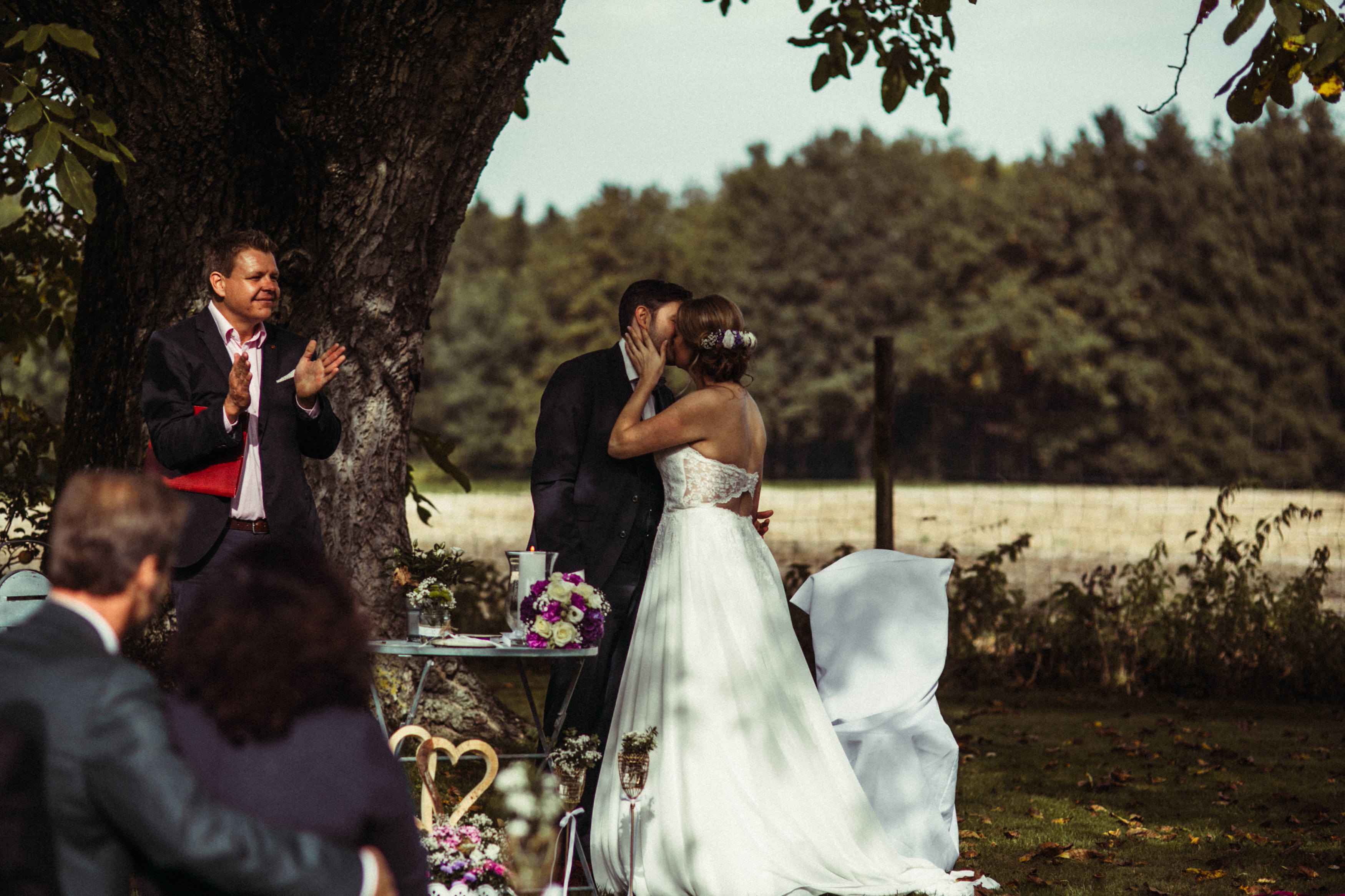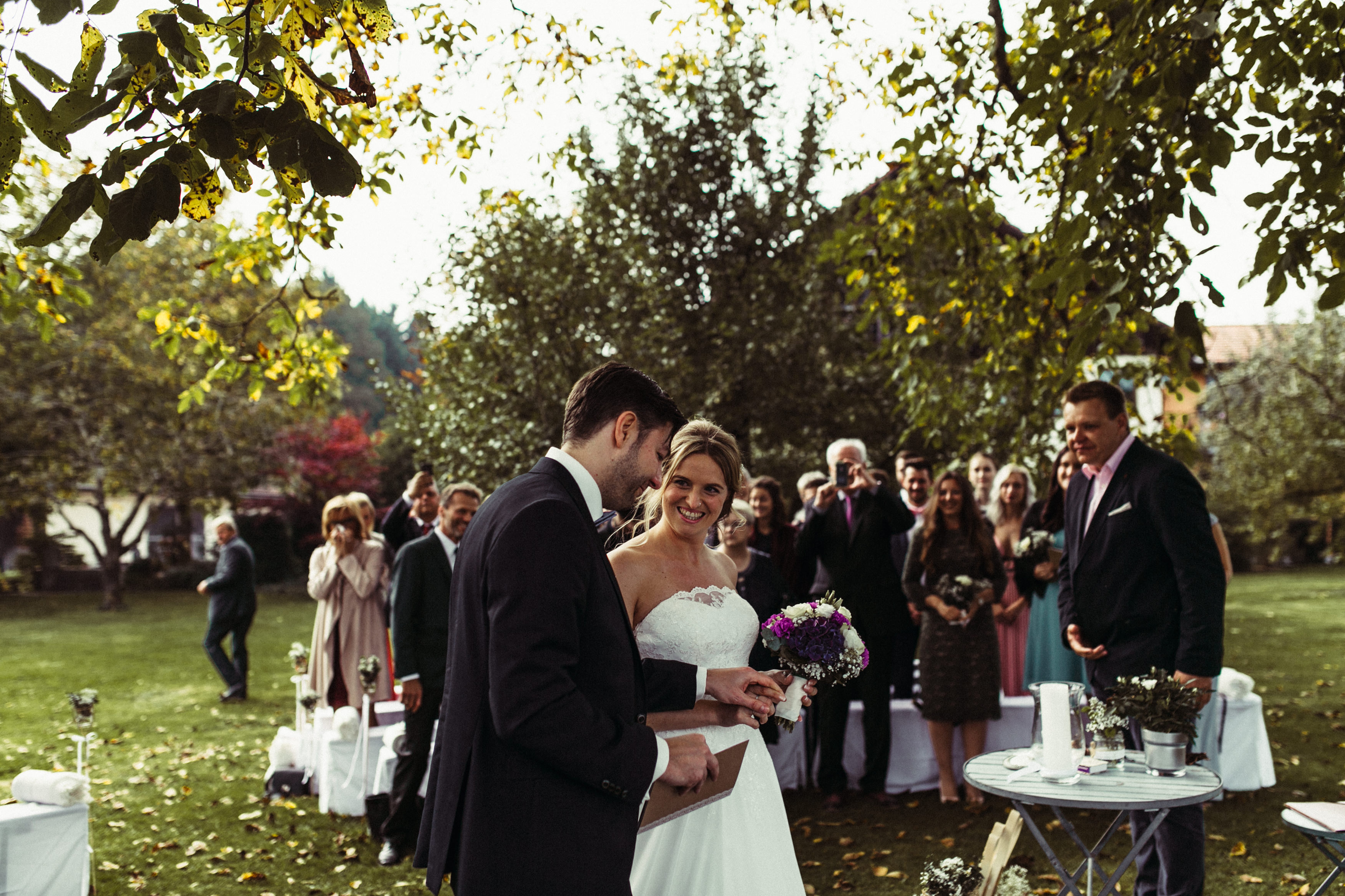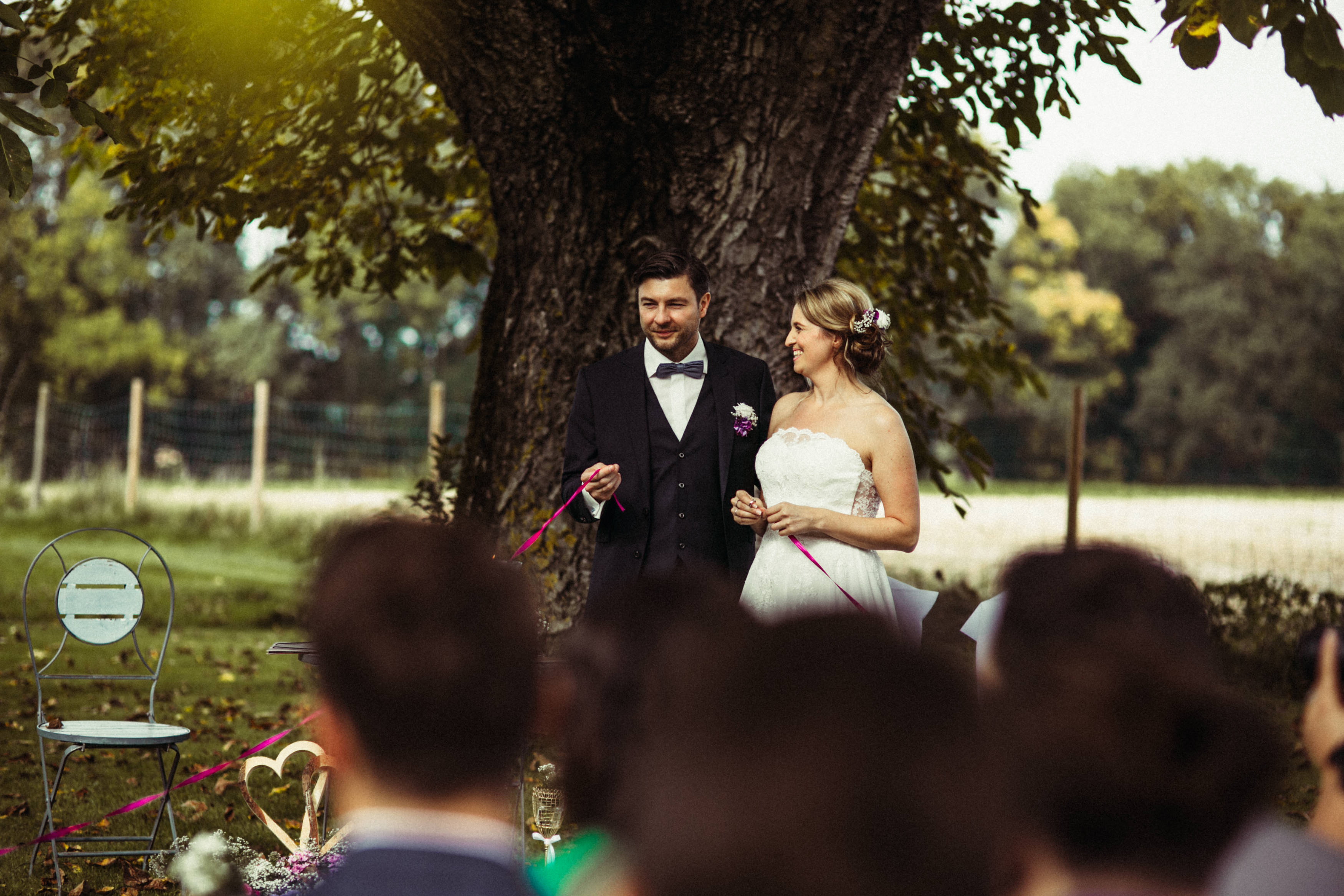 ihr beide habt euch eine zauberhafte Location für eure noch zauberhaftere Trauung ausgesucht. Ich bin mir total sicher dass all die schönen Menschen die mit euch feierten, sich so sehr für euch freuten und diese tolle Kulisse mit jedem Atemzug eingesogen haben, damit es als Erinnerung ewig in den Herzen weilen kann. Die alte Kastanie, die herunterfallenden, bunten Blätter, das versteckte Licht zwischen den Bäumen, zwei verliebte Pferde auf der Koppel und ihr mitten drin unter freiem Himmel. Wie schön die Welt doch ist, nicht wahr? So schön und besonders und immer wieder zauberhaft. Ich wünsche euch, dass ihr das Zauberhafte jeden Tag in eurer Leben und eure Beziehung mit einfließen lasst. Dass ihr die Einladungen erkennen könnt und sie annehmt, in Gesprächen, im Zuhören, in einem duftenden Blumenfeld oder der Musik eines Quells an dem ihr vorbeigeht. All diese Dinge sind so wertvoll für jeden Tag und knüpfen ananeinandergereiht das Band des Lebens, des Glücks und der Wertschätzung. So wie auch das Band über welches eure Ringe durch die Hände eurer Liebsten gleiten durften, so soll auch eure Liebe jeden Tag mit den Geschenken eures Lebens wachsen. Das Leben ist so wunderschön wie ihr es seid, zueinander und miteinander.