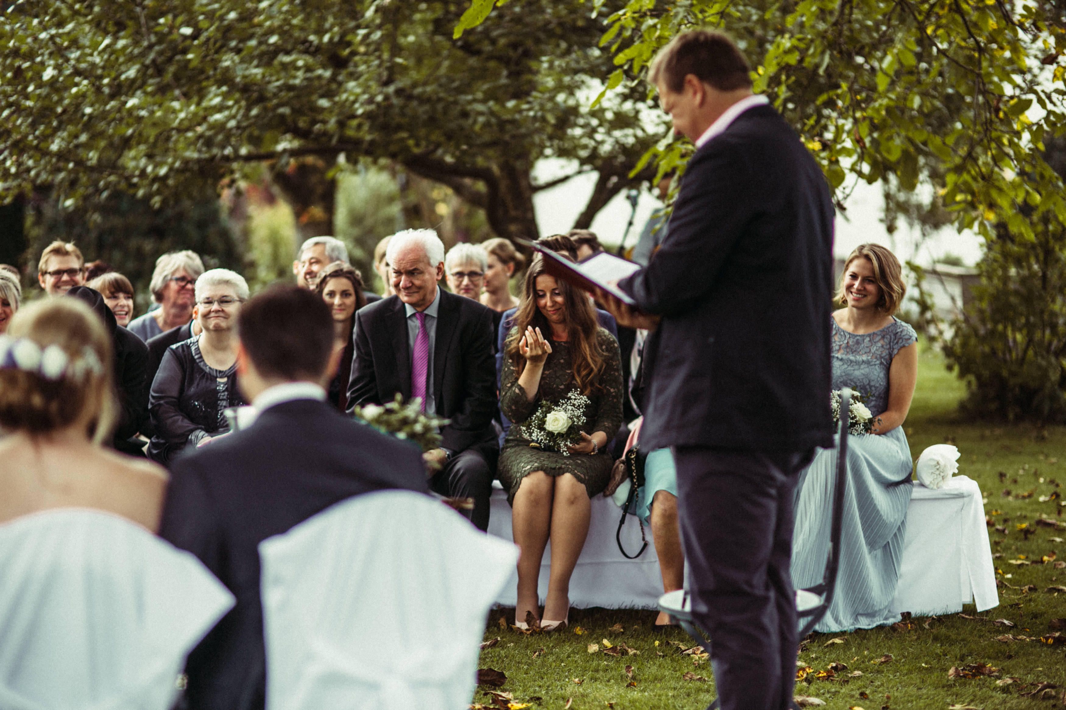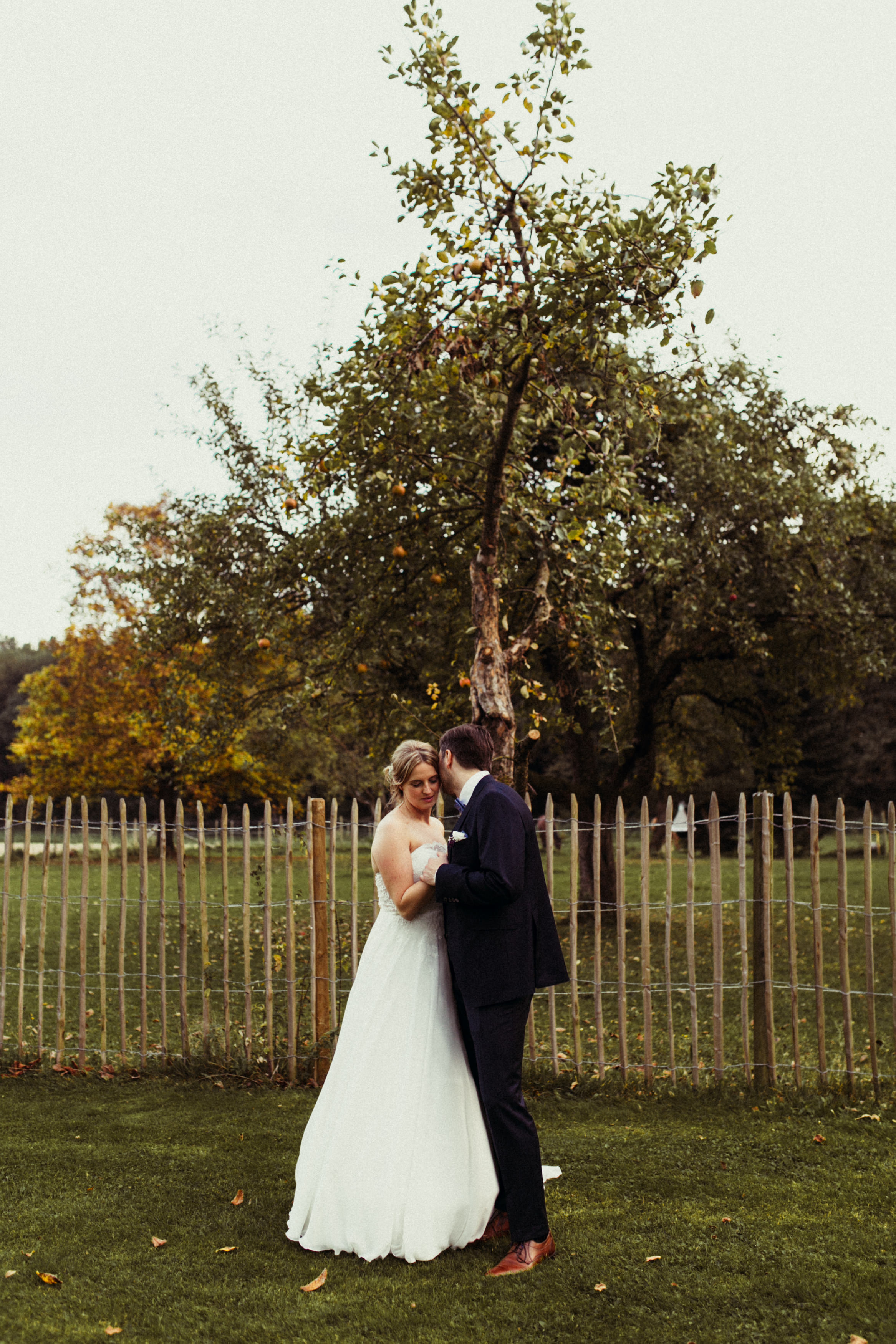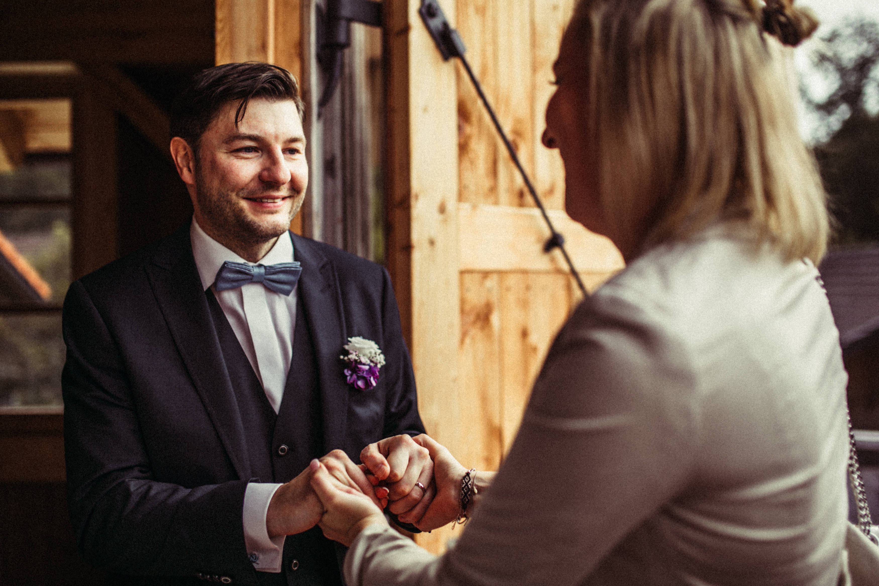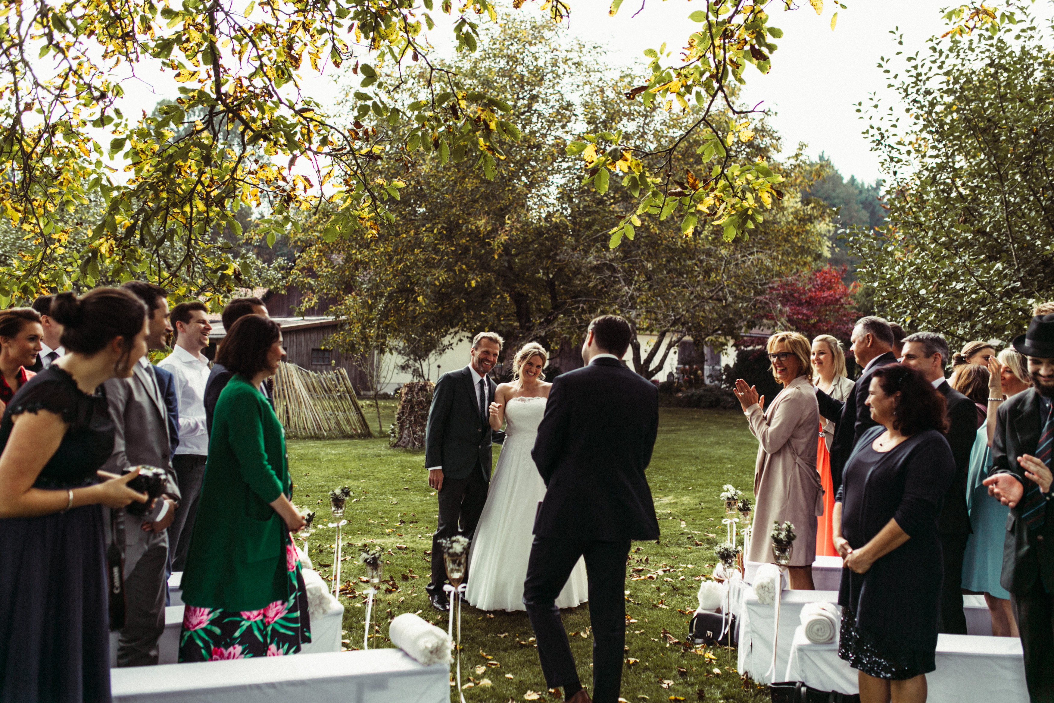 ihr beide habt euch eine zauberhafte Location für eure noch zauberhaftere Trauung ausgesucht. Ich bin mir total sicher dass all die schönen Menschen die mit euch feierten, sich so sehr für euch freuten und diese tolle Kulisse mit jedem Atemzug eingesogen haben, damit es als Erinnerung ewig in den Herzen weilen kann. Die alte Kastanie, die herunterfallenden, bunten Blätter, das versteckte Licht zwischen den Bäumen, zwei verliebte Pferde auf der Koppel und ihr mitten drin unter freiem Himmel. Wie schön die Welt doch ist, nicht wahr? So schön und besonders und immer wieder zauberhaft. Ich wünsche euch, dass ihr das Zauberhafte jeden Tag in eurer Leben und eure Beziehung mit einfließen lasst. Dass ihr die Einladungen erkennen könnt und sie annehmt, in Gesprächen, im Zuhören, in einem duftenden Blumenfeld oder der Musik eines Quells an dem ihr vorbeigeht. All diese Dinge sind so wertvoll für jeden Tag und knüpfen ananeinandergereiht das Band des Lebens, des Glücks und der Wertschätzung. So wie auch das Band über welches eure Ringe durch die Hände eurer Liebsten gleiten durften, so soll auch eure Liebe jeden Tag mit den Geschenken eures Lebens wachsen. Das Leben ist so wunderschön wie ihr es seid, zueinander und miteinander.