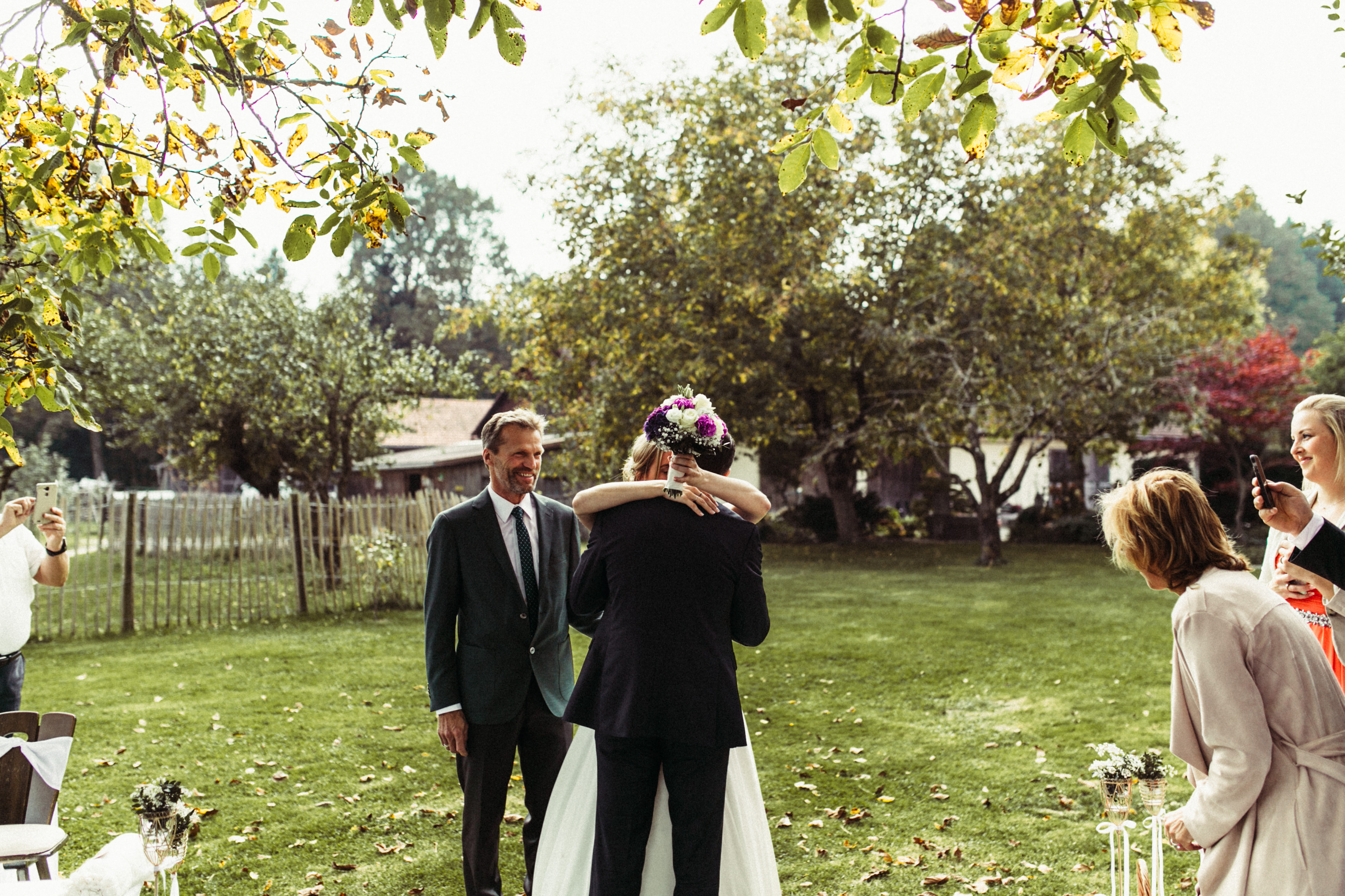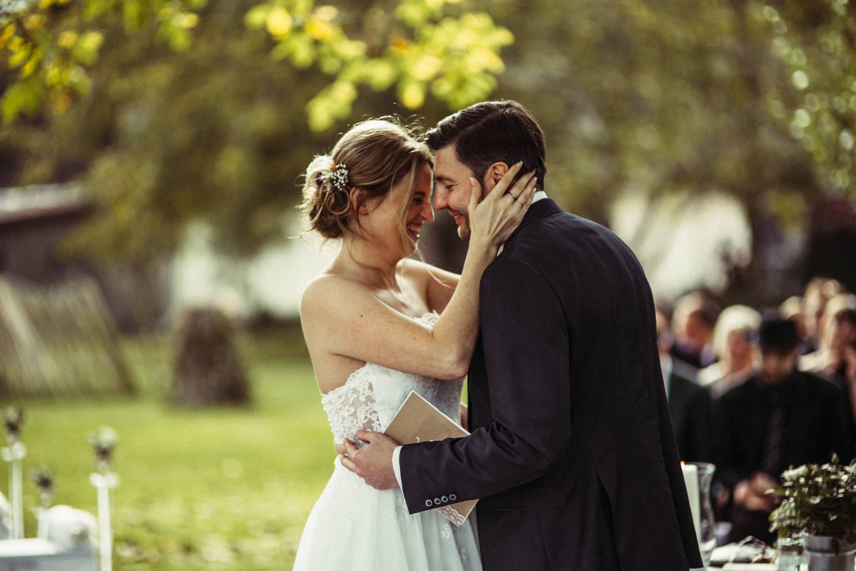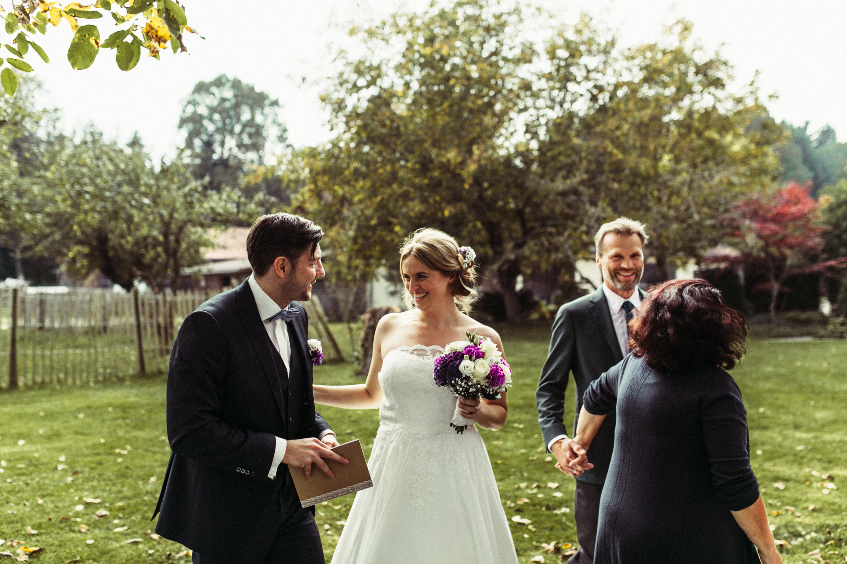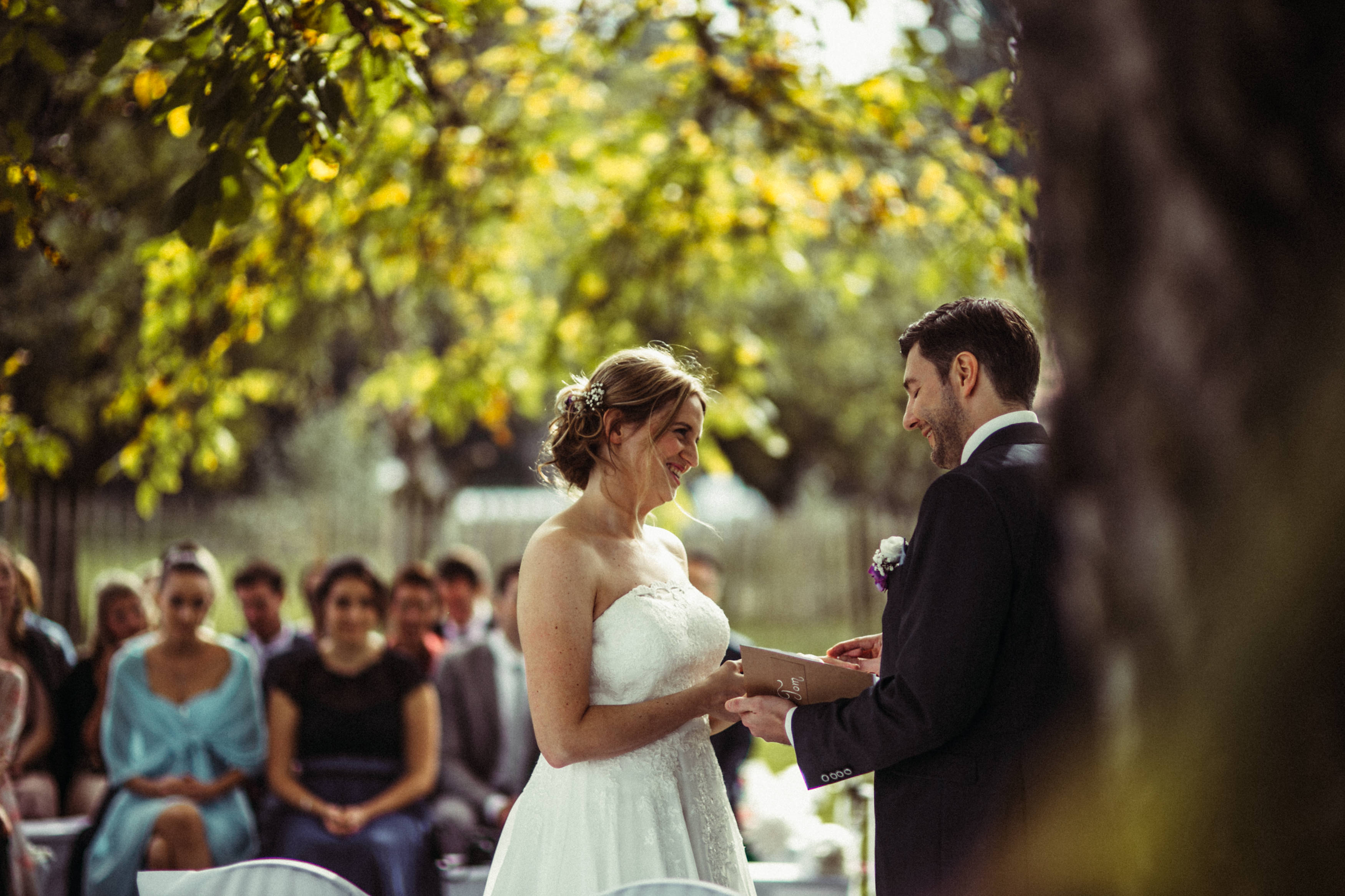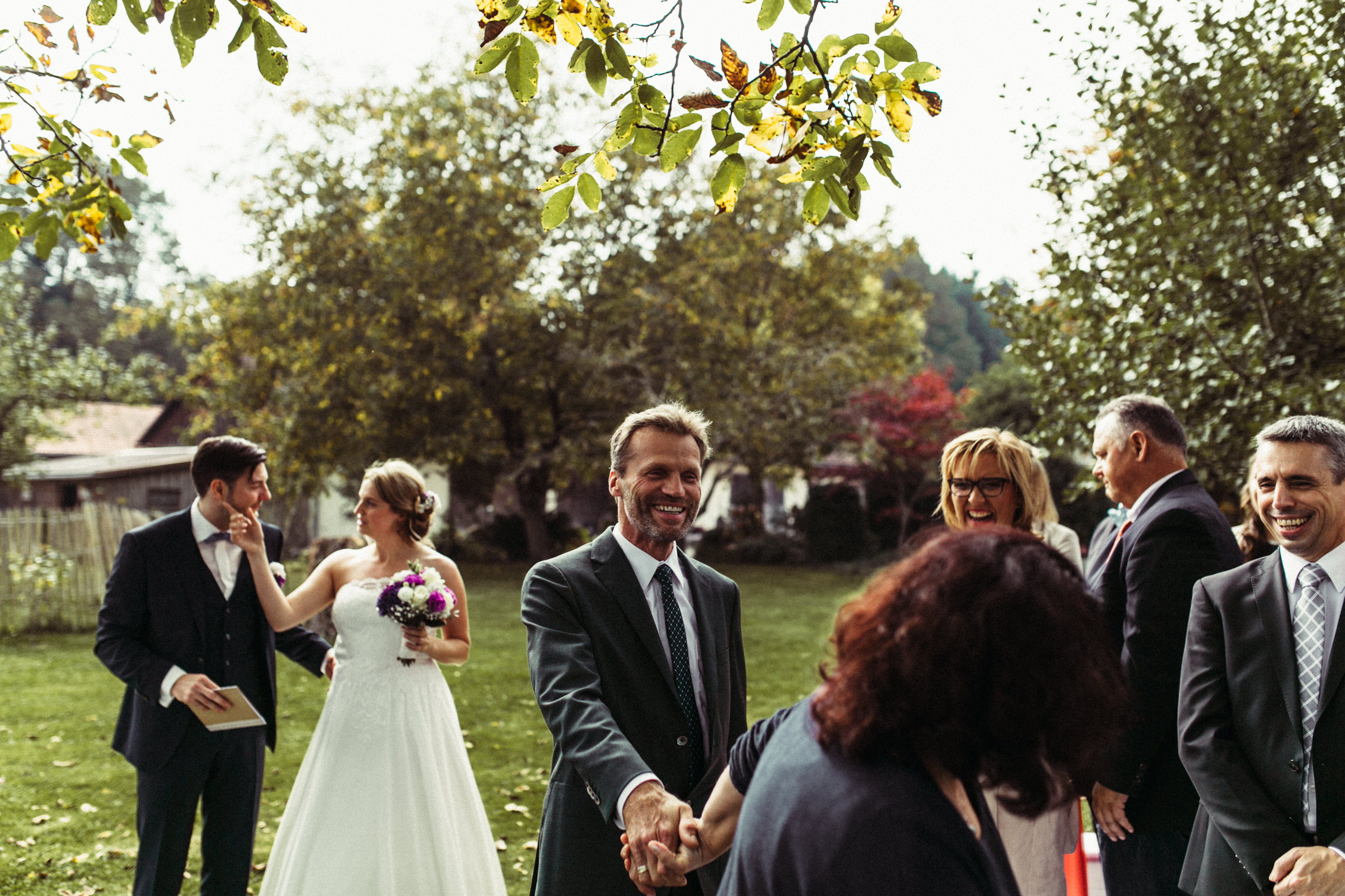 ihr beide habt euch eine zauberhafte Location für eure noch zauberhaftere Trauung ausgesucht. Ich bin mir total sicher dass all die schönen Menschen die mit euch feierten, sich so sehr für euch freuten und diese tolle Kulisse mit jedem Atemzug eingesogen haben, damit es als Erinnerung ewig in den Herzen weilen kann. Die alte Kastanie, die herunterfallenden, bunten Blätter, das versteckte Licht zwischen den Bäumen, zwei verliebte Pferde auf der Koppel und ihr mitten drin unter freiem Himmel. Wie schön die Welt doch ist, nicht wahr? So schön und besonders und immer wieder zauberhaft. Ich wünsche euch, dass ihr das Zauberhafte jeden Tag in eurer Leben und eure Beziehung mit einfließen lasst. Dass ihr die Einladungen erkennen könnt und sie annehmt, in Gesprächen, im Zuhören, in einem duftenden Blumenfeld oder der Musik eines Quells an dem ihr vorbeigeht. All diese Dinge sind so wertvoll für jeden Tag und knüpfen ananeinandergereiht das Band des Lebens, des Glücks und der Wertschätzung. So wie auch das Band über welches eure Ringe durch die Hände eurer Liebsten gleiten durften, so soll auch eure Liebe jeden Tag mit den Geschenken eures Lebens wachsen. Das Leben ist so wunderschön wie ihr es seid, zueinander und miteinander.