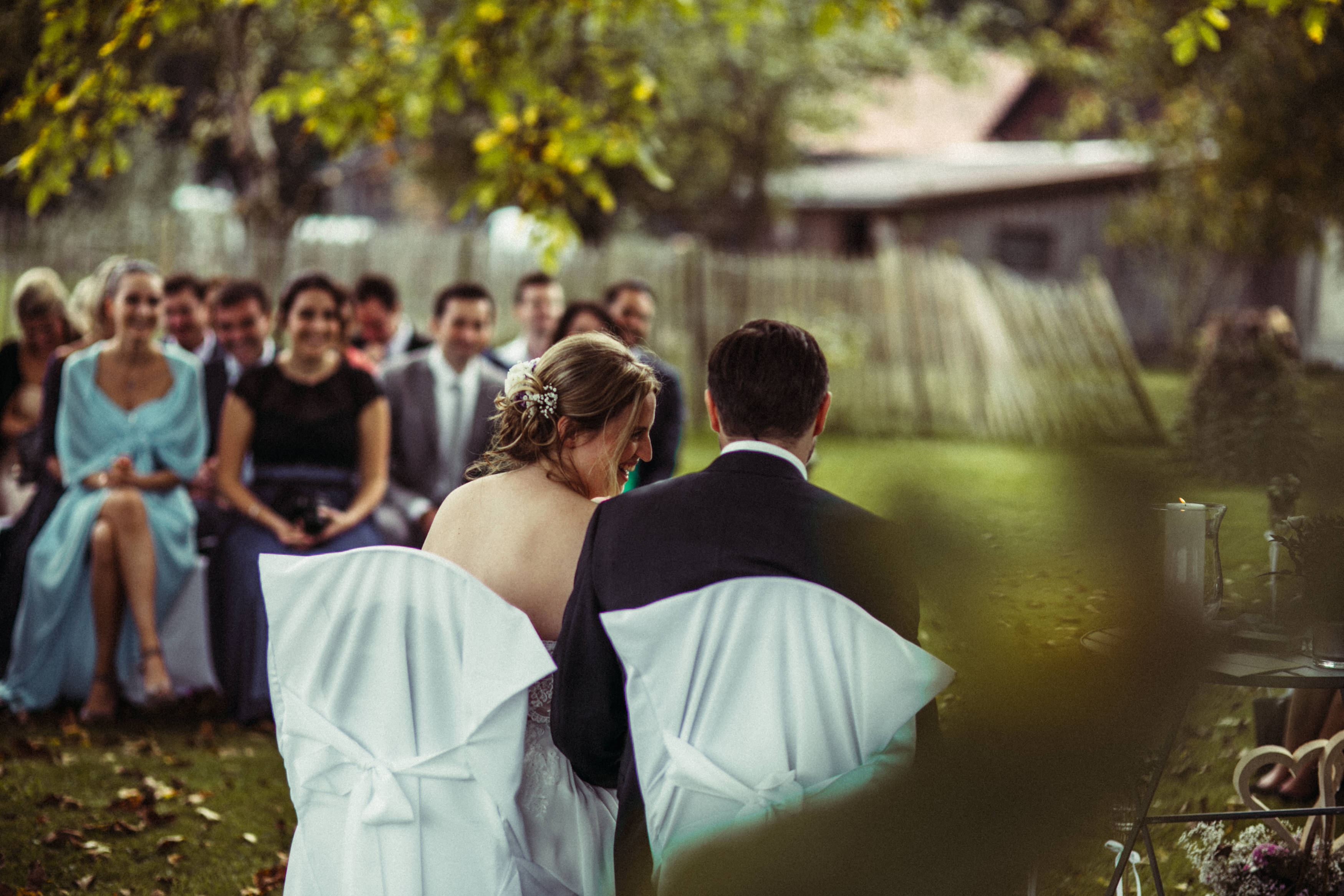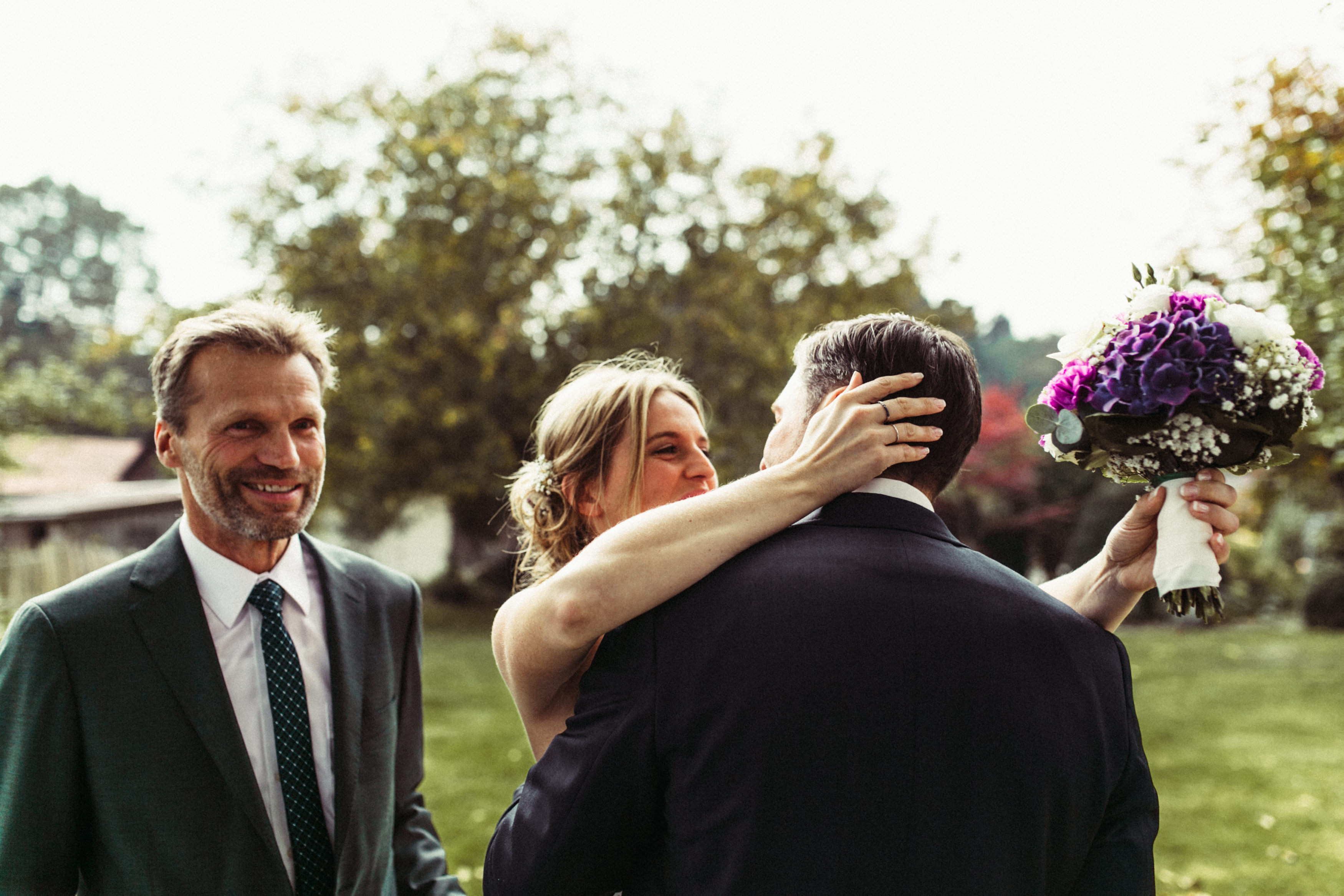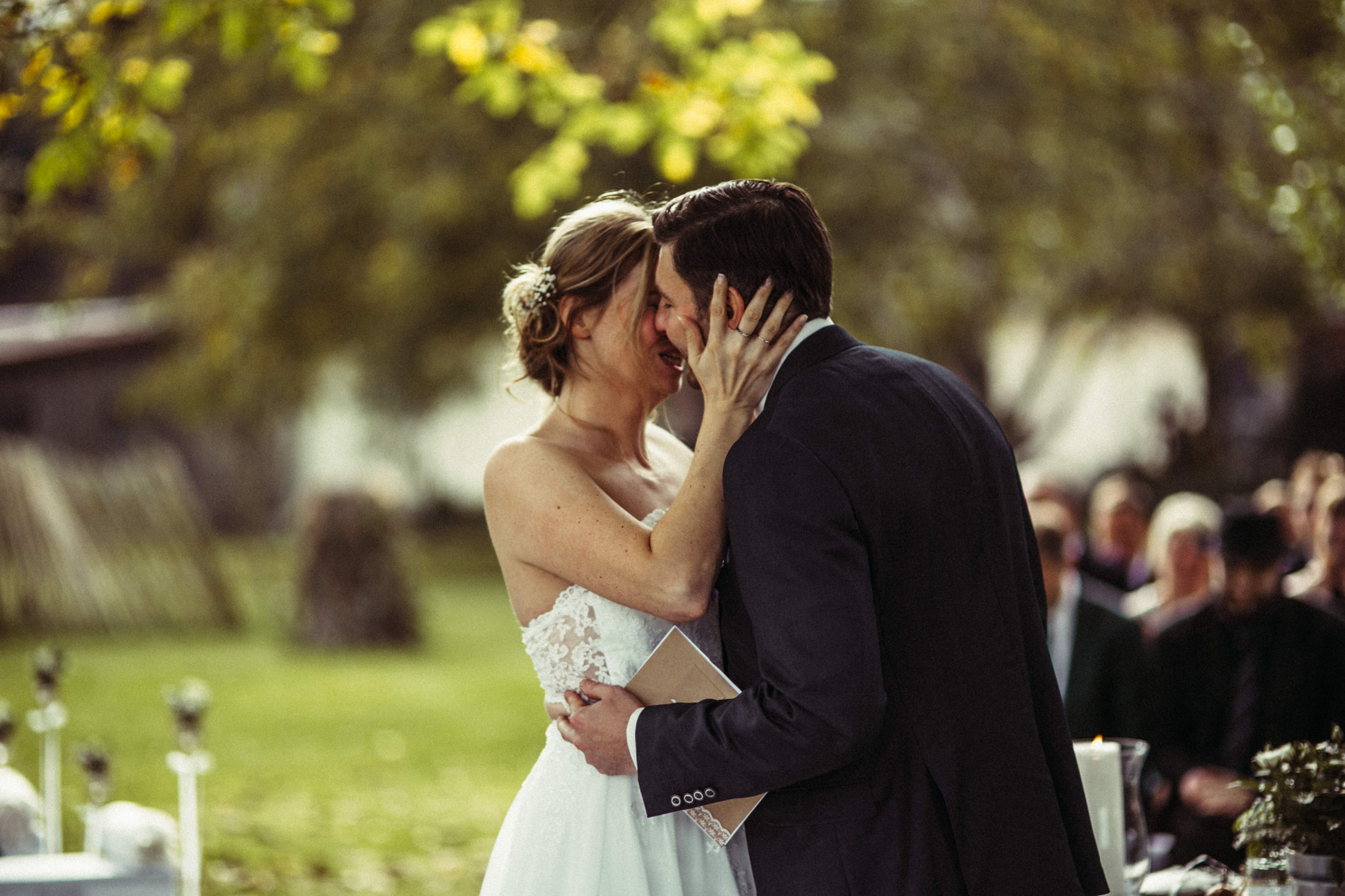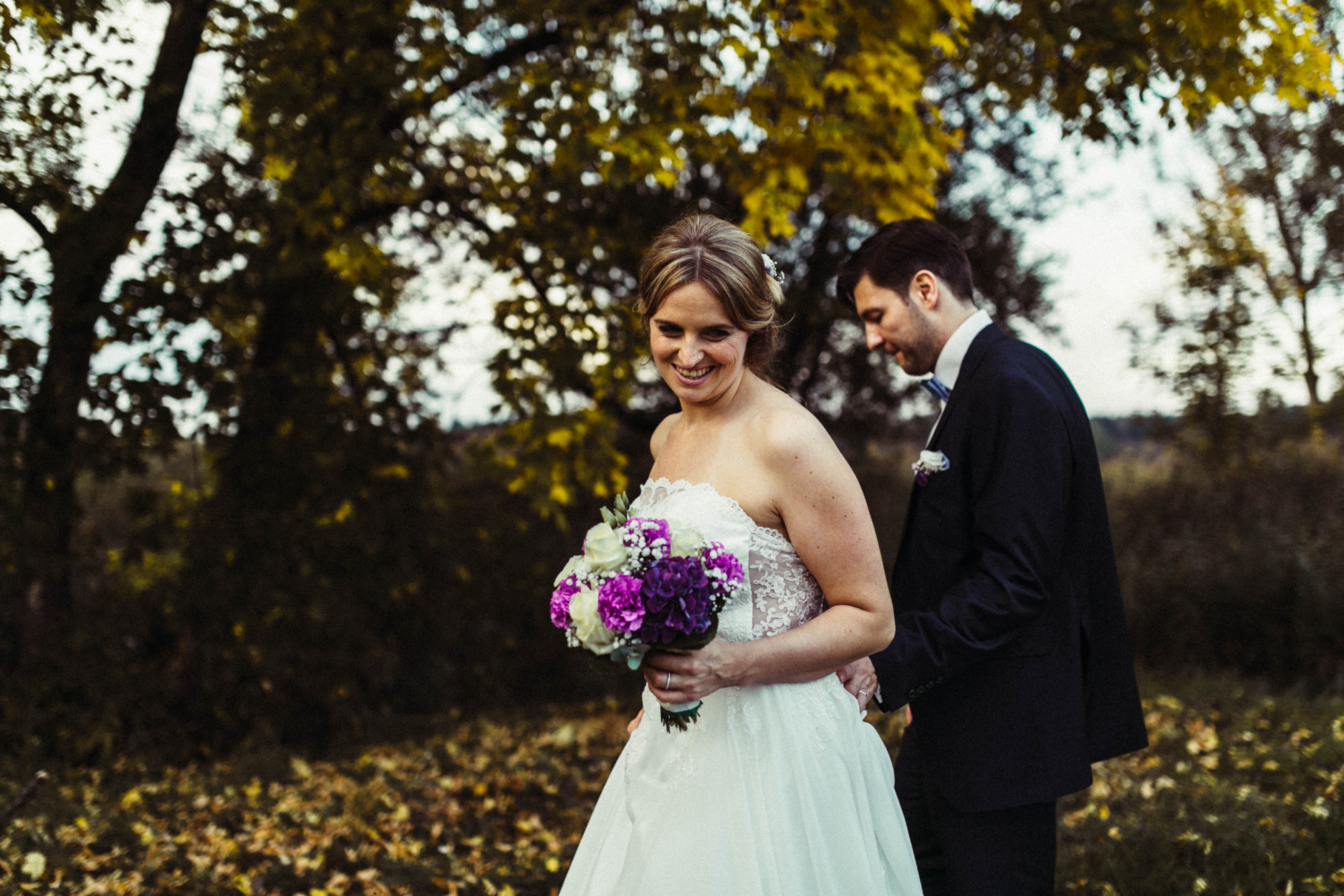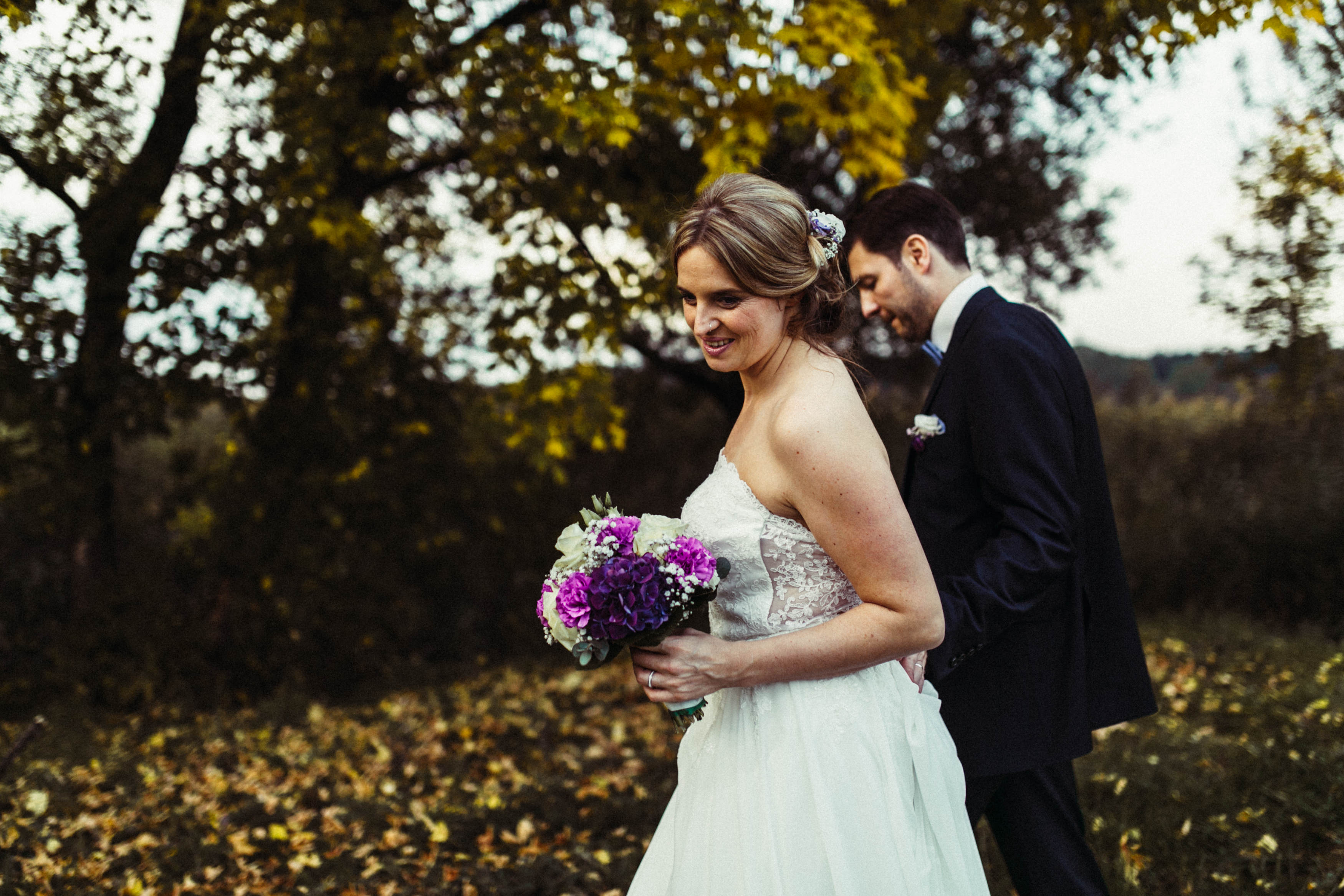 ihr beide habt euch eine zauberhafte Location für eure noch zauberhaftere Trauung ausgesucht. Ich bin mir total sicher dass all die schönen Menschen die mit euch feierten, sich so sehr für euch freuten und diese tolle Kulisse mit jedem Atemzug eingesogen haben, damit es als Erinnerung ewig in den Herzen weilen kann. Die alte Kastanie, die herunterfallenden, bunten Blätter, das versteckte Licht zwischen den Bäumen, zwei verliebte Pferde auf der Koppel und ihr mitten drin unter freiem Himmel. Wie schön die Welt doch ist, nicht wahr? So schön und besonders und immer wieder zauberhaft. Ich wünsche euch, dass ihr das Zauberhafte jeden Tag in eurer Leben und eure Beziehung mit einfließen lasst. Dass ihr die Einladungen erkennen könnt und sie annehmt, in Gesprächen, im Zuhören, in einem duftenden Blumenfeld oder der Musik eines Quells an dem ihr vorbeigeht. All diese Dinge sind so wertvoll für jeden Tag und knüpfen ananeinandergereiht das Band des Lebens, des Glücks und der Wertschätzung. So wie auch das Band über welches eure Ringe durch die Hände eurer Liebsten gleiten durften, so soll auch eure Liebe jeden Tag mit den Geschenken eures Lebens wachsen. Das Leben ist so wunderschön wie ihr es seid, zueinander und miteinander.
