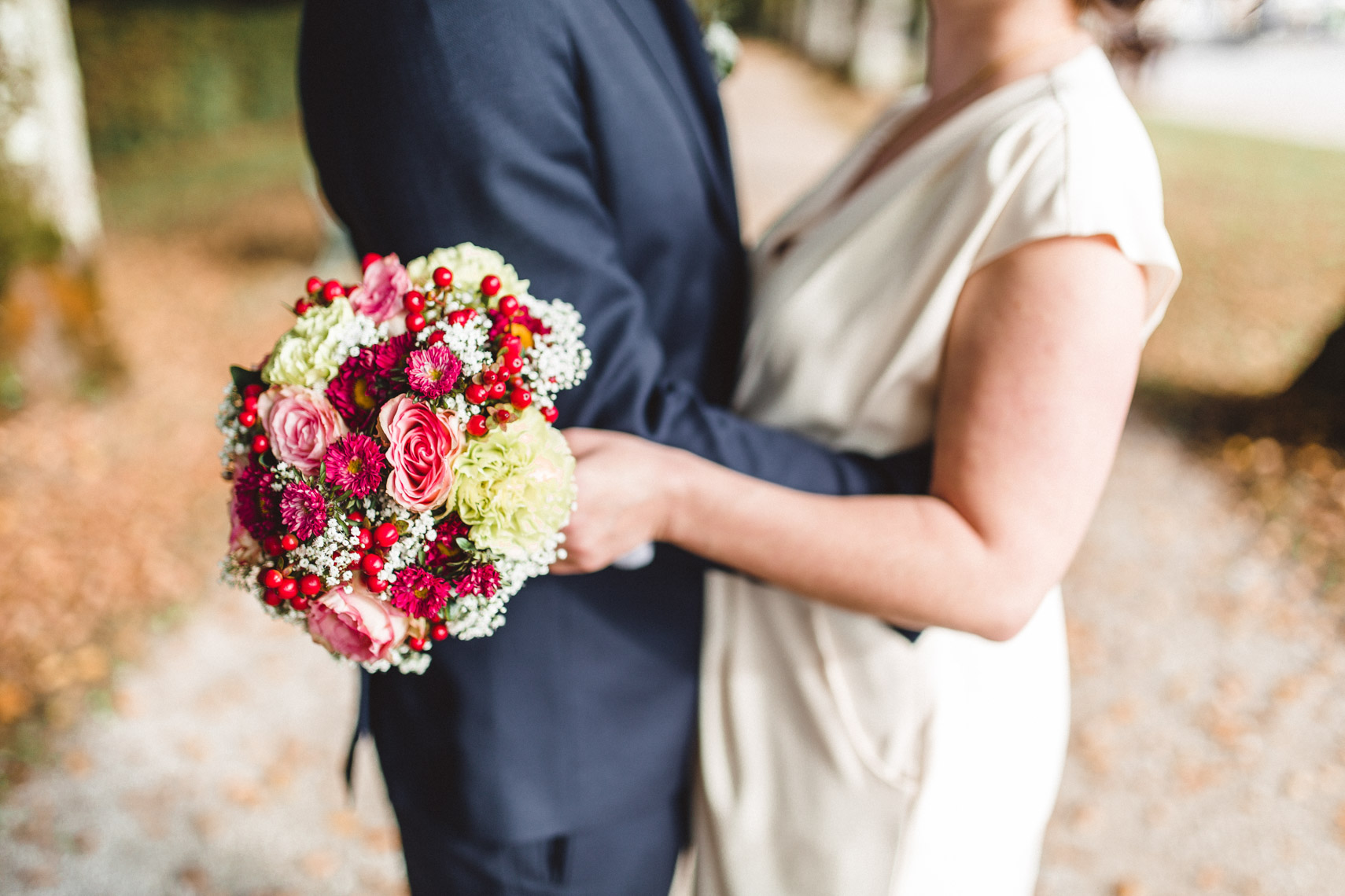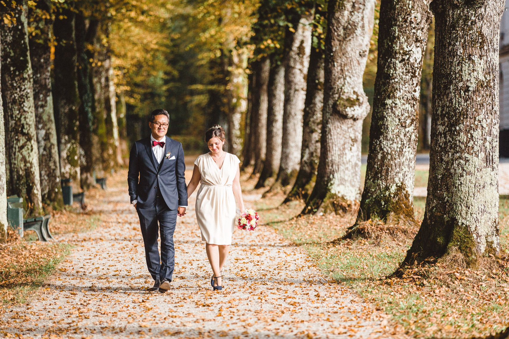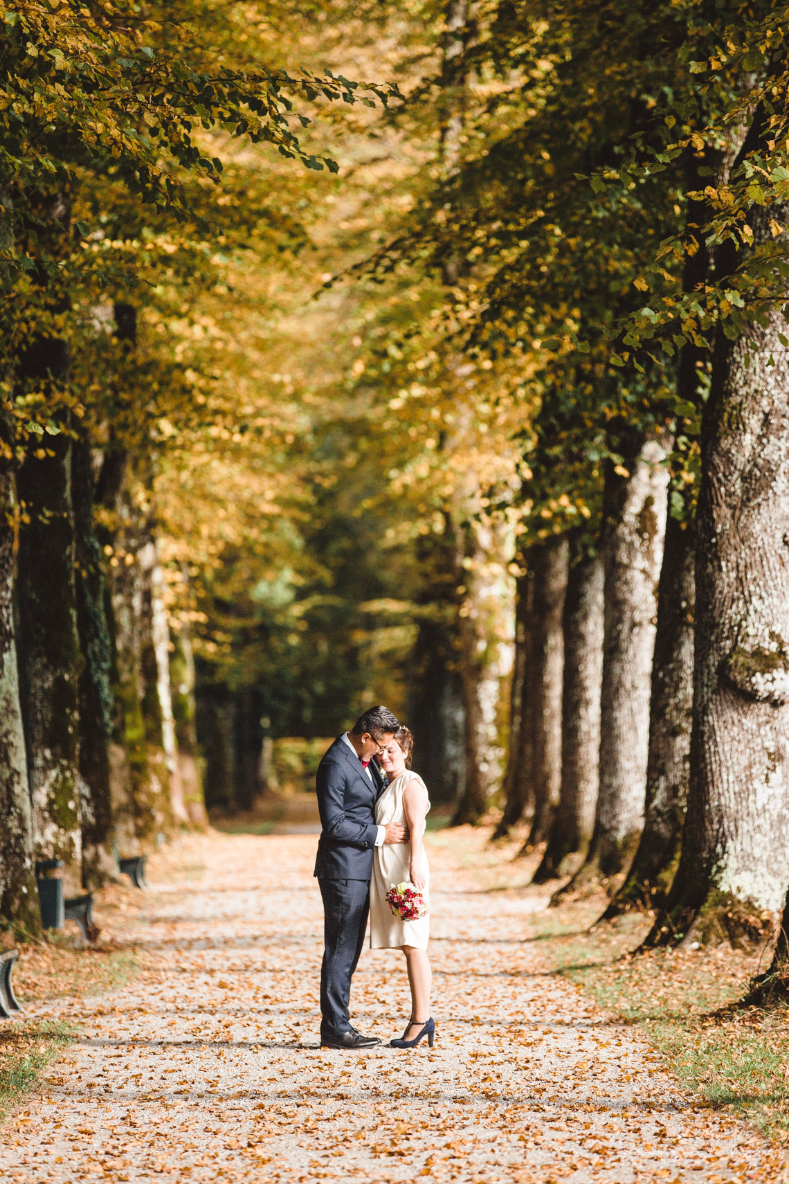 Die Ruhe die um euch und eure Gäste lag, die goldene Sonne die beim Rückweg durch die Bäume funkelte, die bunten Blätter die sich um euch legten während wir das Shooting machten. All diese Dinge, die man mit mit keinem Geld der Welt bezahlen könnte, wurden euch von der Natur geschenkt und haben damit eure Hochzeit zu einem einmalig schönen Tag gemacht.