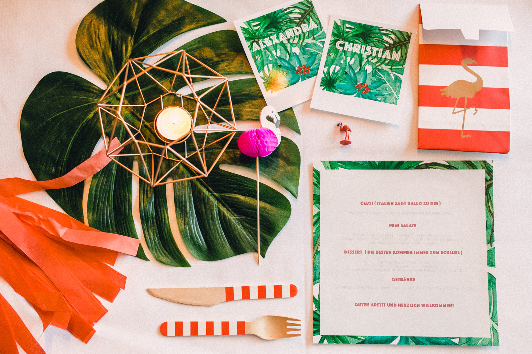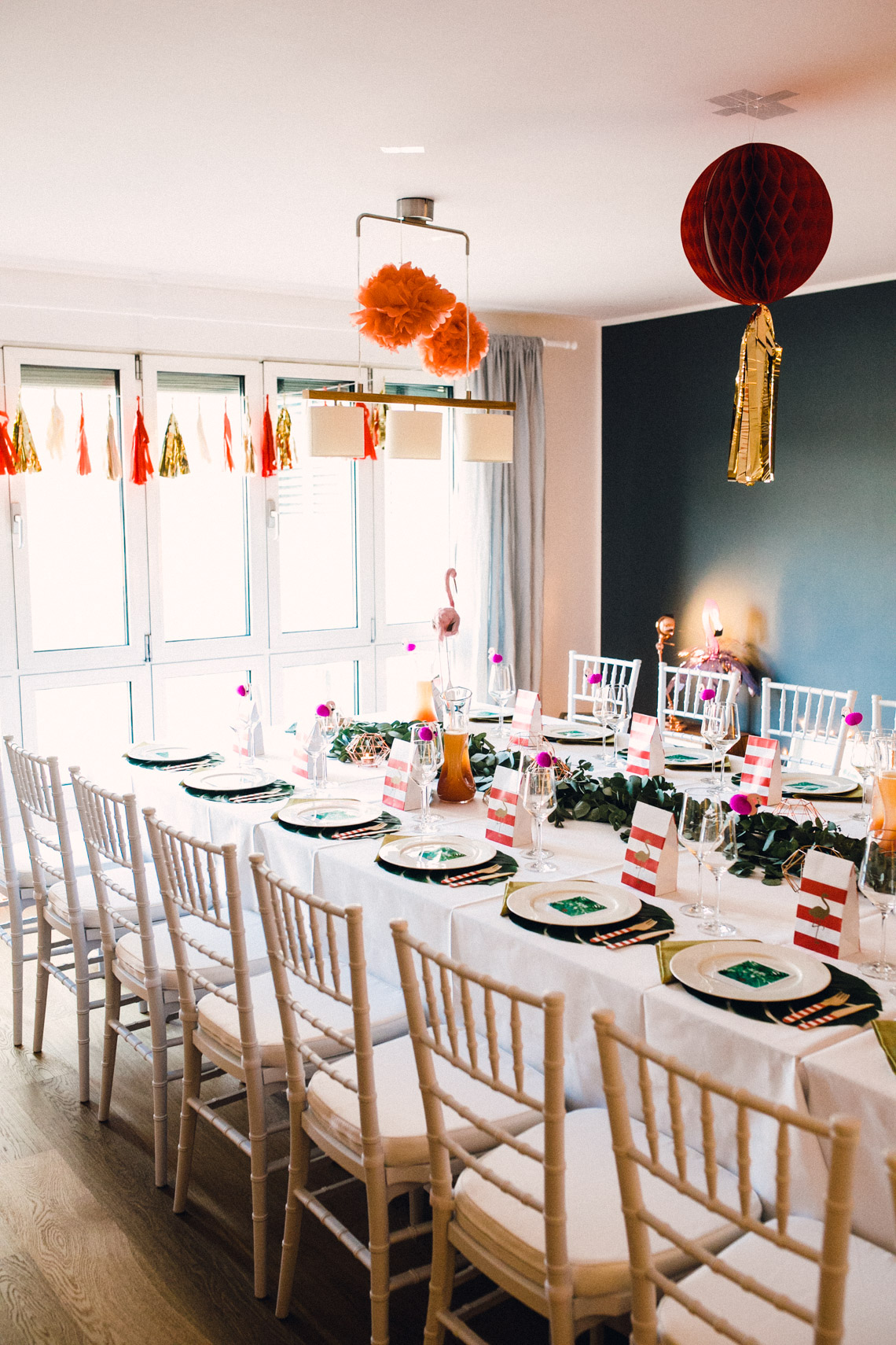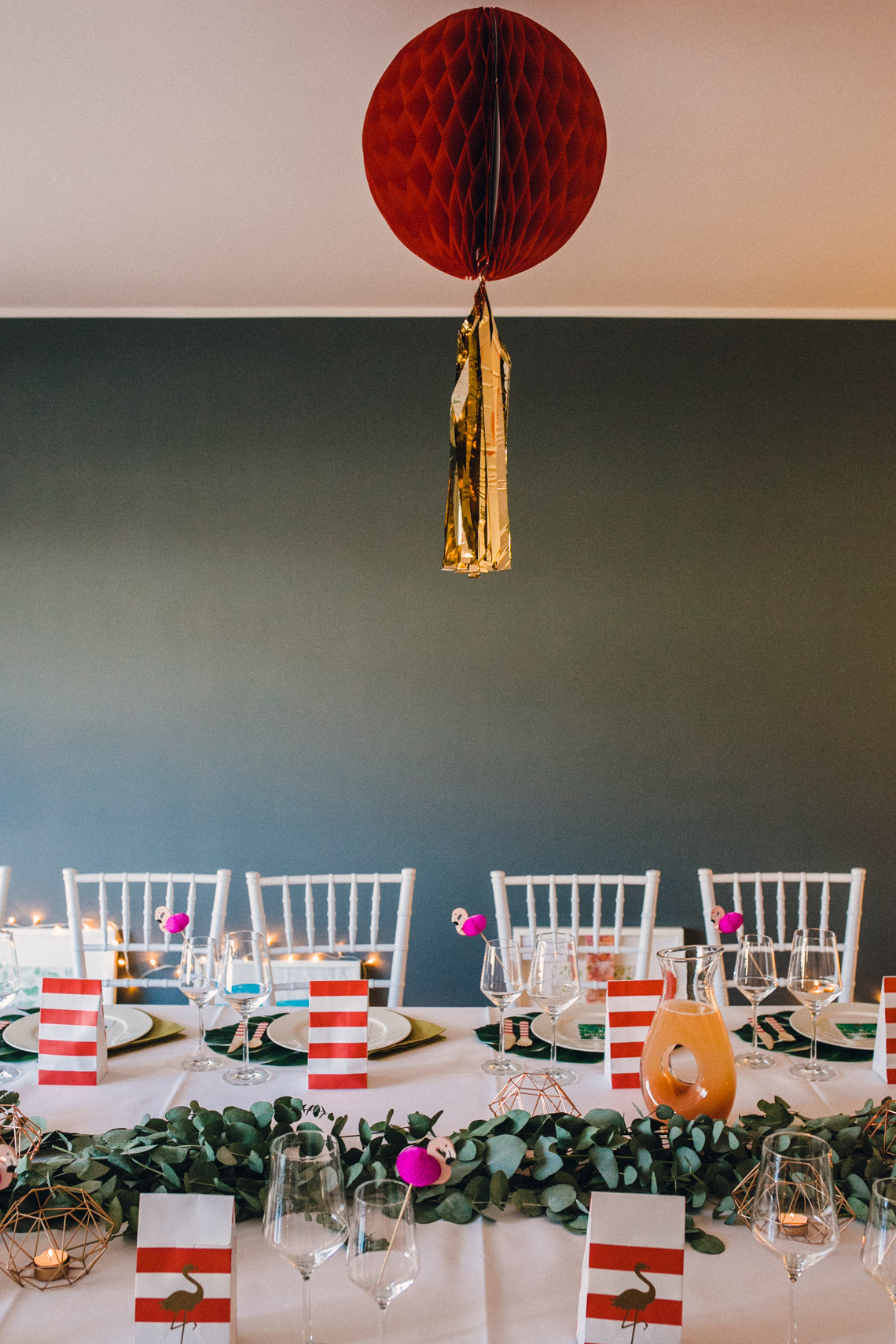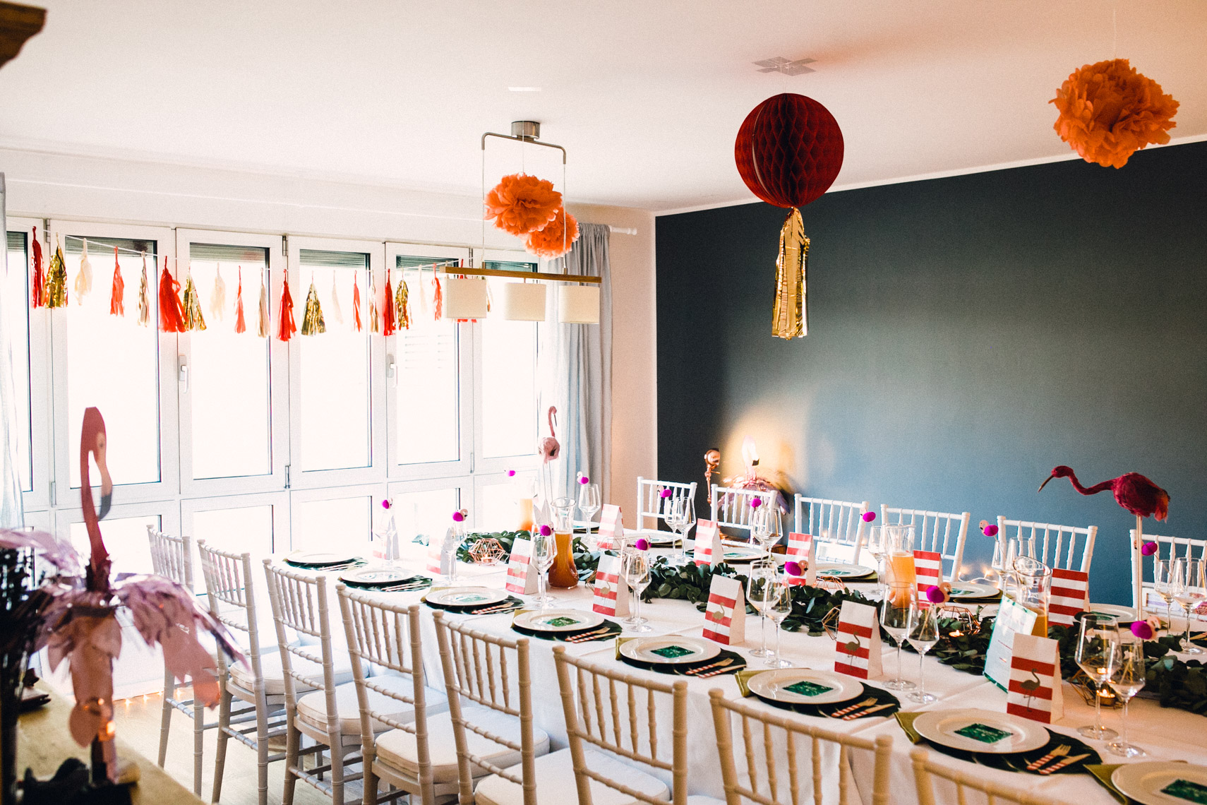 Mit 6 ausgeliehenen Tischen, 20 Stühlen, eine ganze Parade an Flamingos, Tellern, Gläsern, Karaffen, Palmenblättern und einem internationalen ( nicht veganen ) Buffet feierten wir das Leben, die Freundschaft und die Liebe.