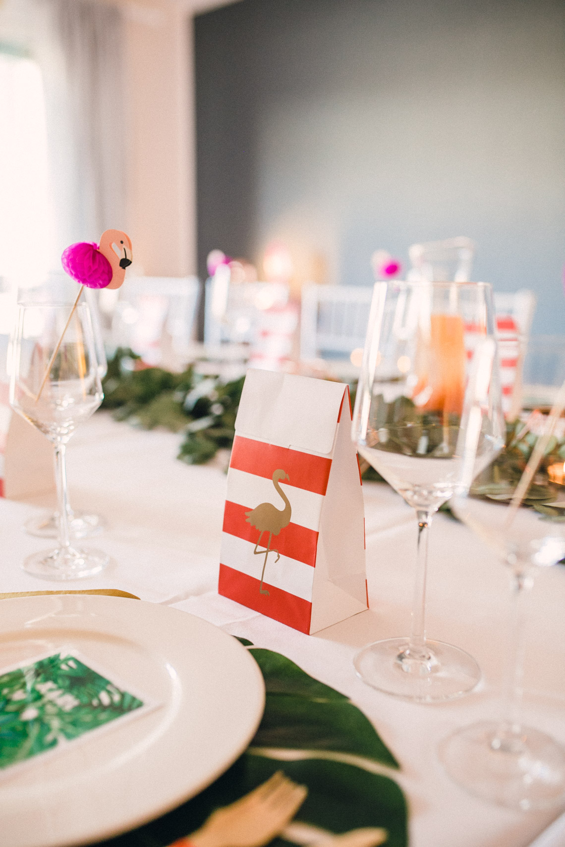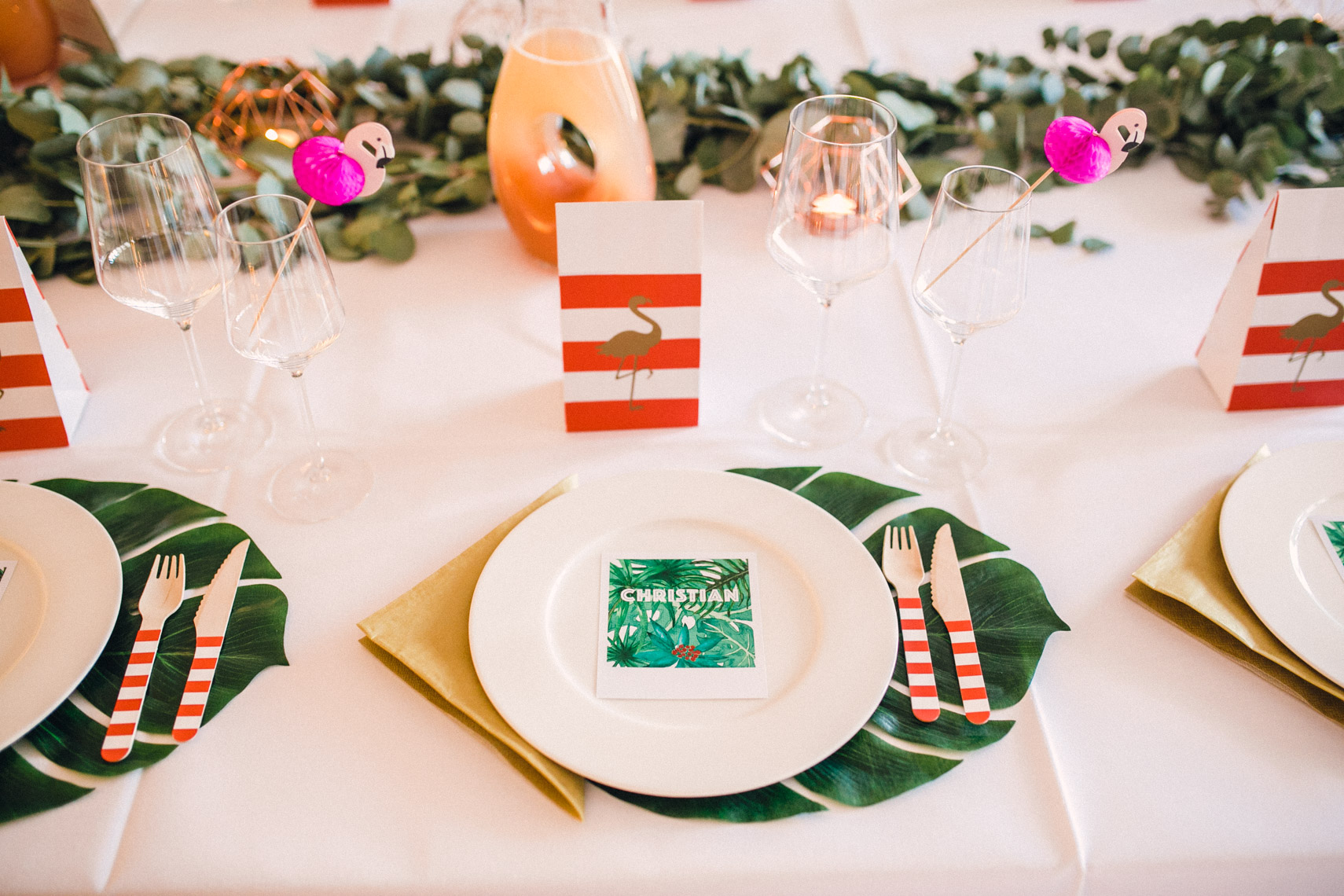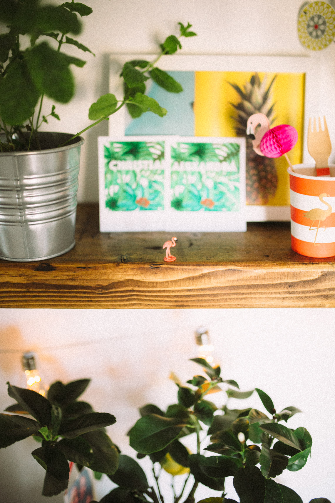 Mit 6 ausgeliehenen Tischen, 20 Stühlen, eine ganze Parade an Flamingos, Tellern, Gläsern, Karaffen, Palmenblättern und einem internationalen ( nicht veganen ) Buffet feierten wir das Leben, die Freundschaft und die Liebe.