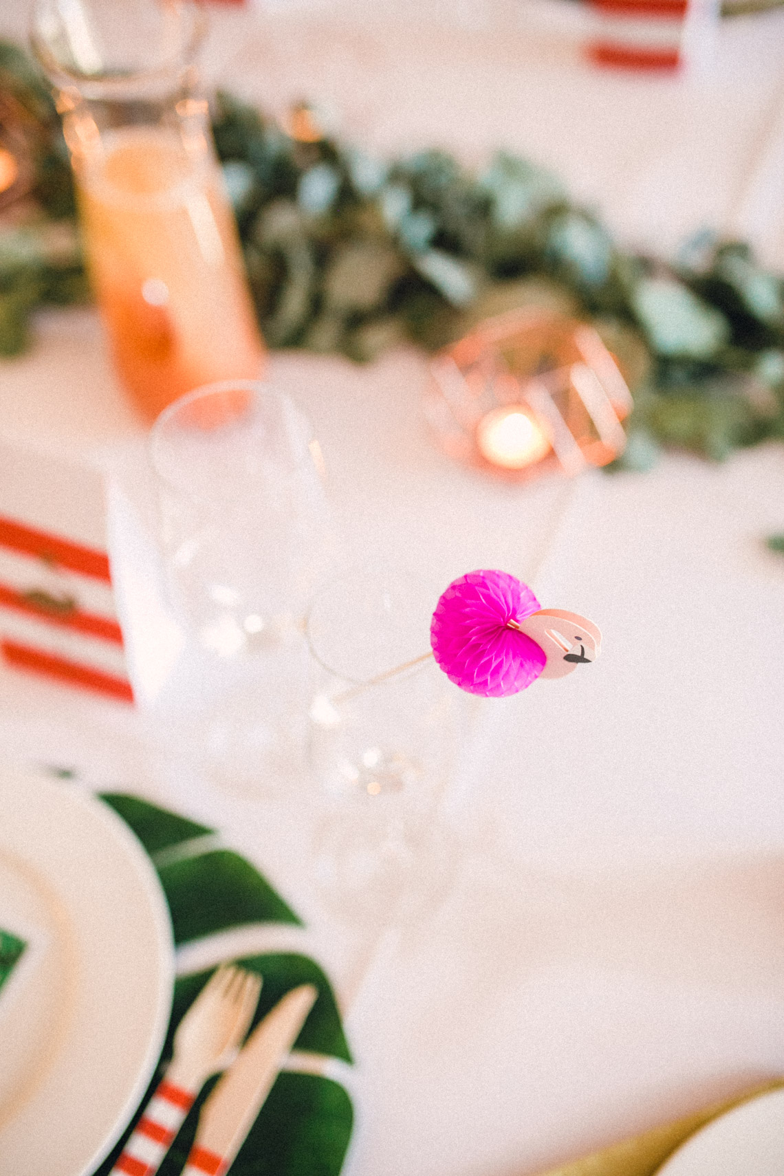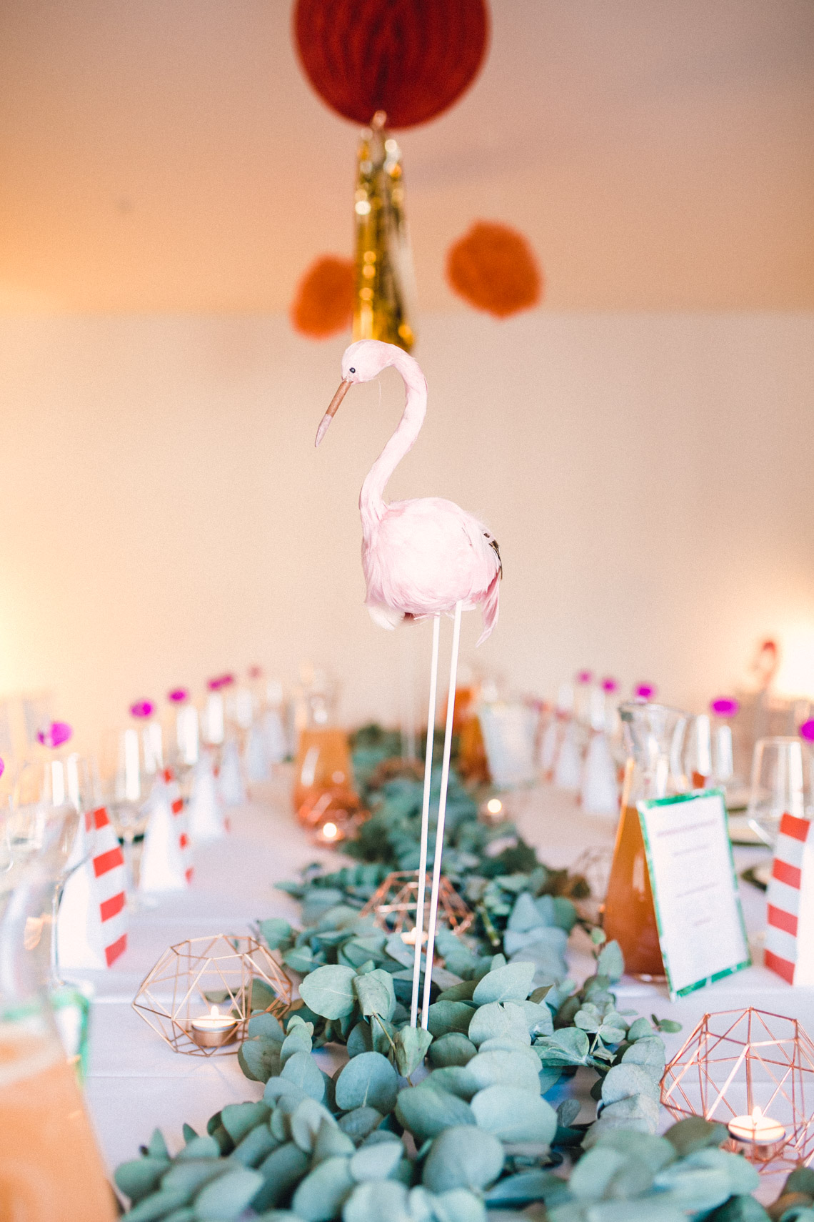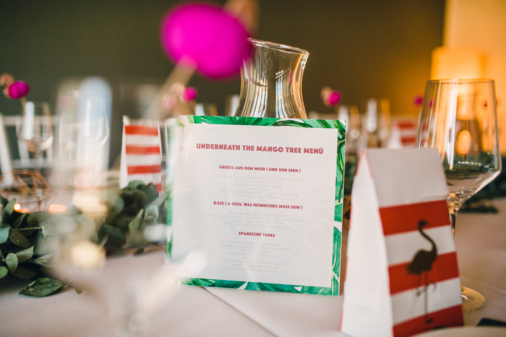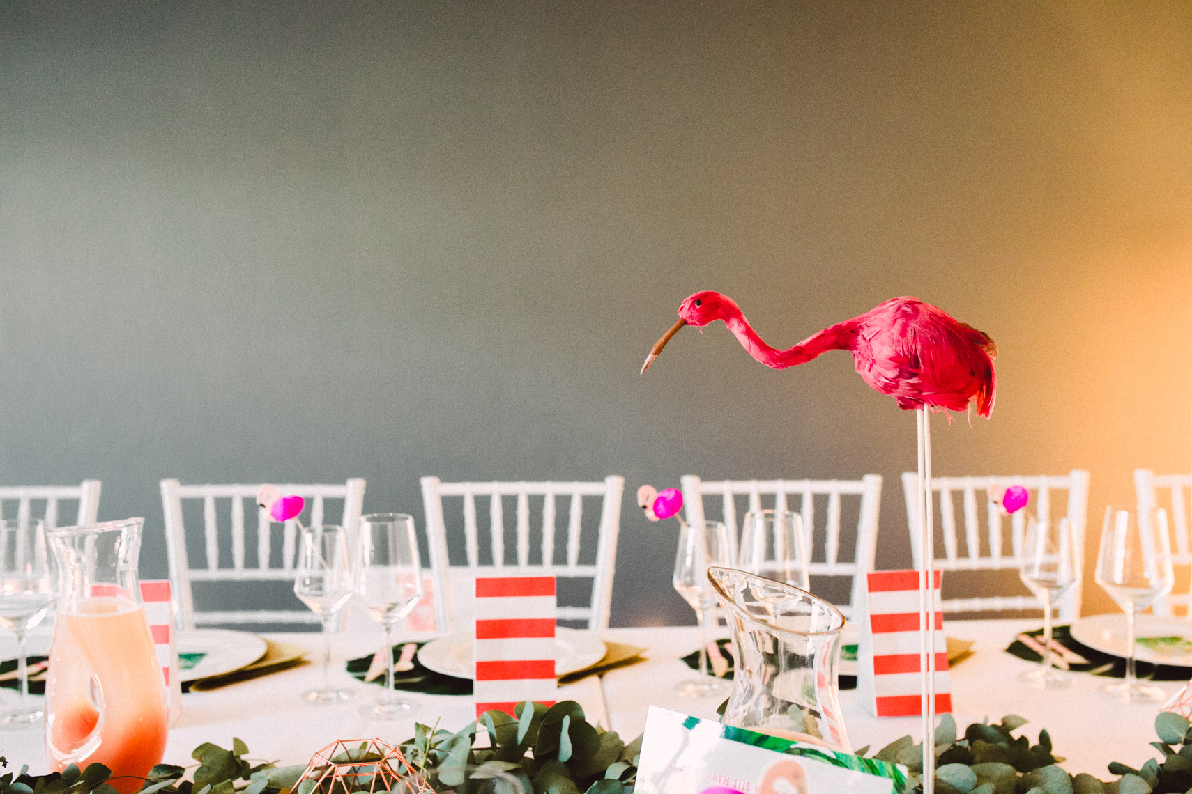 Mit 6 ausgeliehenen Tischen, 20 Stühlen, eine ganze Parade an Flamingos, Tellern, Gläsern, Karaffen, Palmenblättern und einem internationalen ( nicht veganen ) Buffet feierten wir das Leben, die Freundschaft und die Liebe.